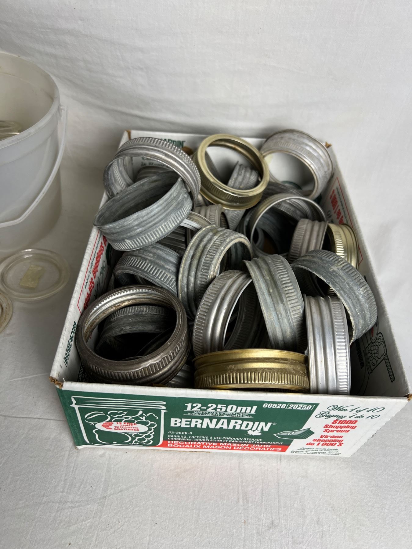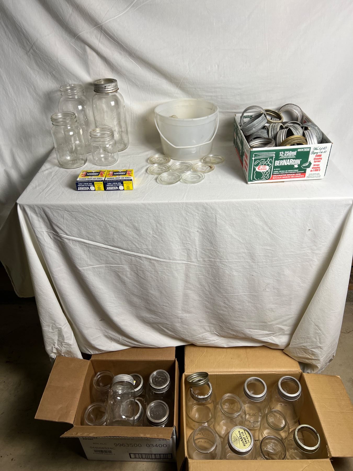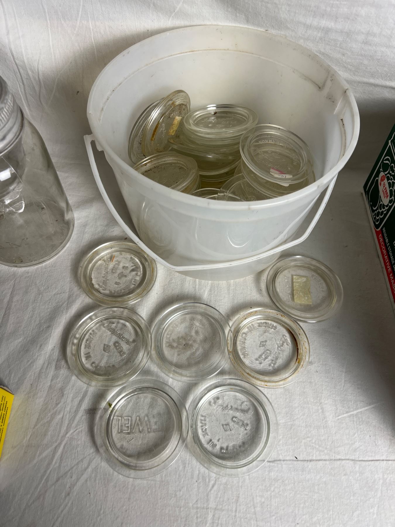 Variety of different jar sizes and lids. Includes pail of glass lids.