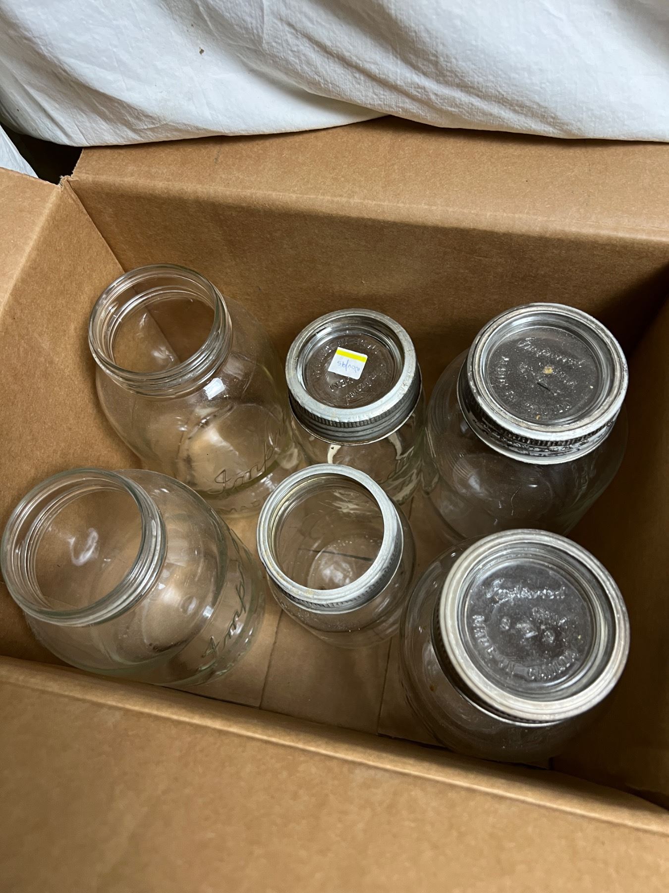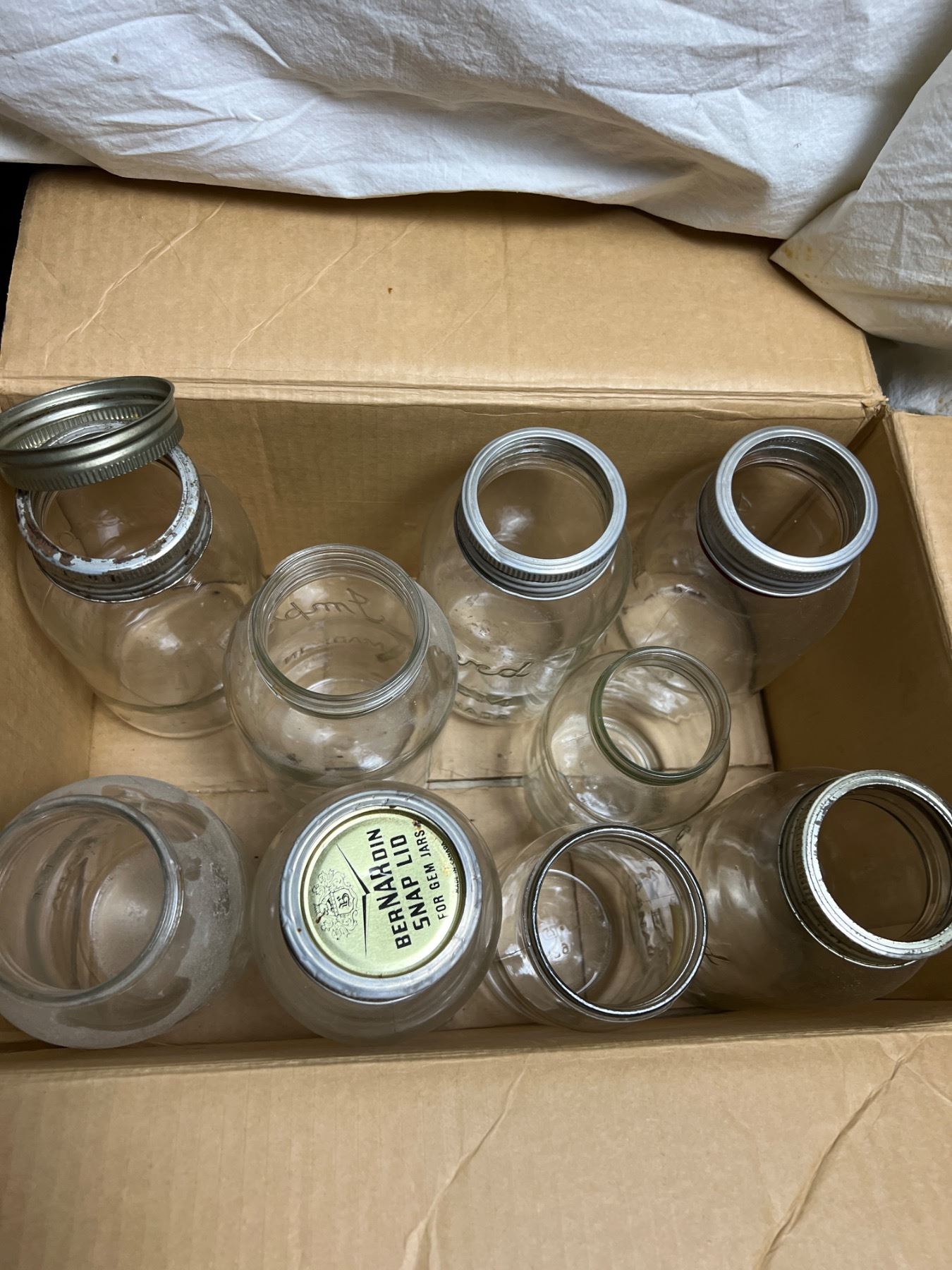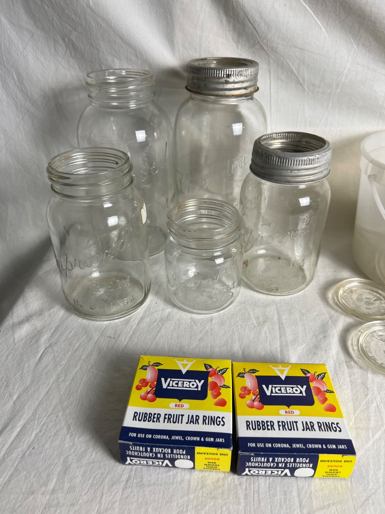 Variety of different jar sizes and lids. Includes pail of glass lids.
