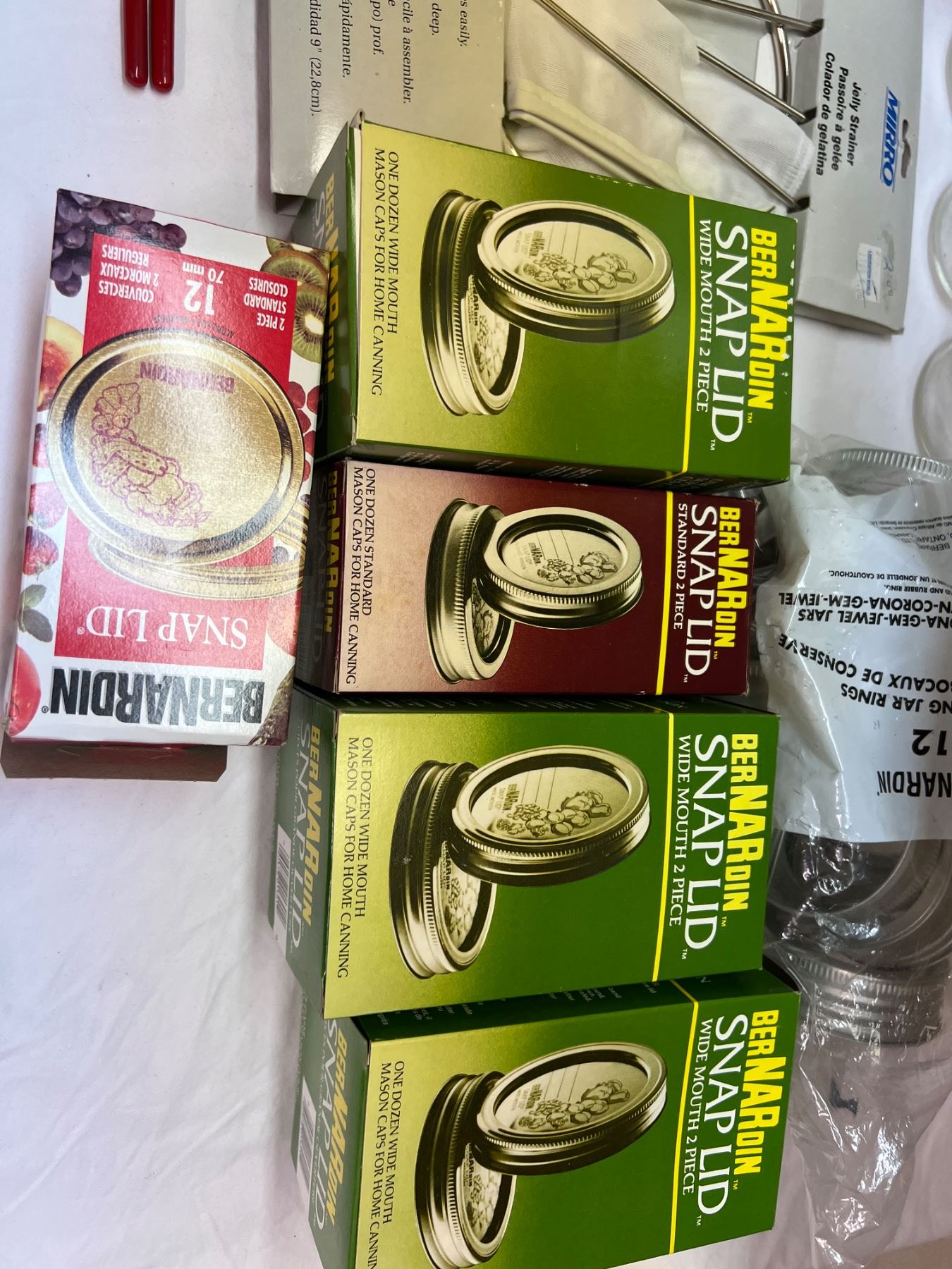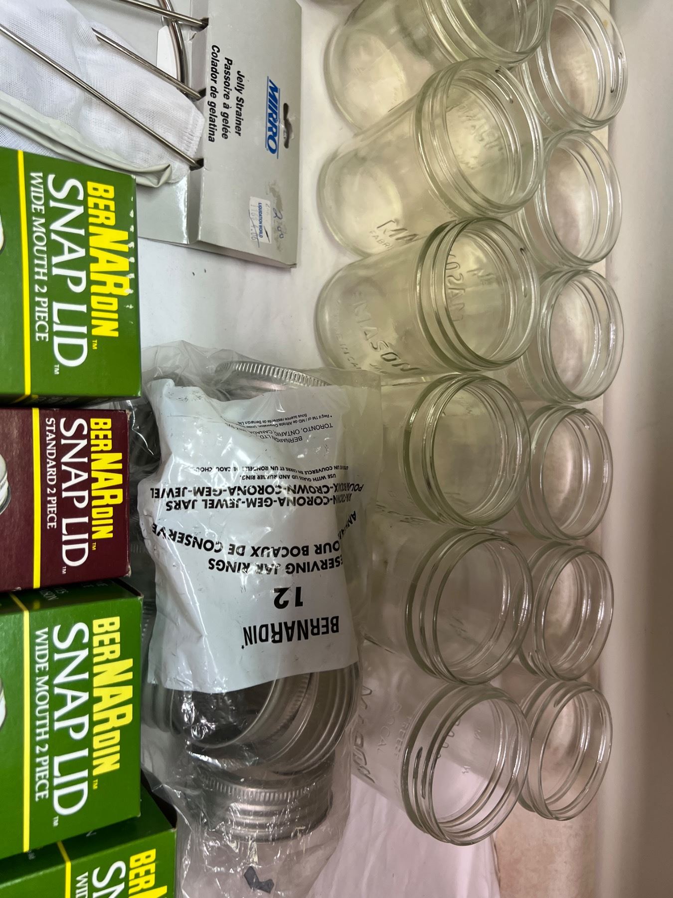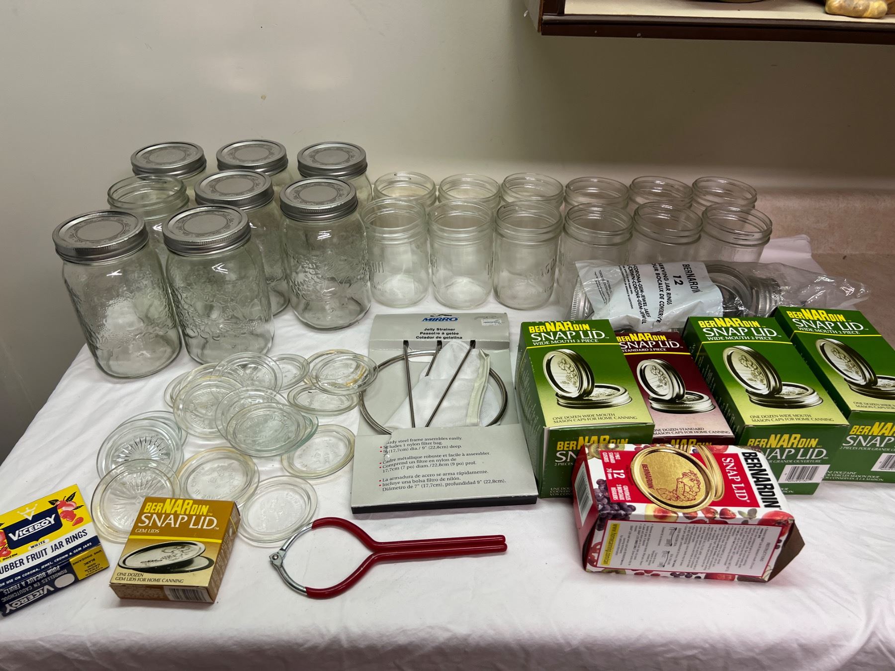 Includes a variety of jars, snap lids and rings, tongs, jelly strainer, and more