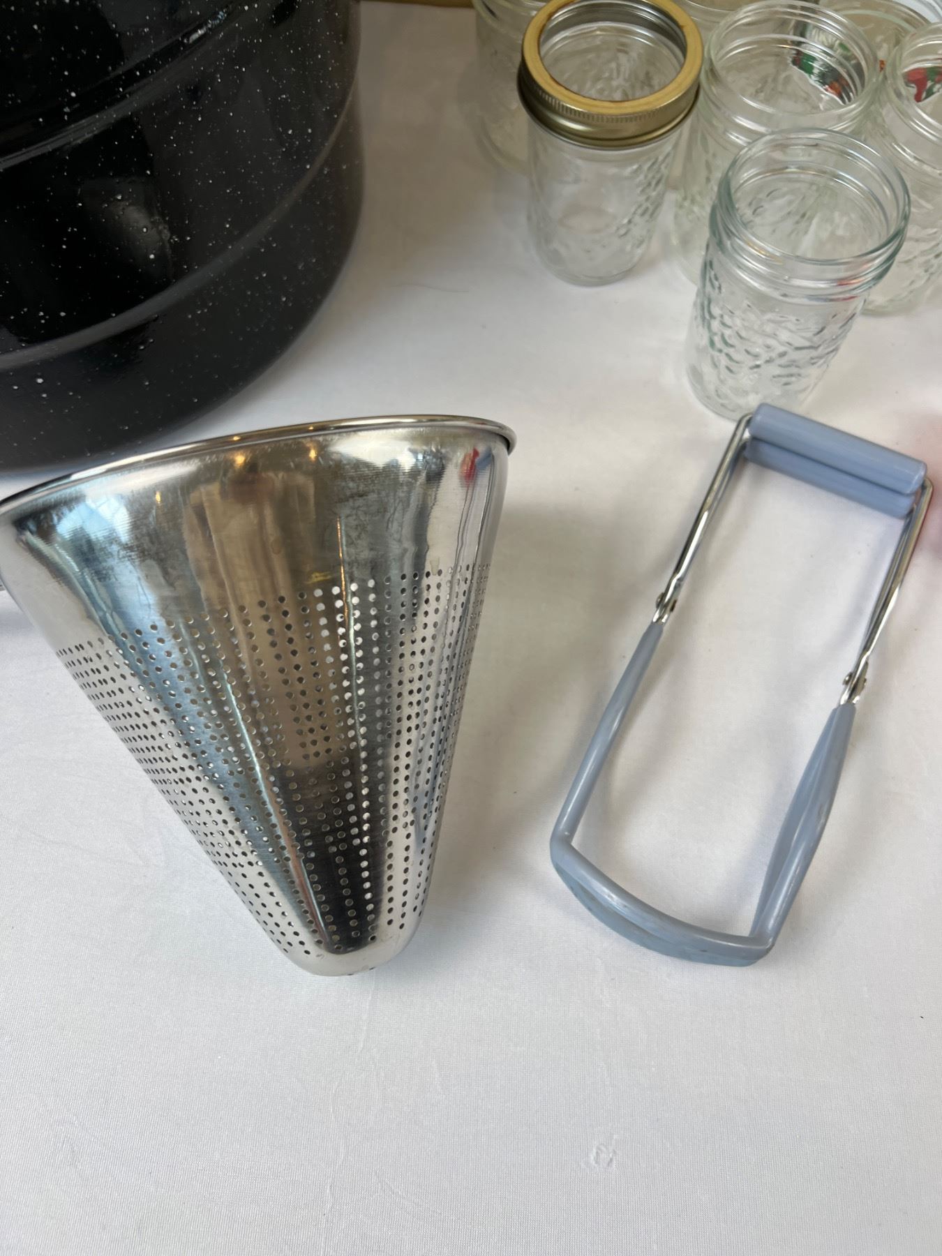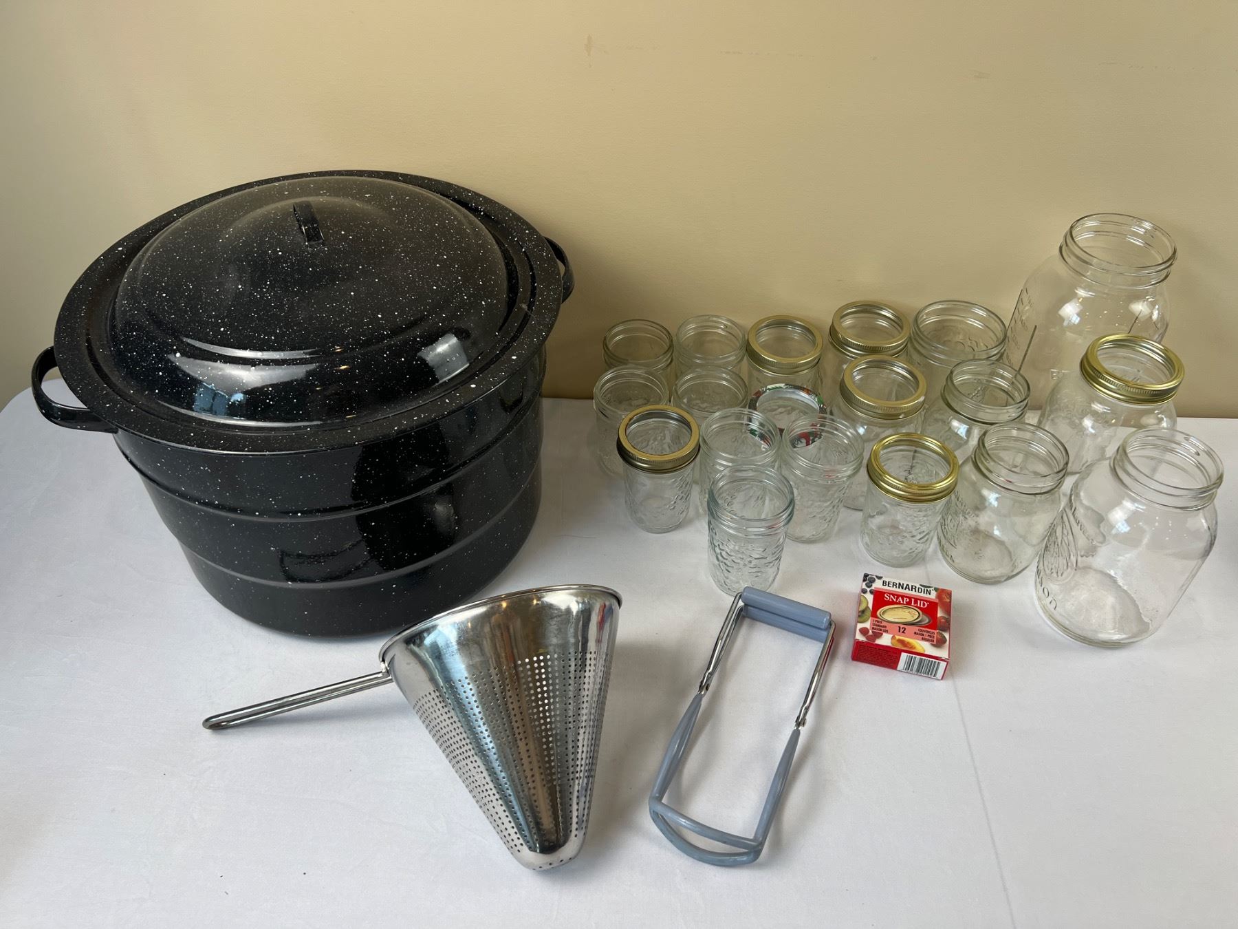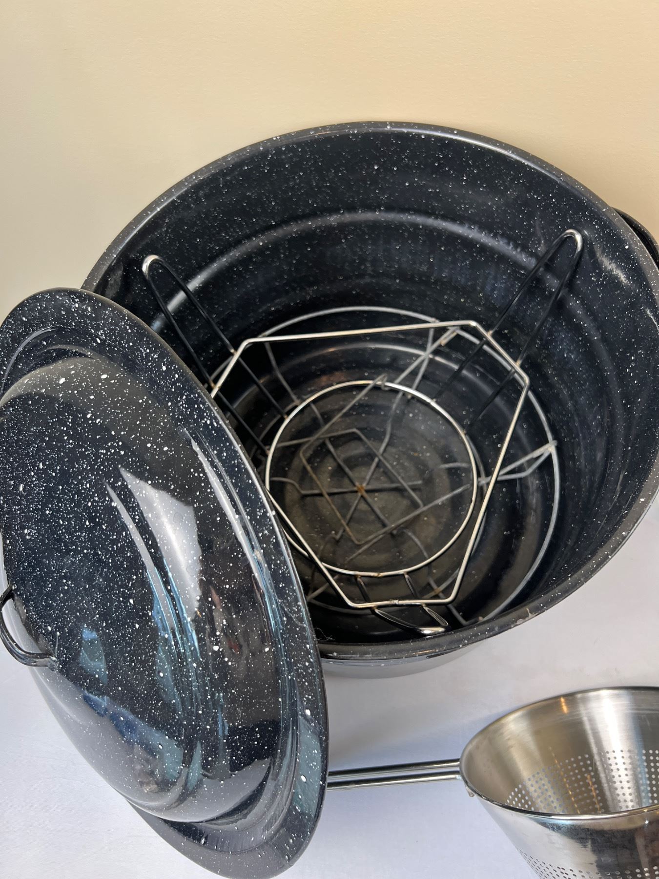 The graniteware pot is 14"diameter x 13"H