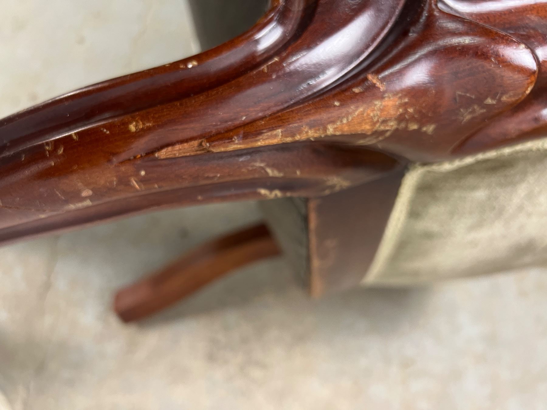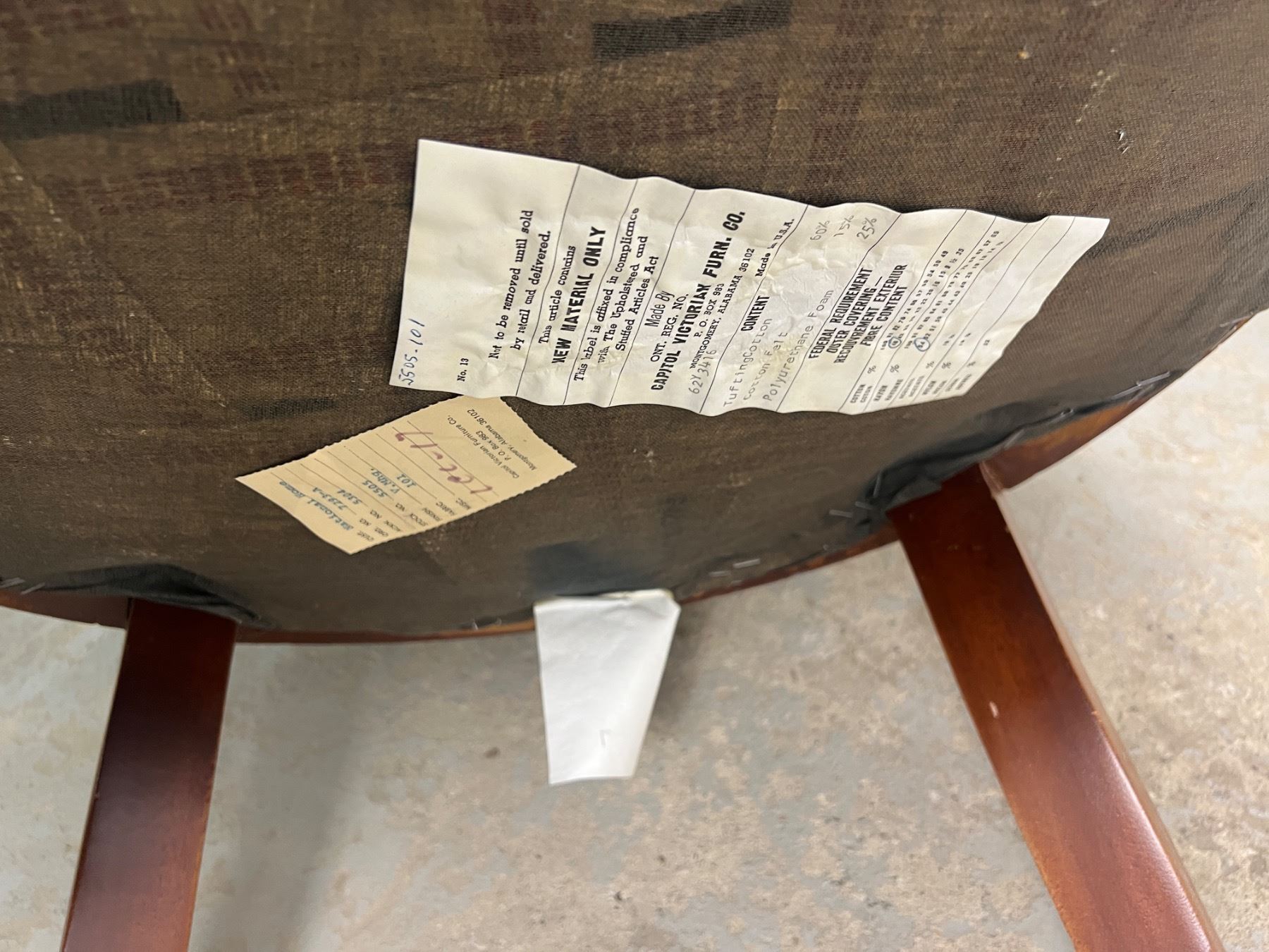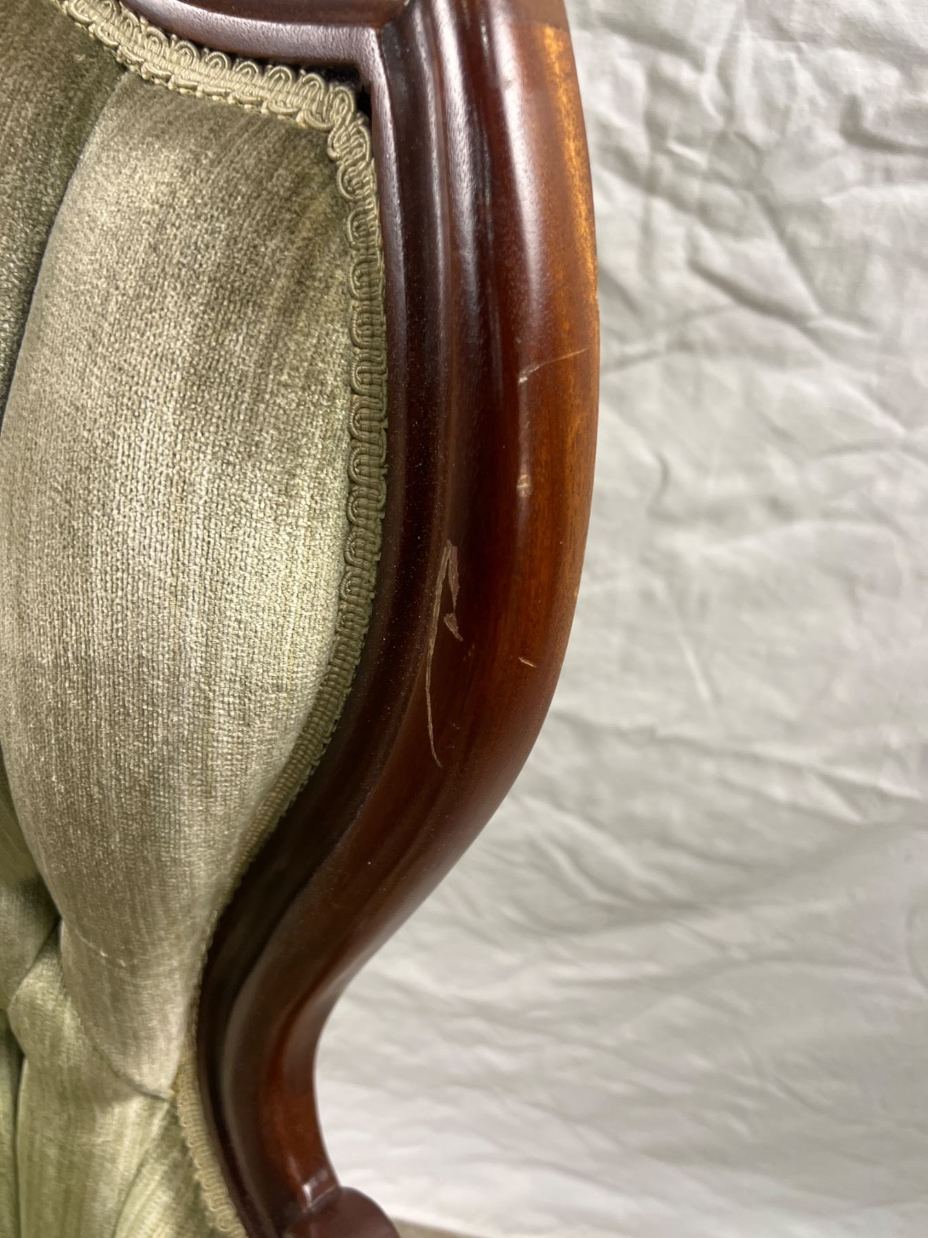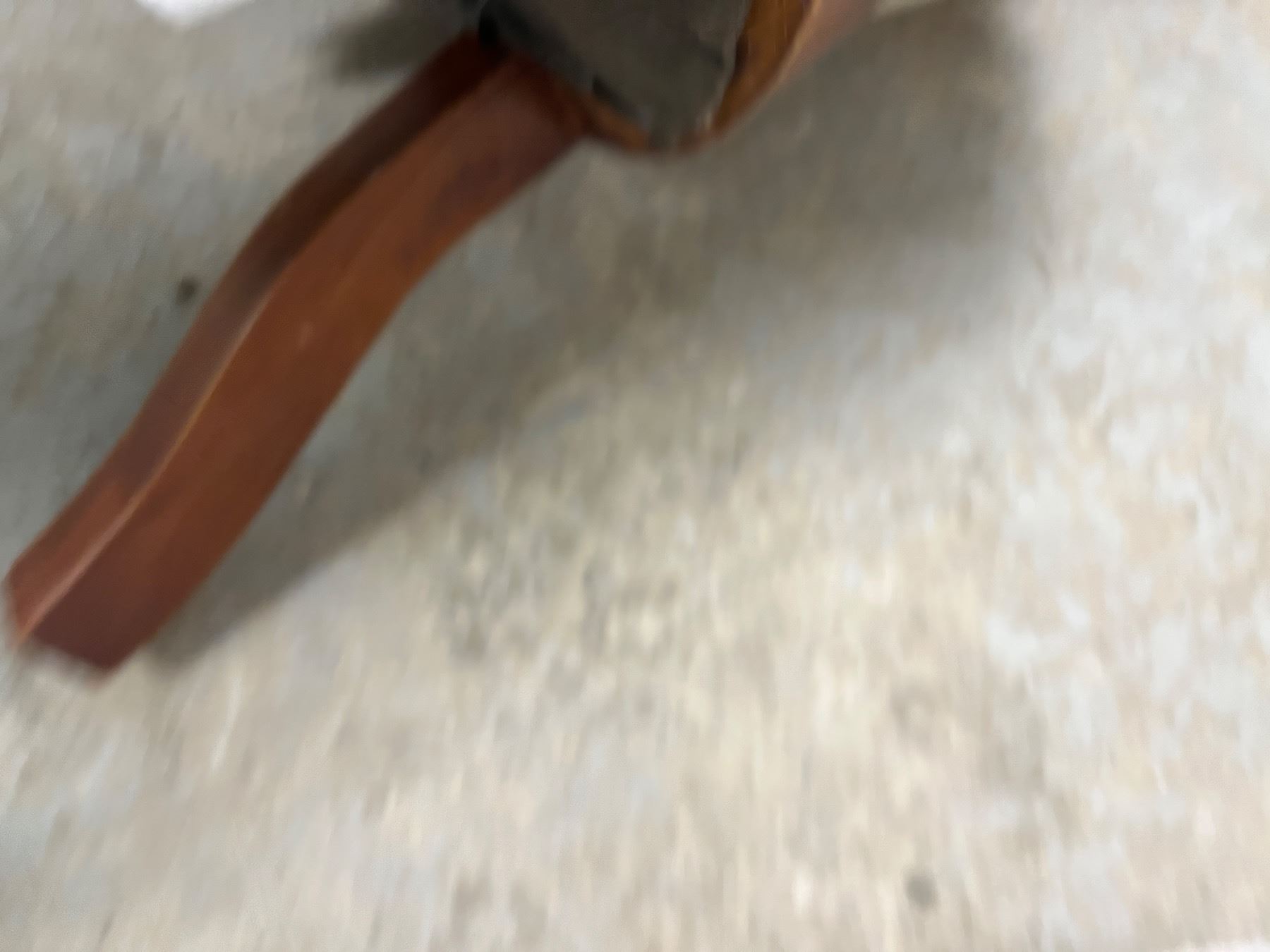Has some scuffs on the chair legs and wooden frame, seat cushion upholstery has wear spots, 45"H x 24"W x 24"D