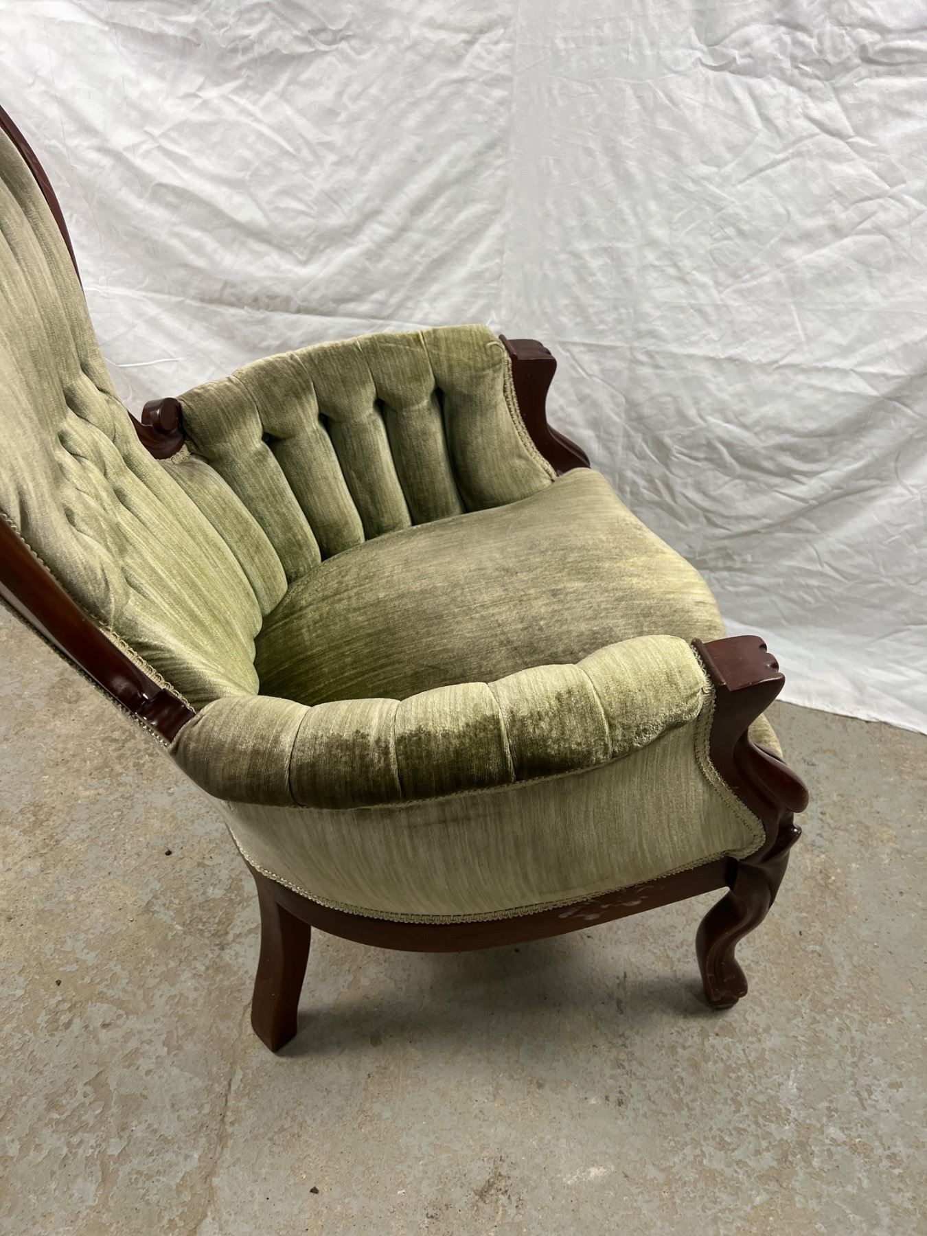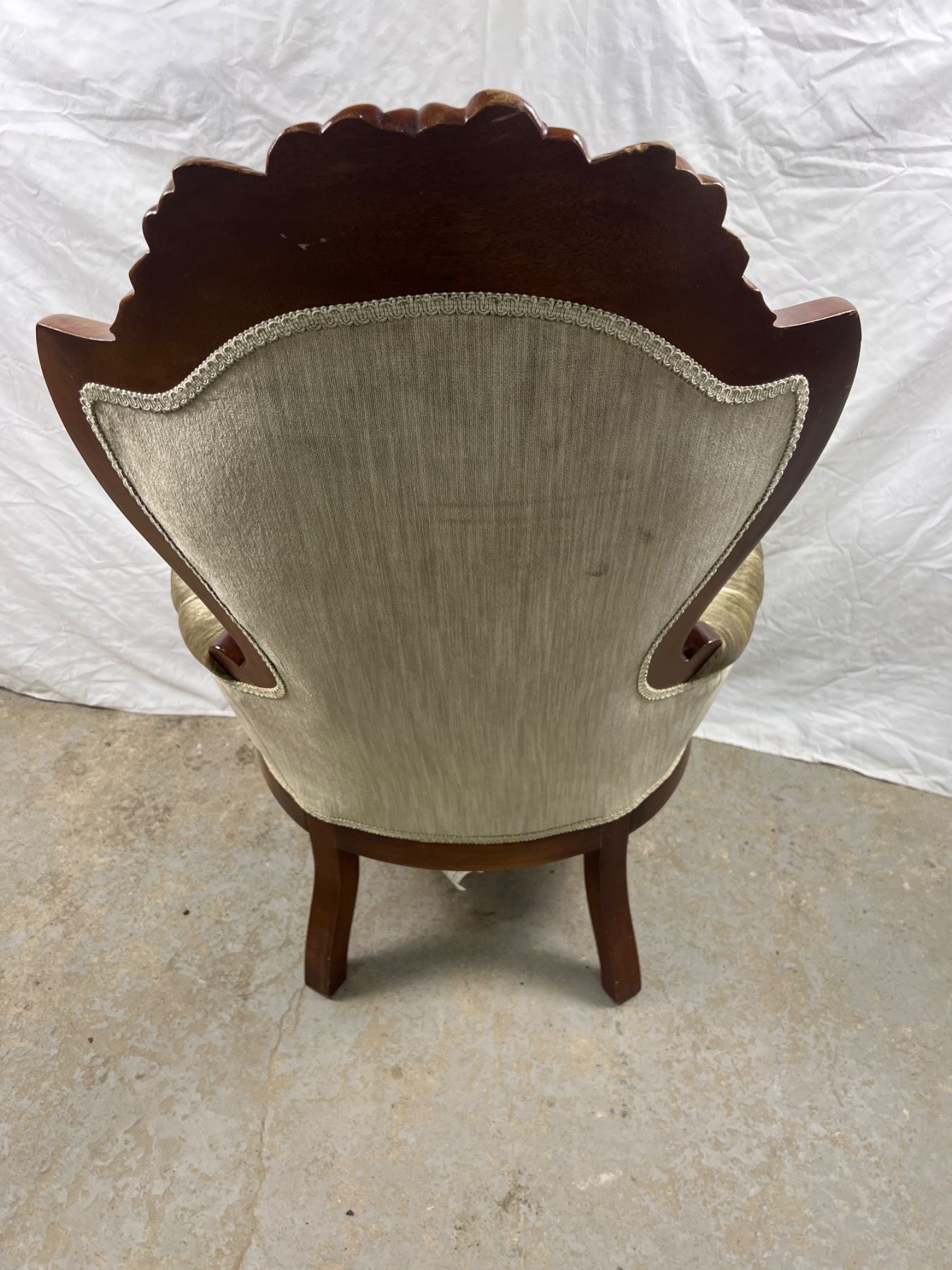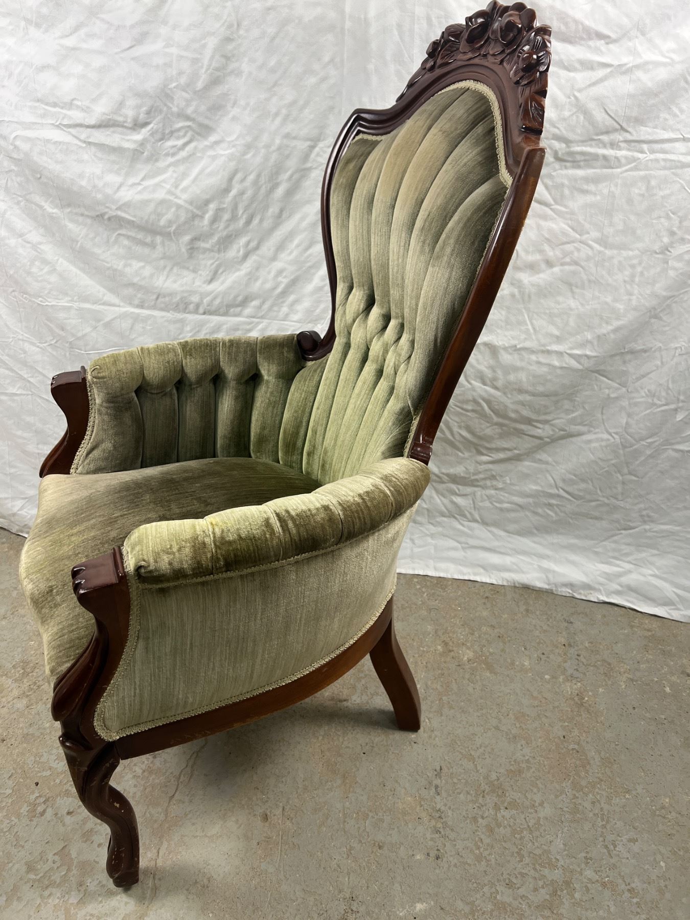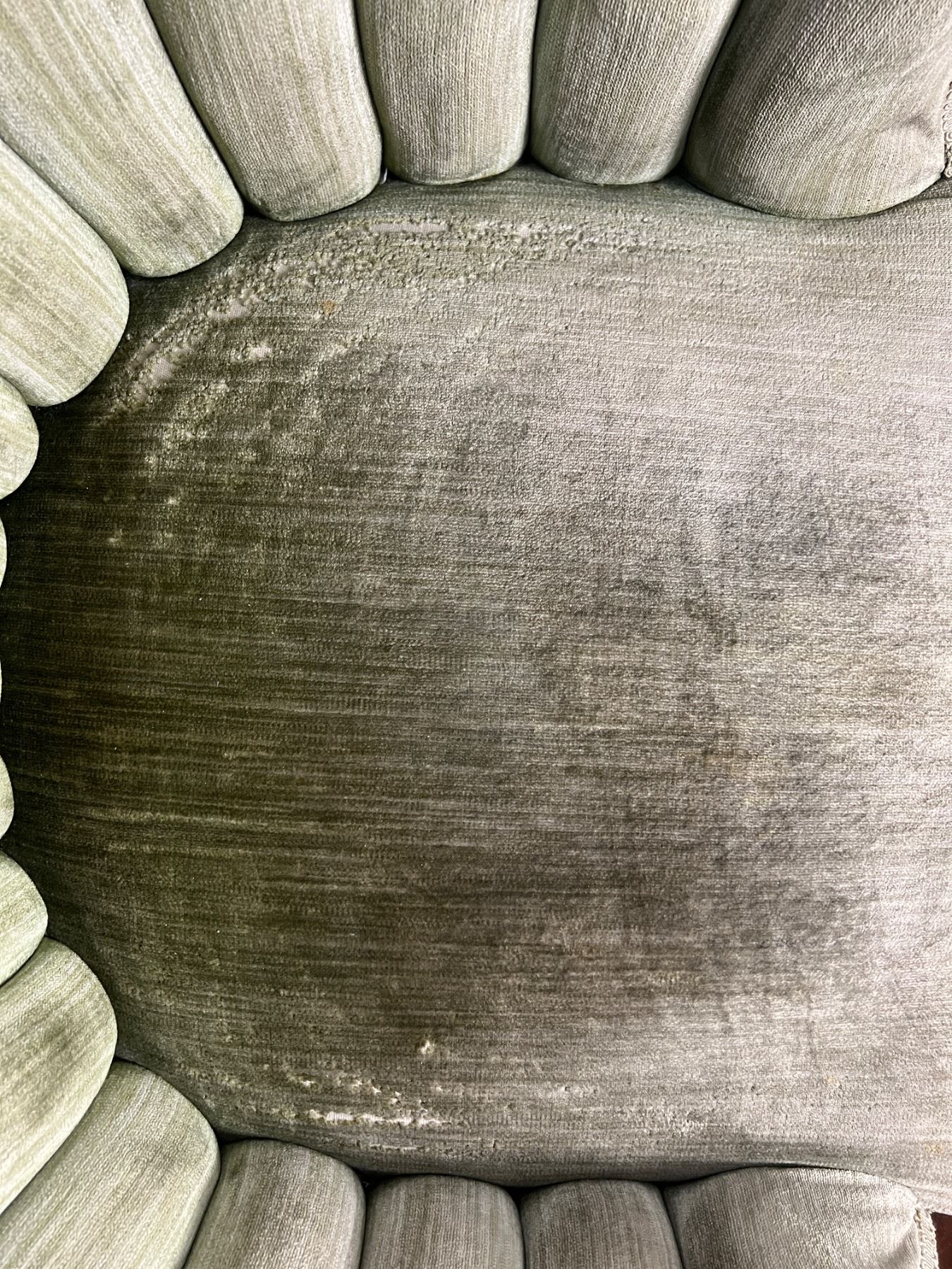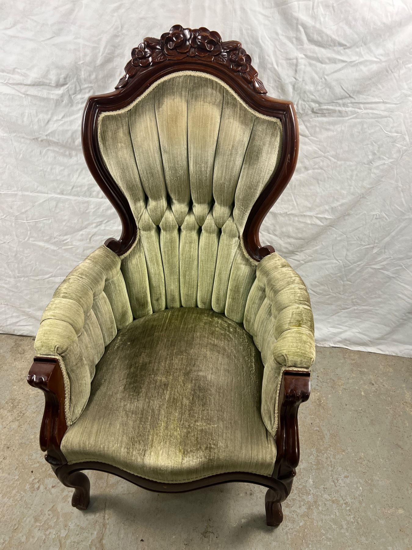 Has some scuffs on the chair legs and wooden frame, seat cushion upholstery has wear spots, 45"H x 24"W x 24"D