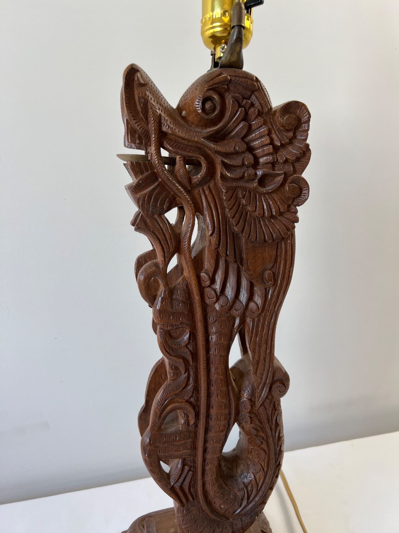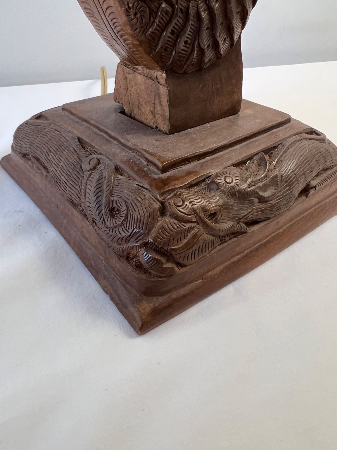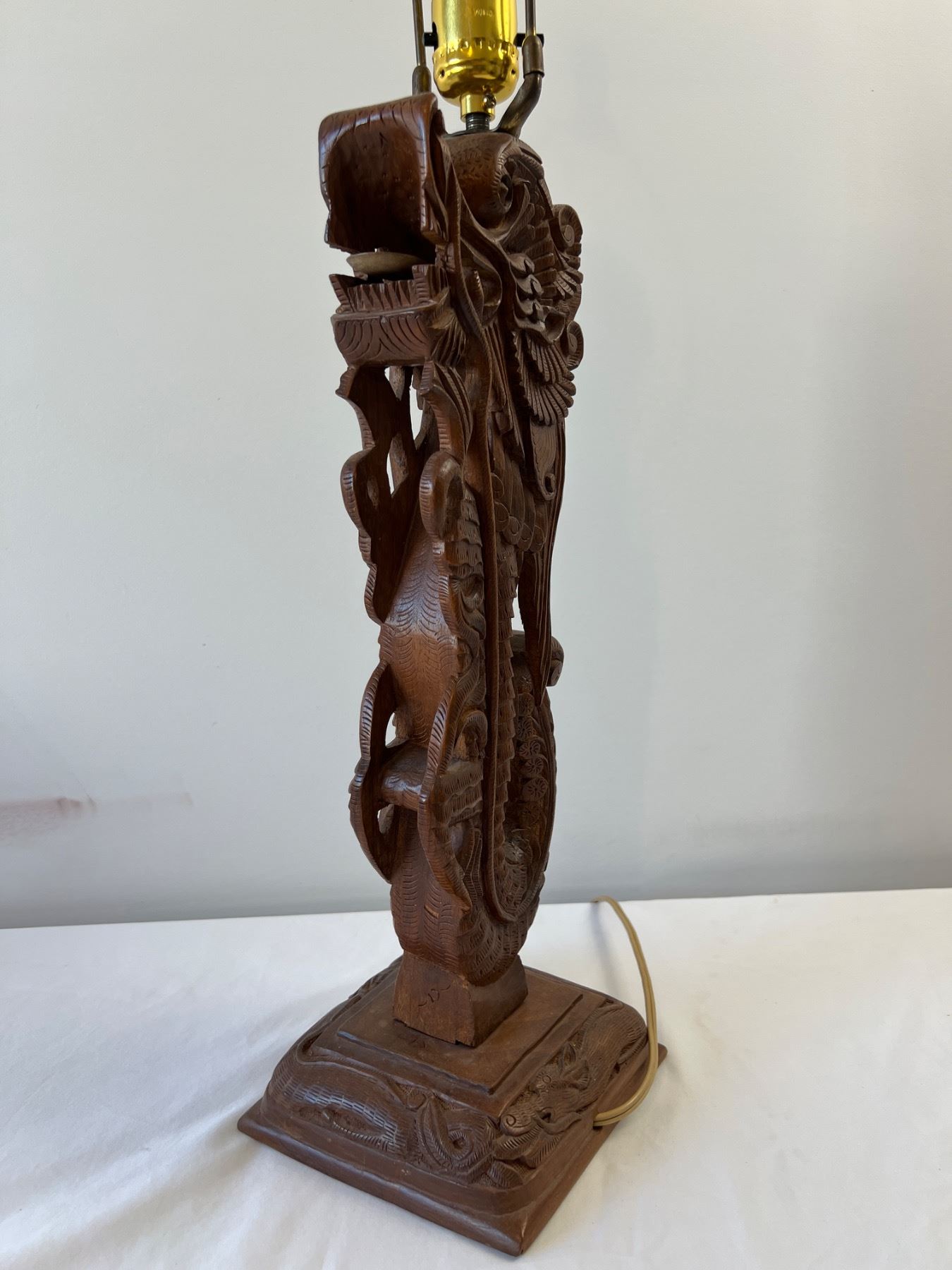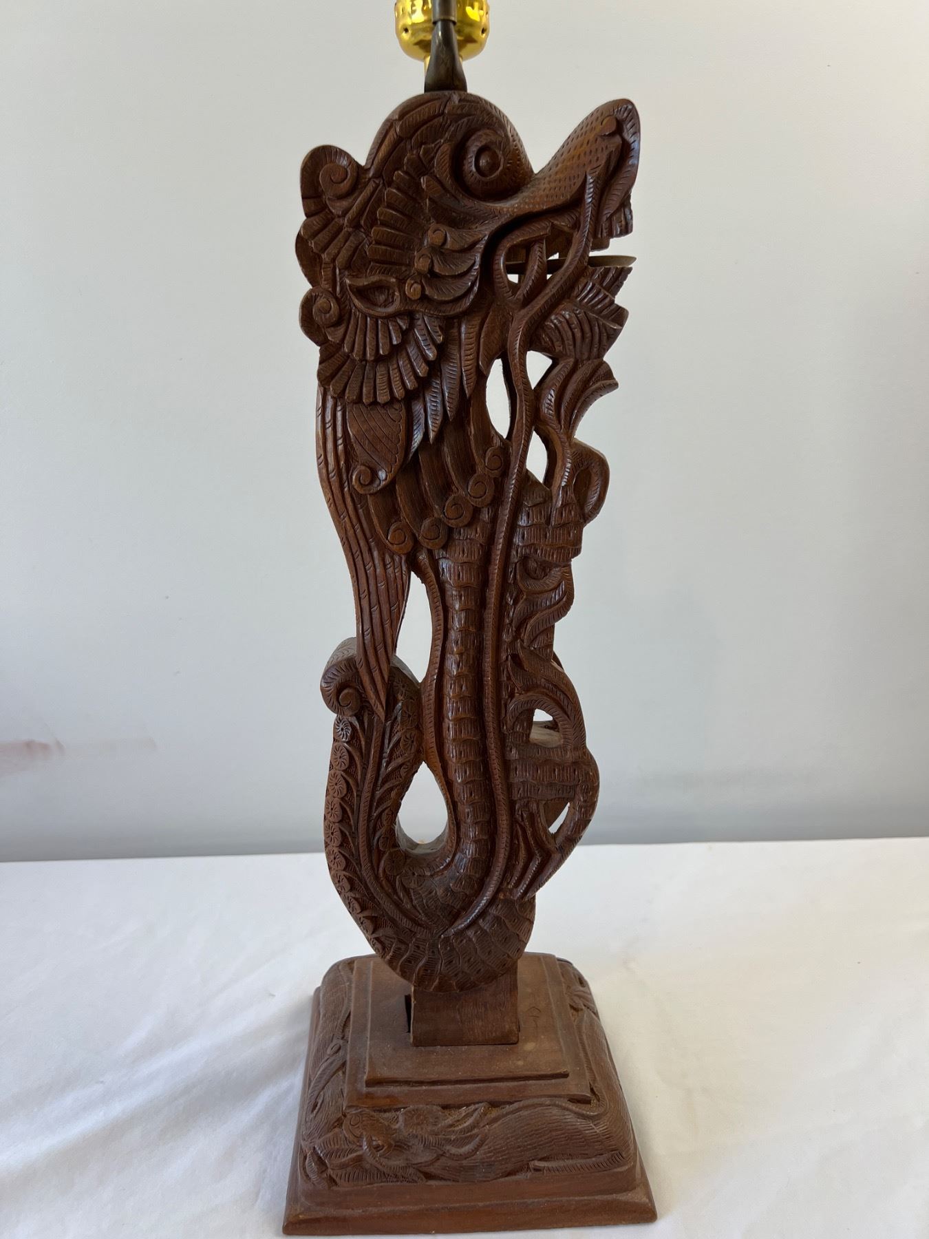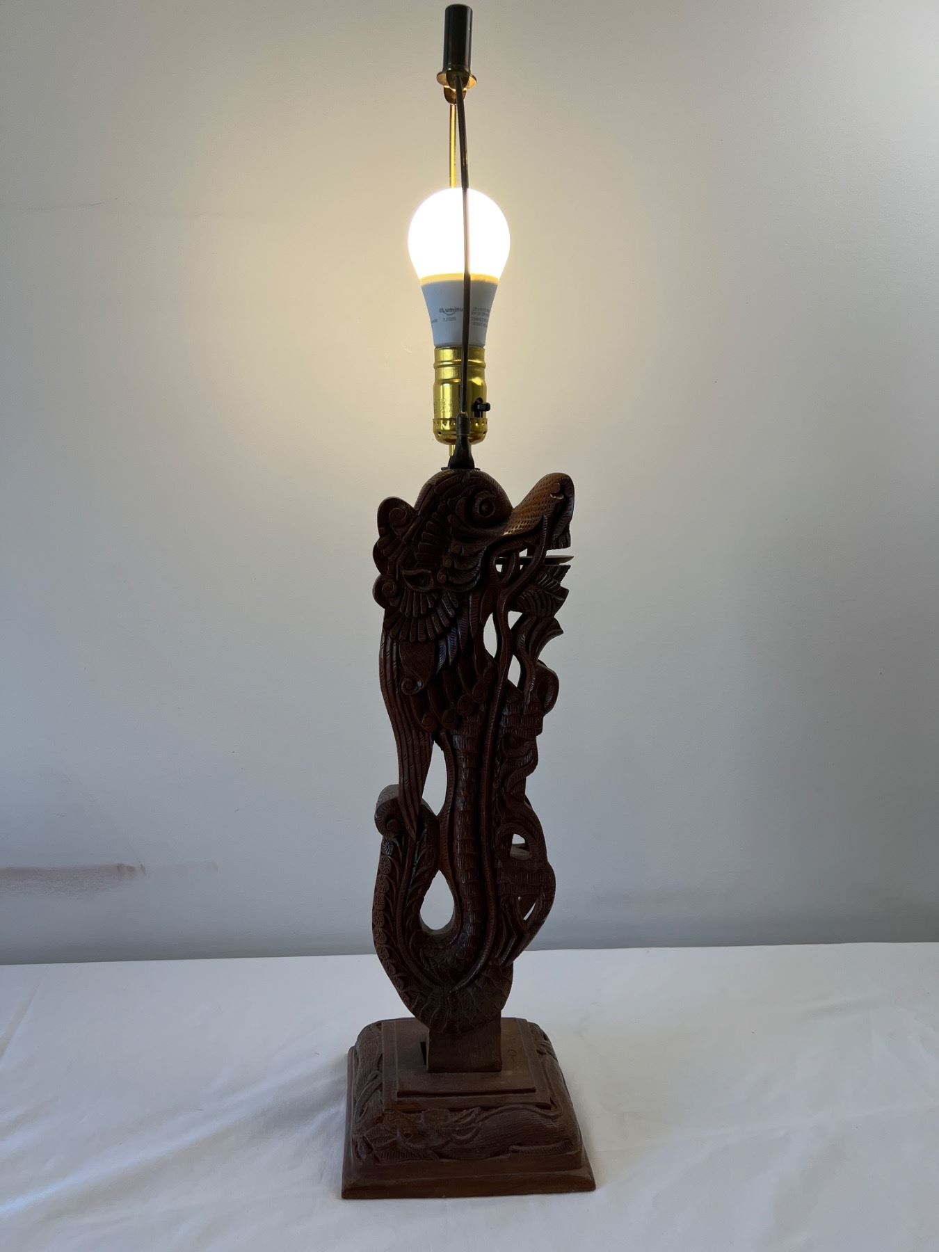 Does not include bulb, shown in images to show working condition. Measures 27.5" tall and base is 6.5" by 6.5" Small mark near one eye.