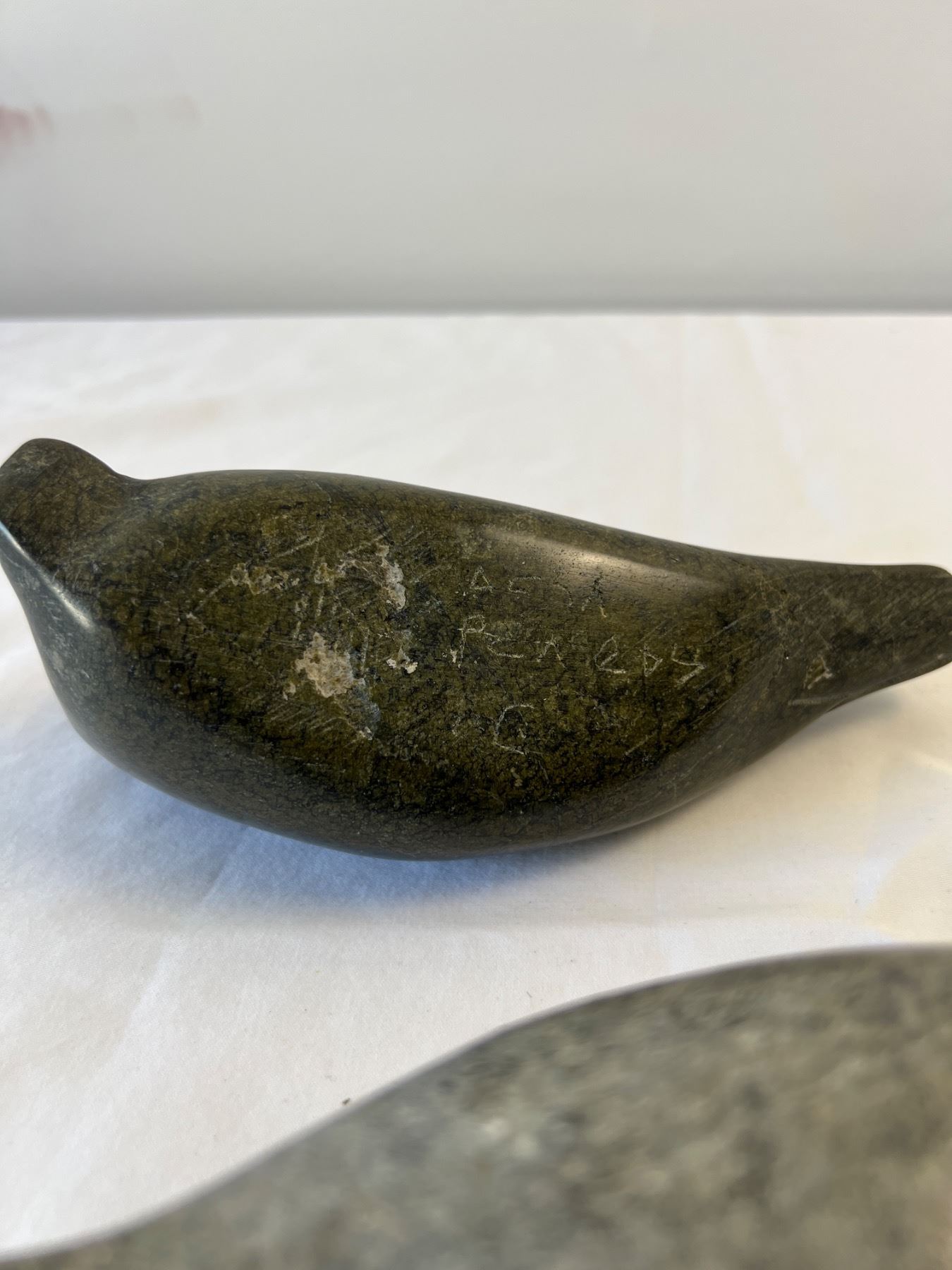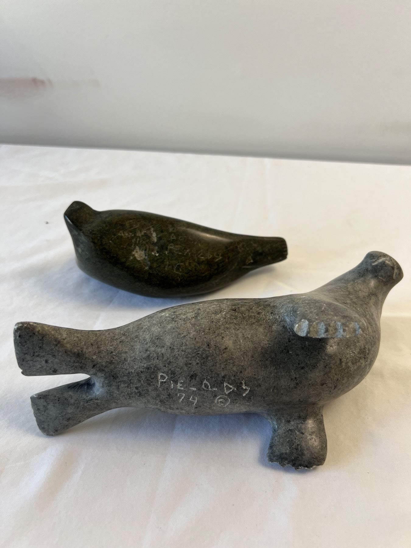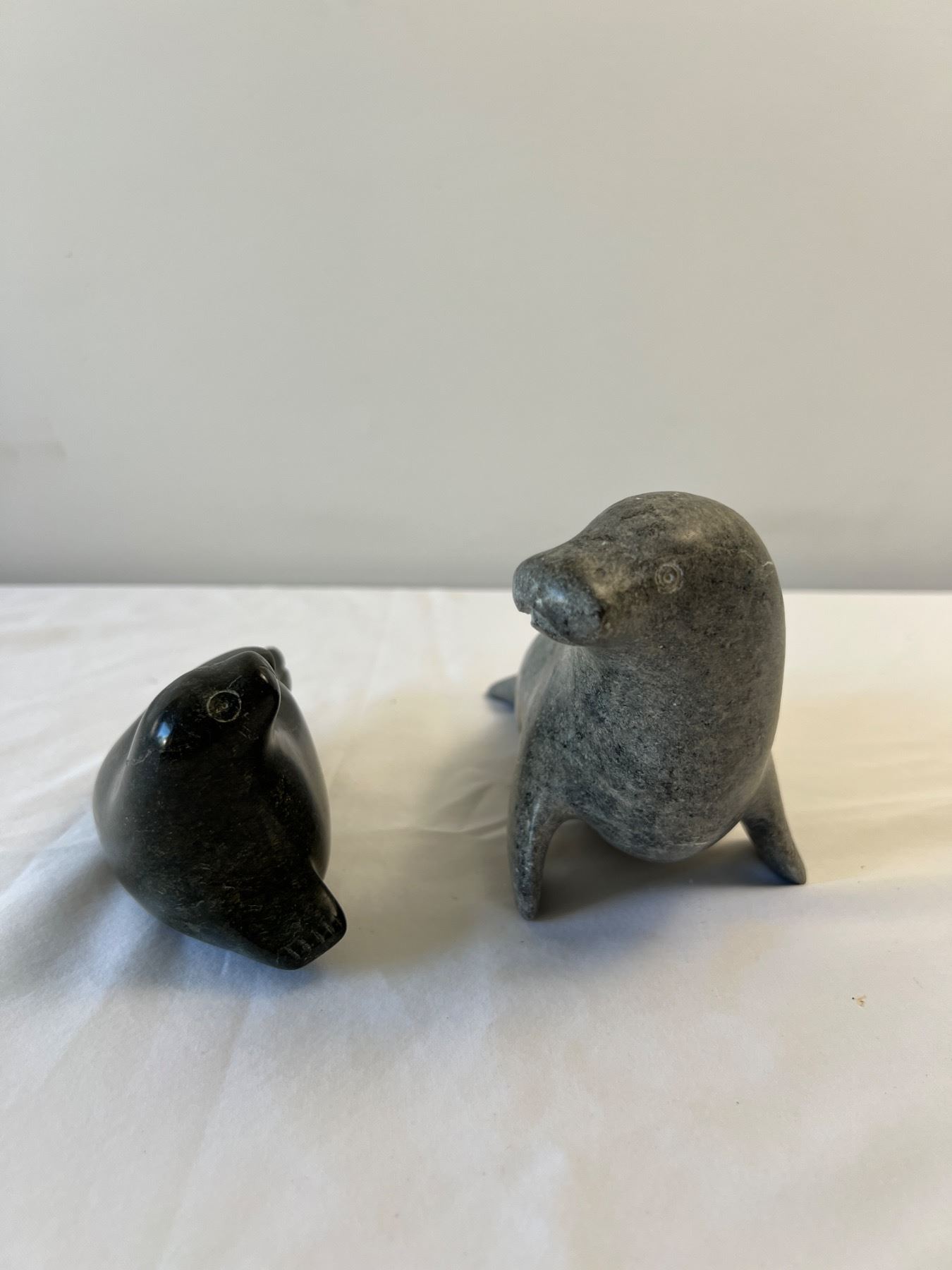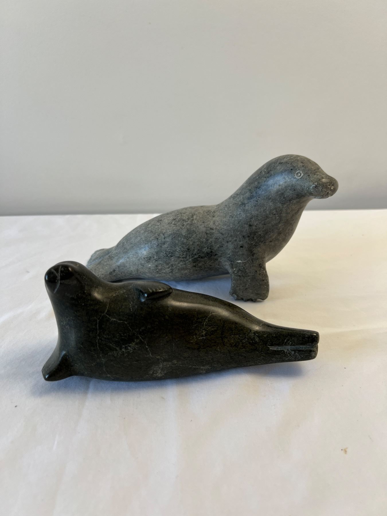 Larger seal measures 7.5" long by 4" wide. Some wear marks on base of smaller seal as well as crazing in the stone.