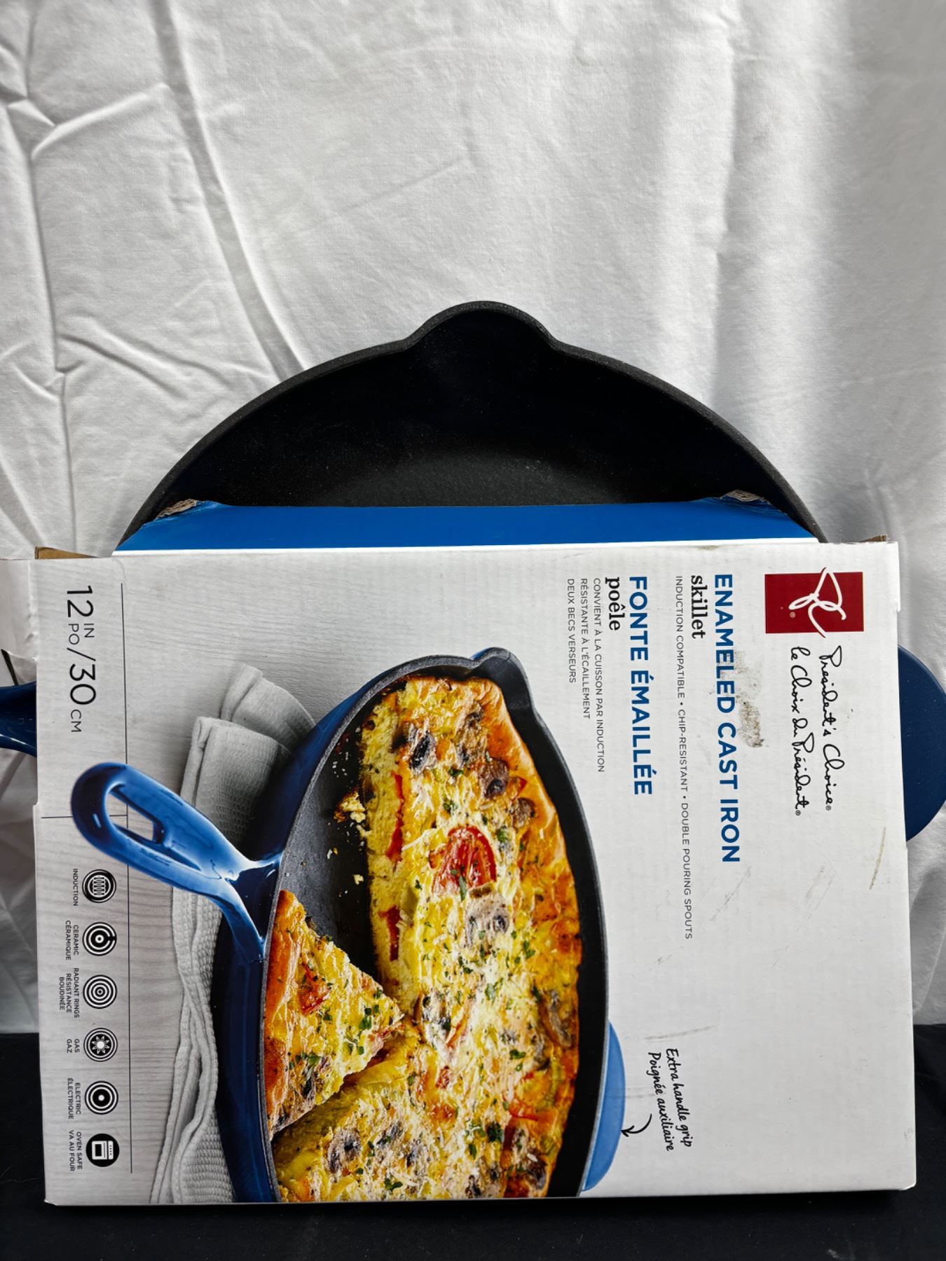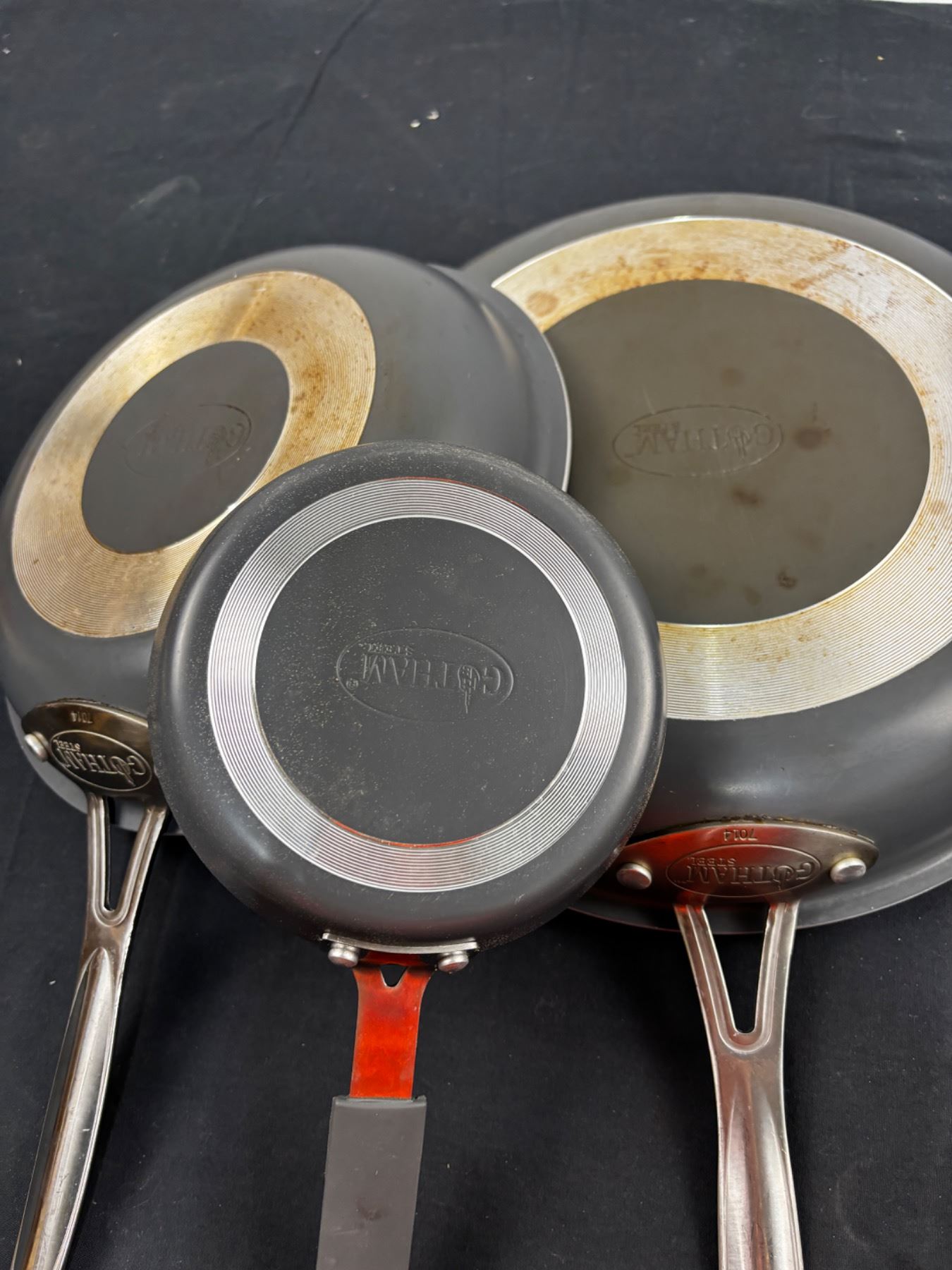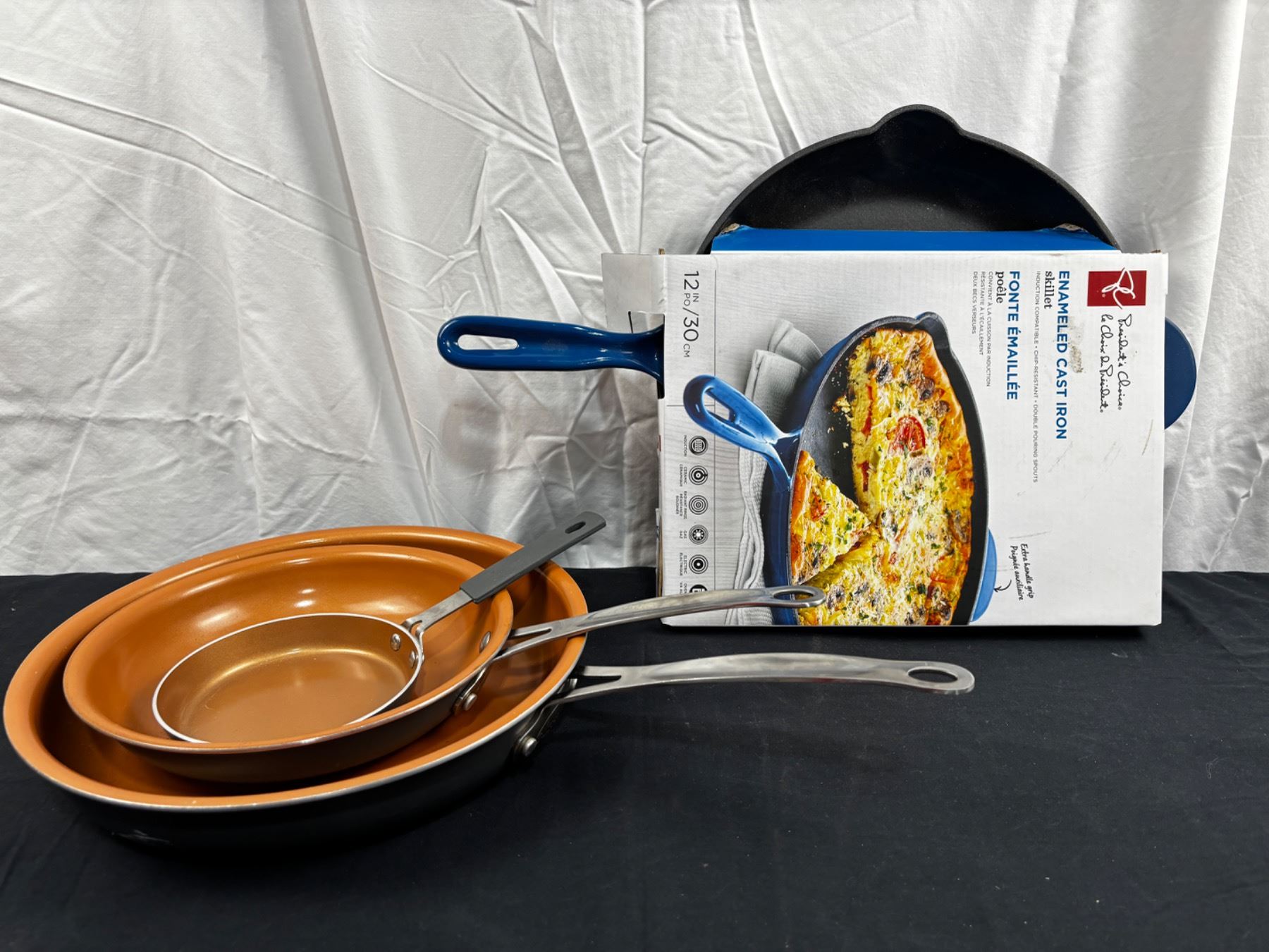 Presidents choice enamelled Cast Iron and Gotham Steel 3 piece cookware set. Medium sized Gotham pan has some stains. Pans all have cook marks on the bottom.