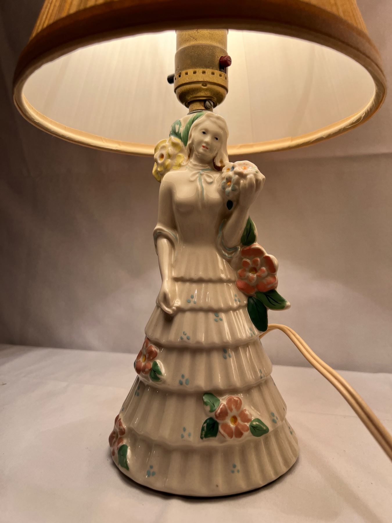 Lamp with children on it is largest, measures at 16" tall and 9" in diameter on the shade. All 3 working. Some corrosion to metal frame of violin player.