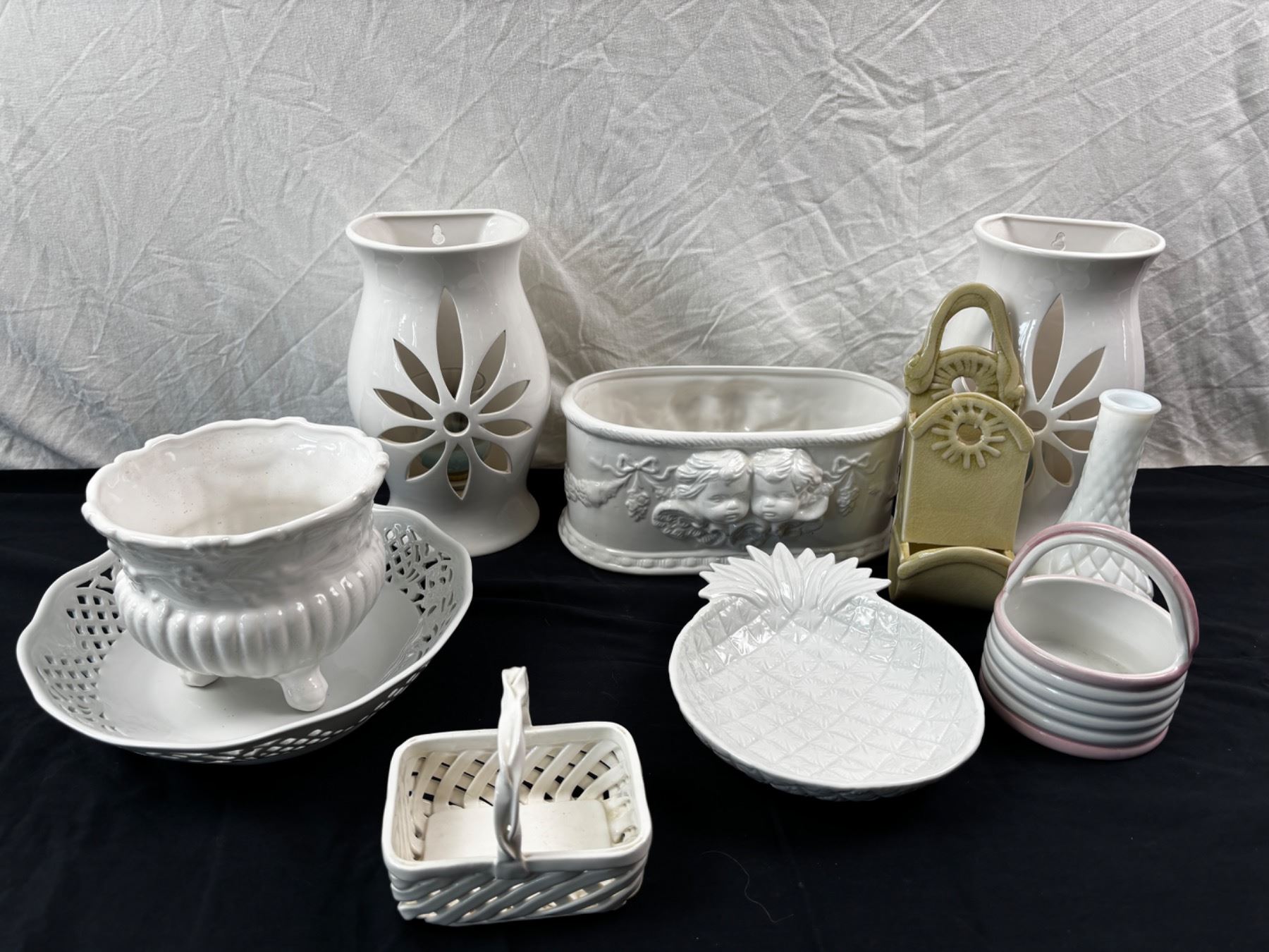 The wall candle holders are 9.5"H, includes one milk glass vase