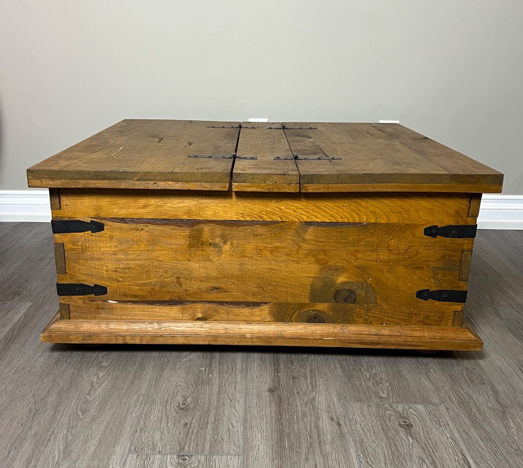 Measures 16" tall by 35" by 34". Top hinges open or can be removed for storage. Some wear/discolouration to wood