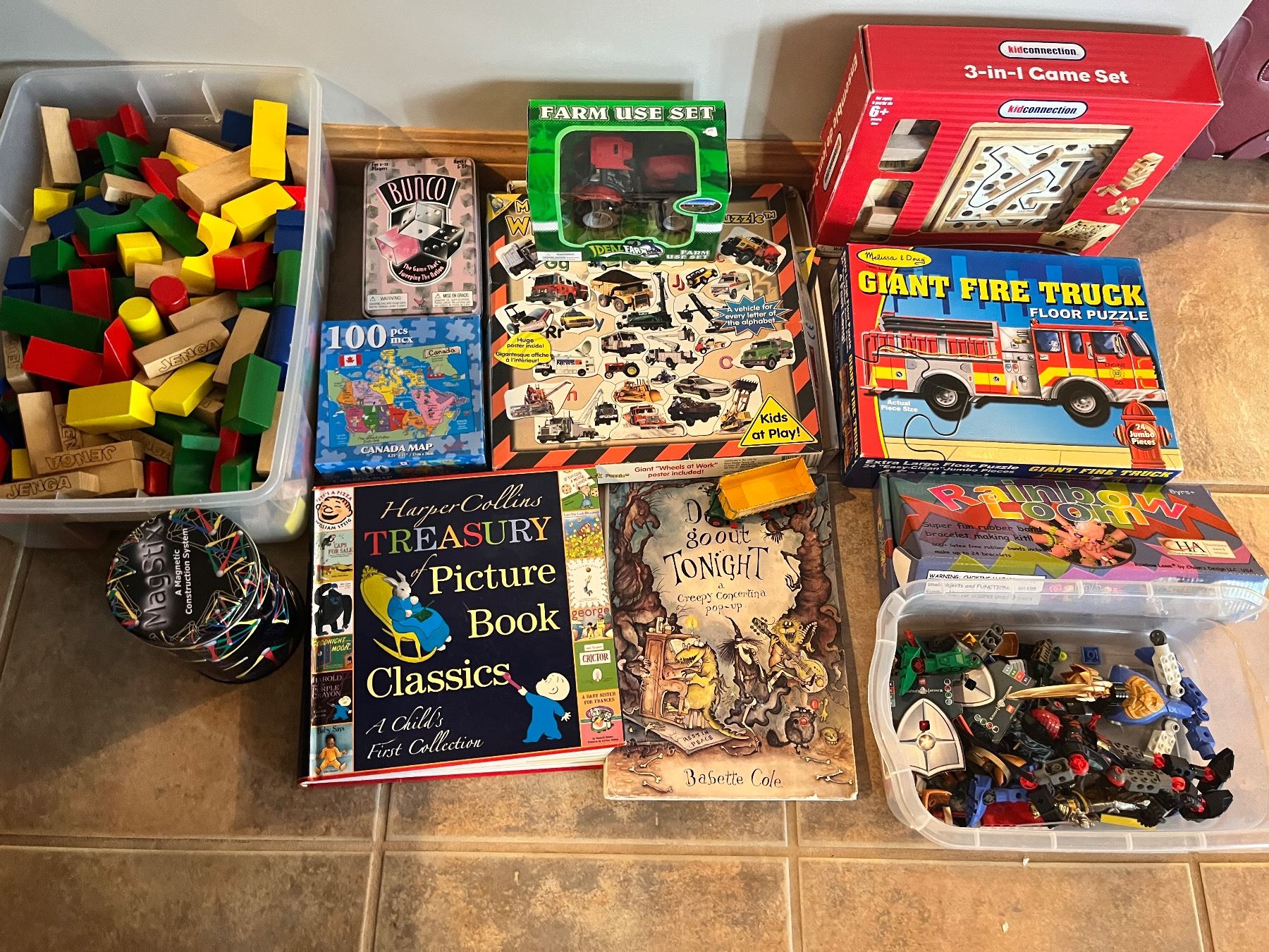 Includes, puzzles, games, toys, etc. (cannot confirm that all of the pieces are accounted for)