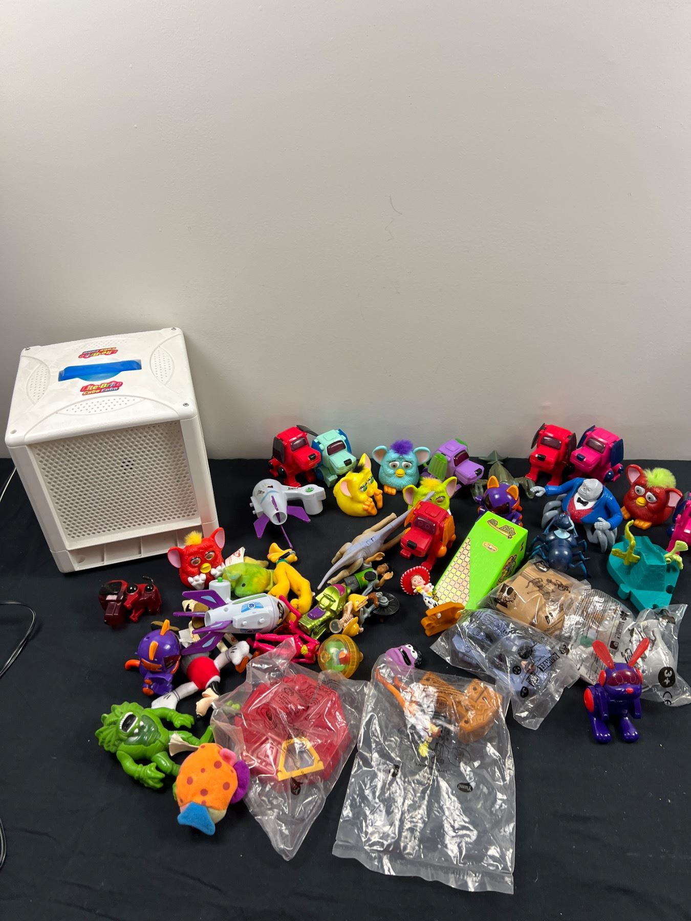 Includes, Lite Brite Cube (works but does not include the pegs), Furby, Miniature figures, and more