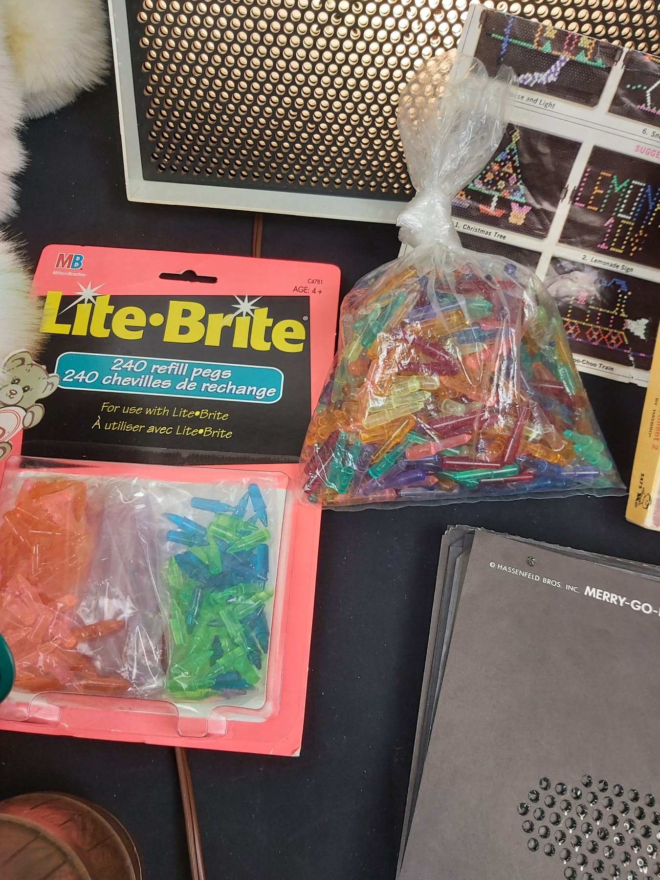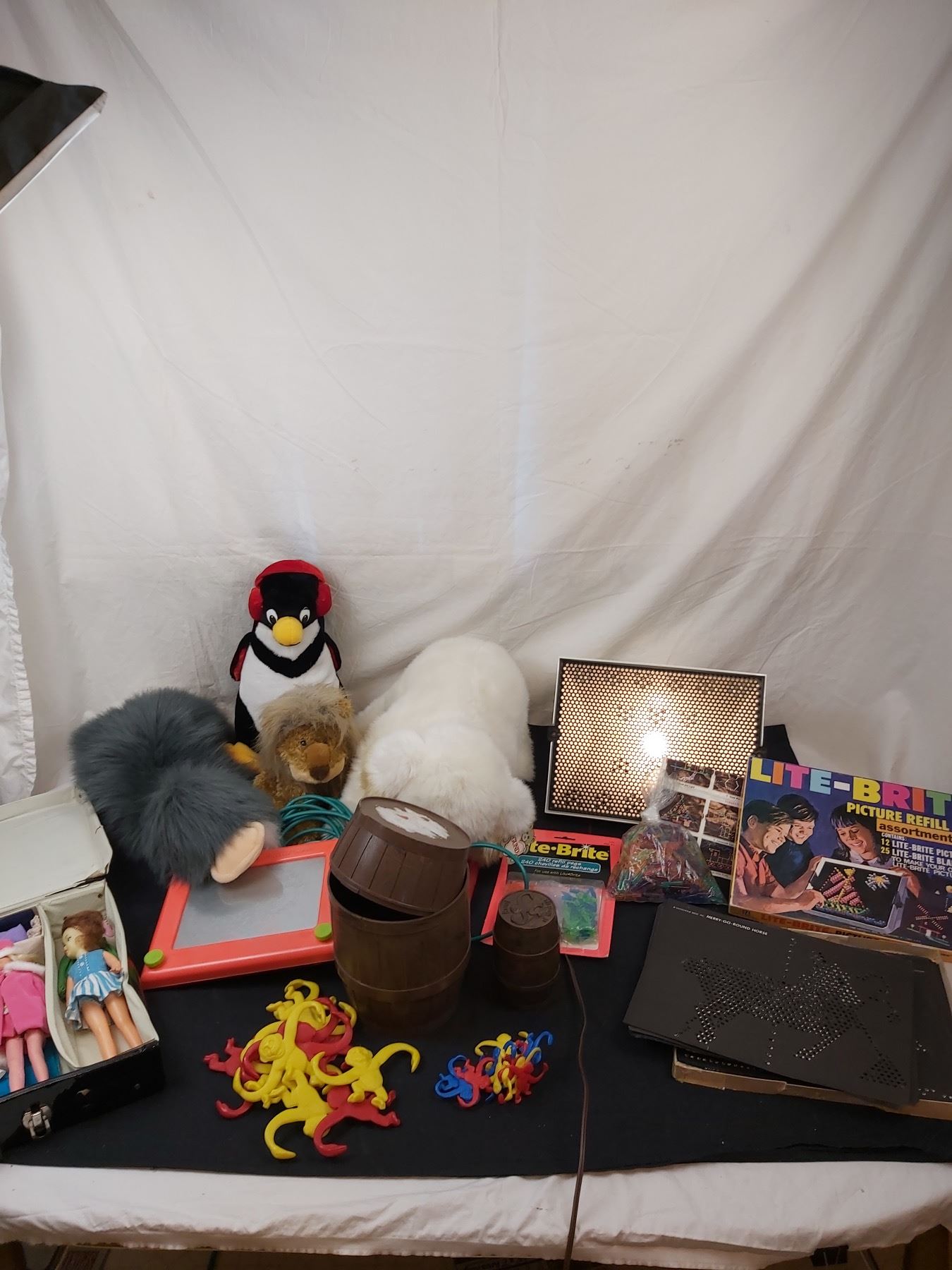 Includes, Stuffed animals, Lite-Brite with extra pegs (works), Barrel of Monkeys, Etch a Sketch, etc.