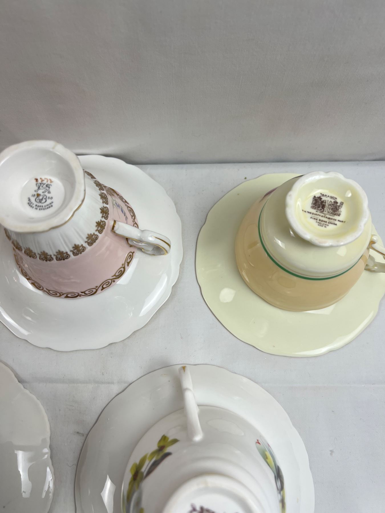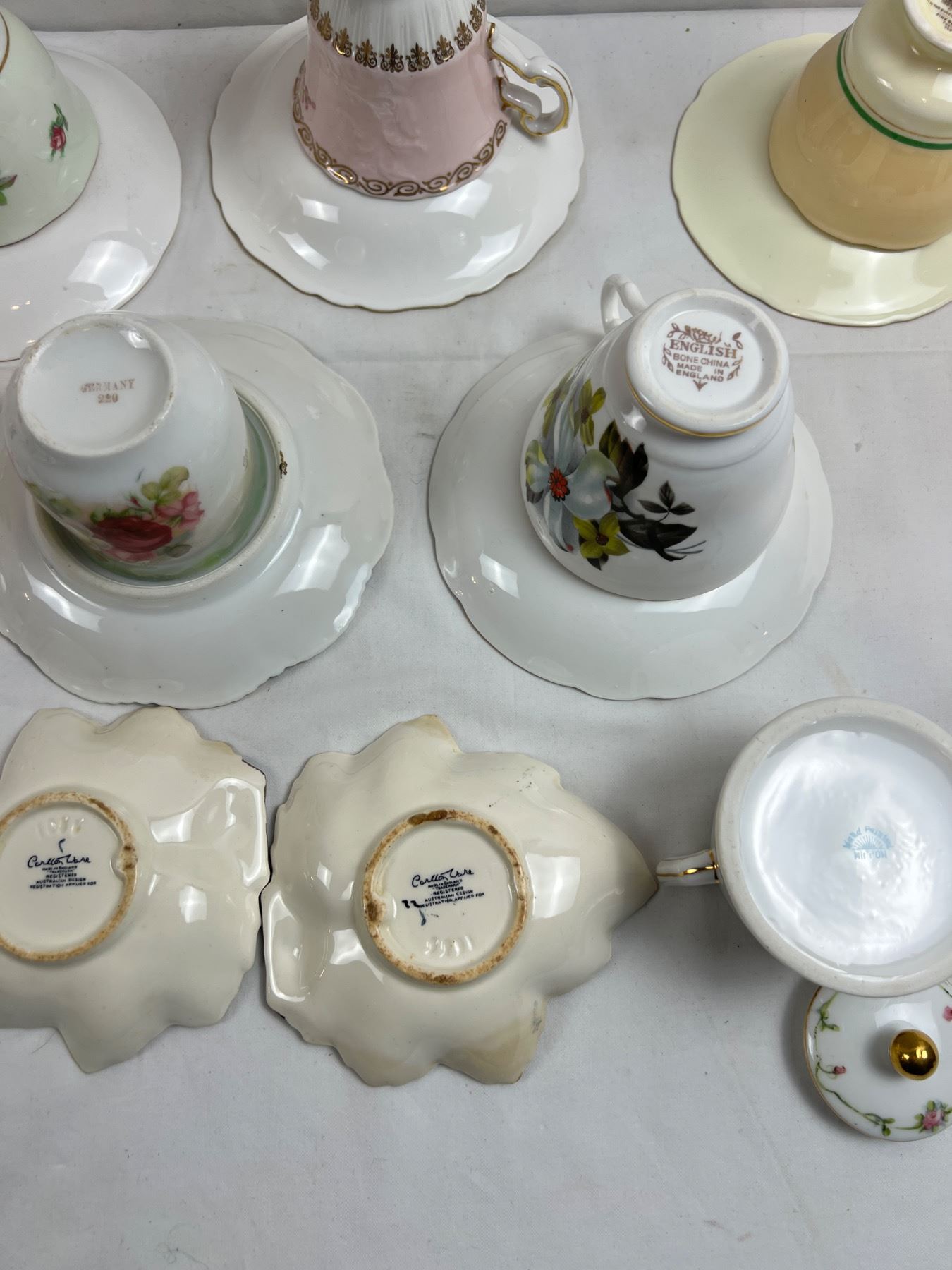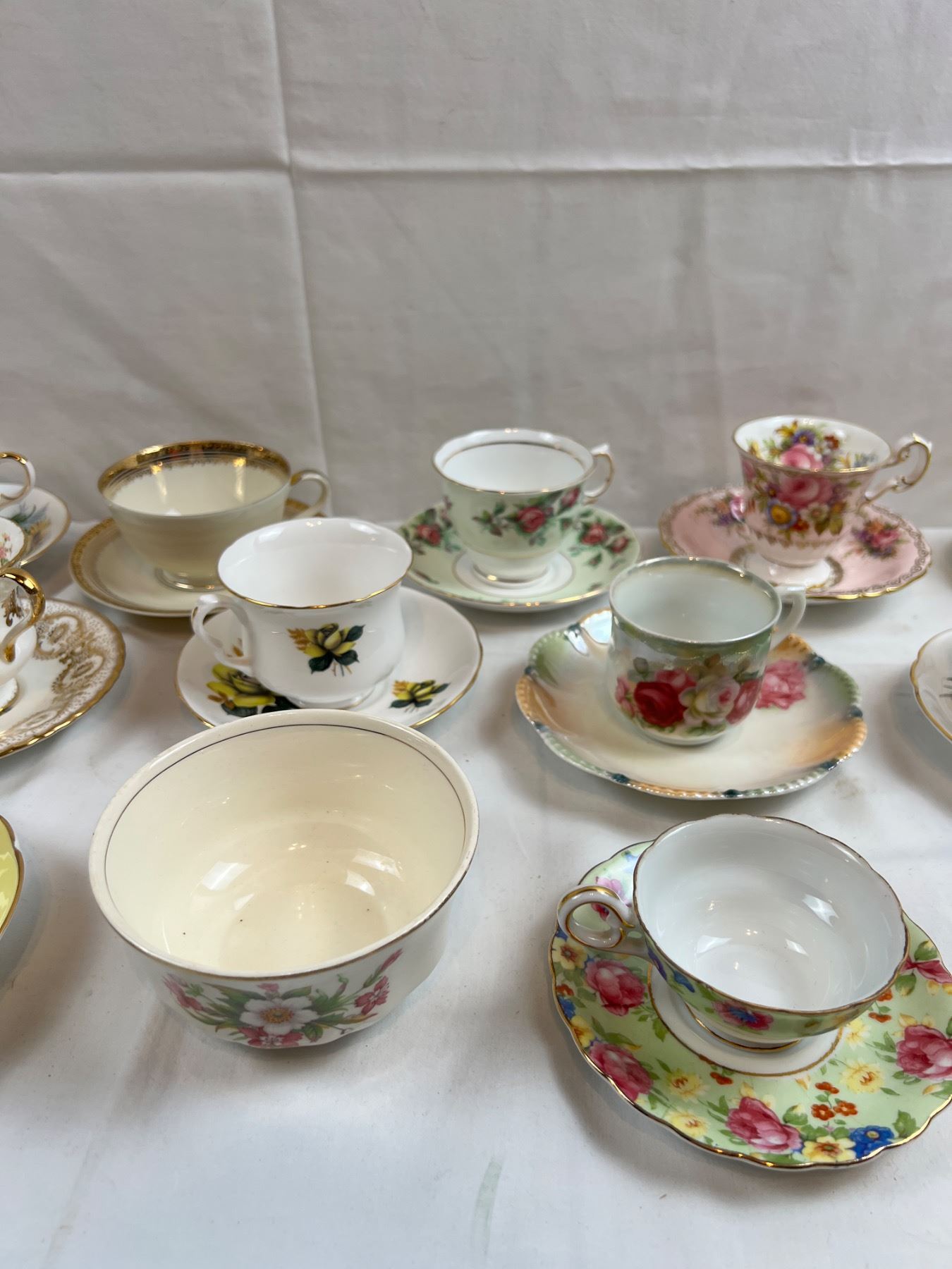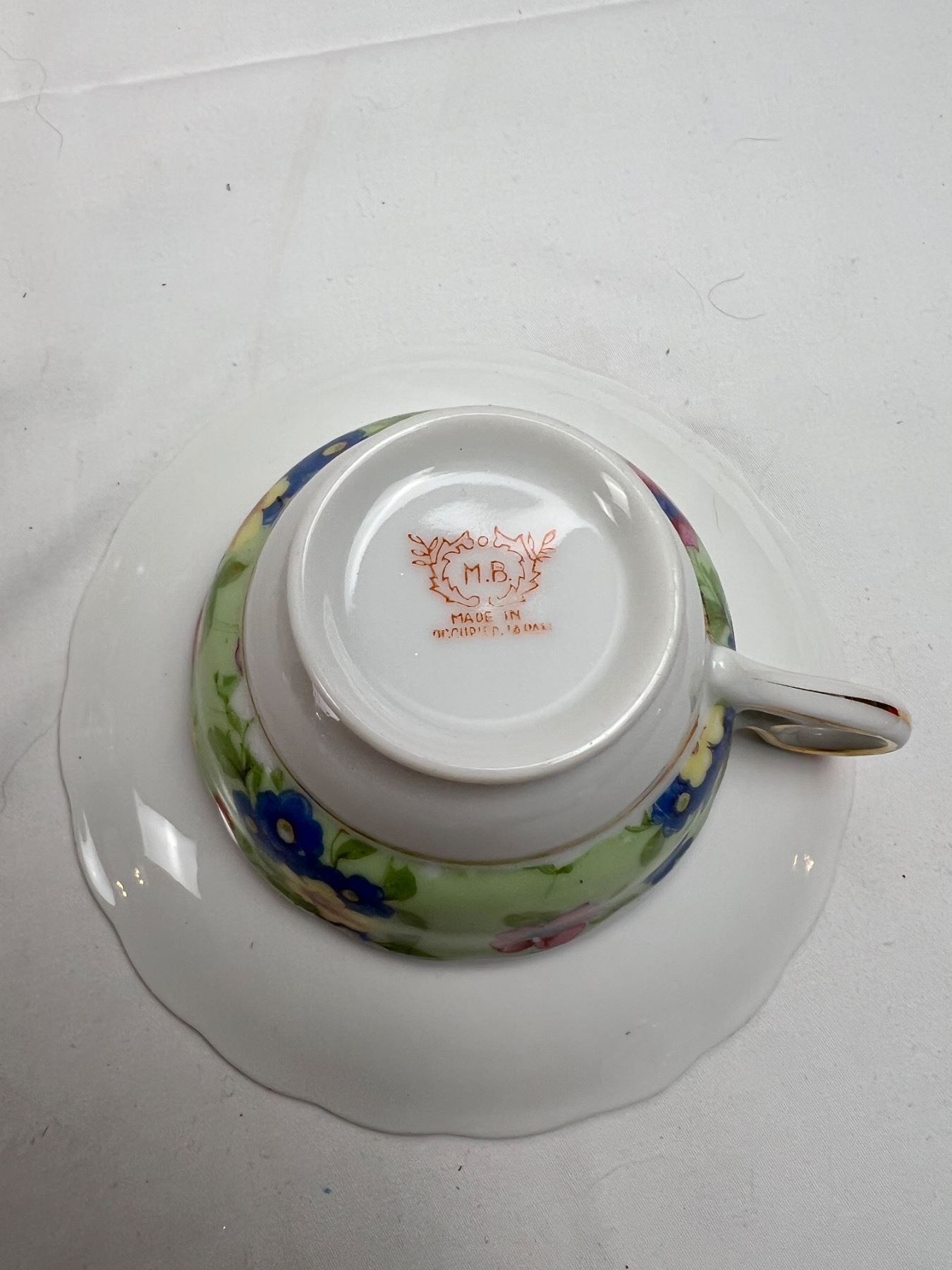 The green floral teacup is made in occupied Japan which makes it made between 1945-1952. Brands include Paragon, Windsor, Queen Anne and more!
