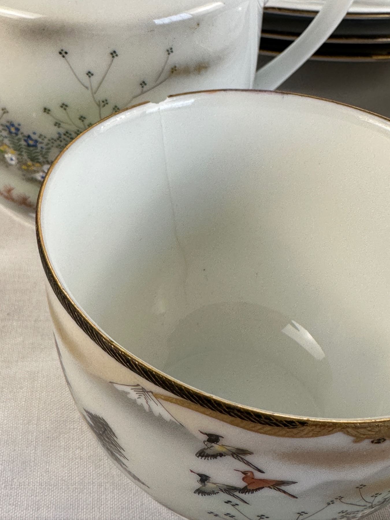 Marked on bottom - 45 pieces - includes 6 cups, 7 saucers, cream & sugar, 6 large plates, 5 small plates, 2 large bowls, 8 medium bowls, 8 small bowls, serving tray, teapot