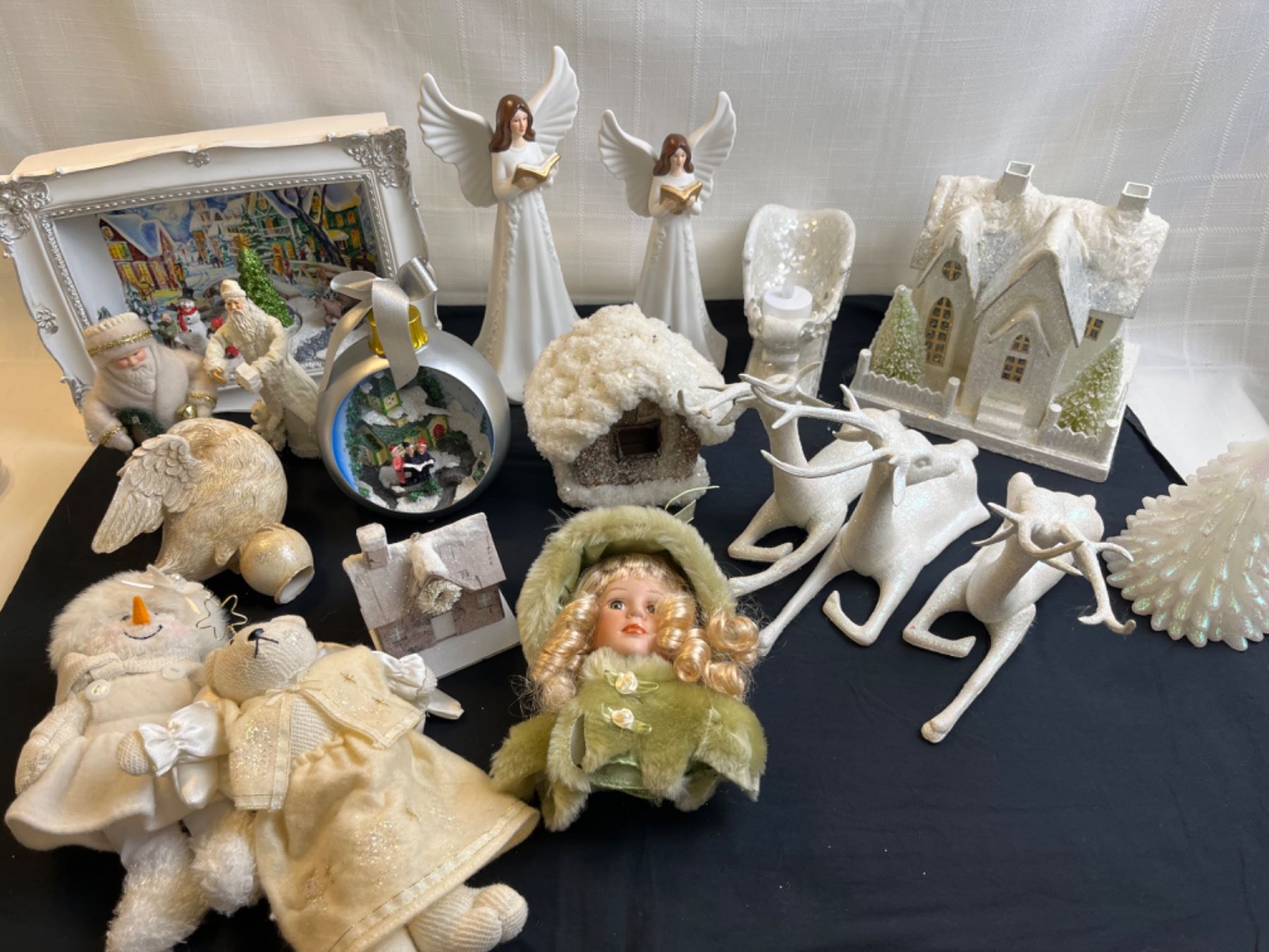 Includes light-up scene box and angels (works), ornaments, etc. Tallest is 10" tall