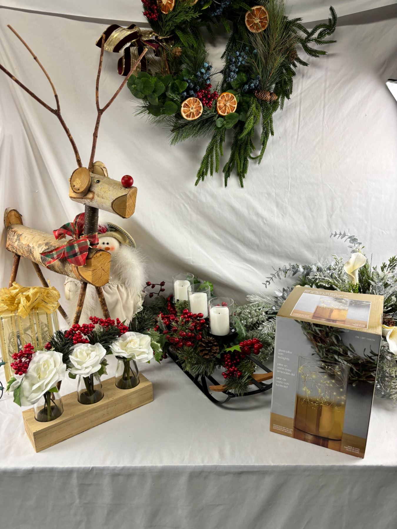 Includes Wooden Reindeer (18"L x 32"H), wreath, candle holders, etc.