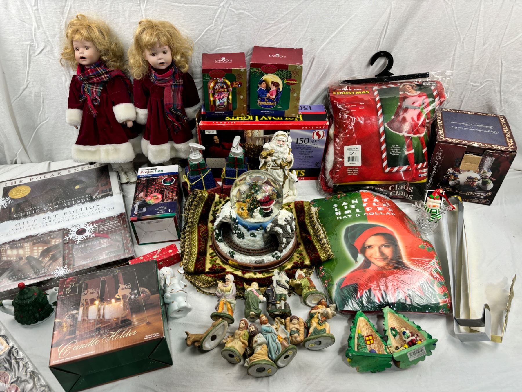 Includes, a variety of ornaments, string lights (not tested), snow globes, costumes, etc.