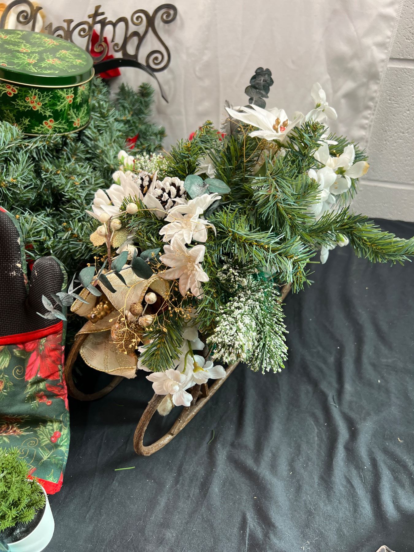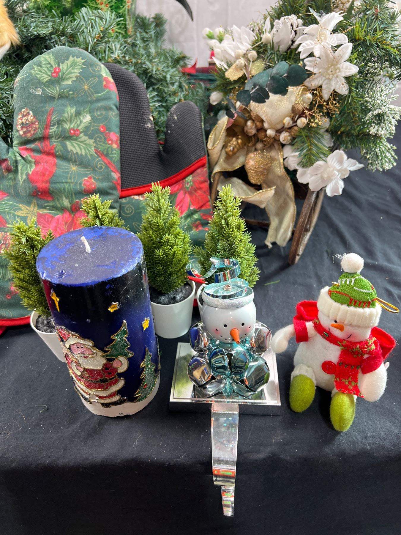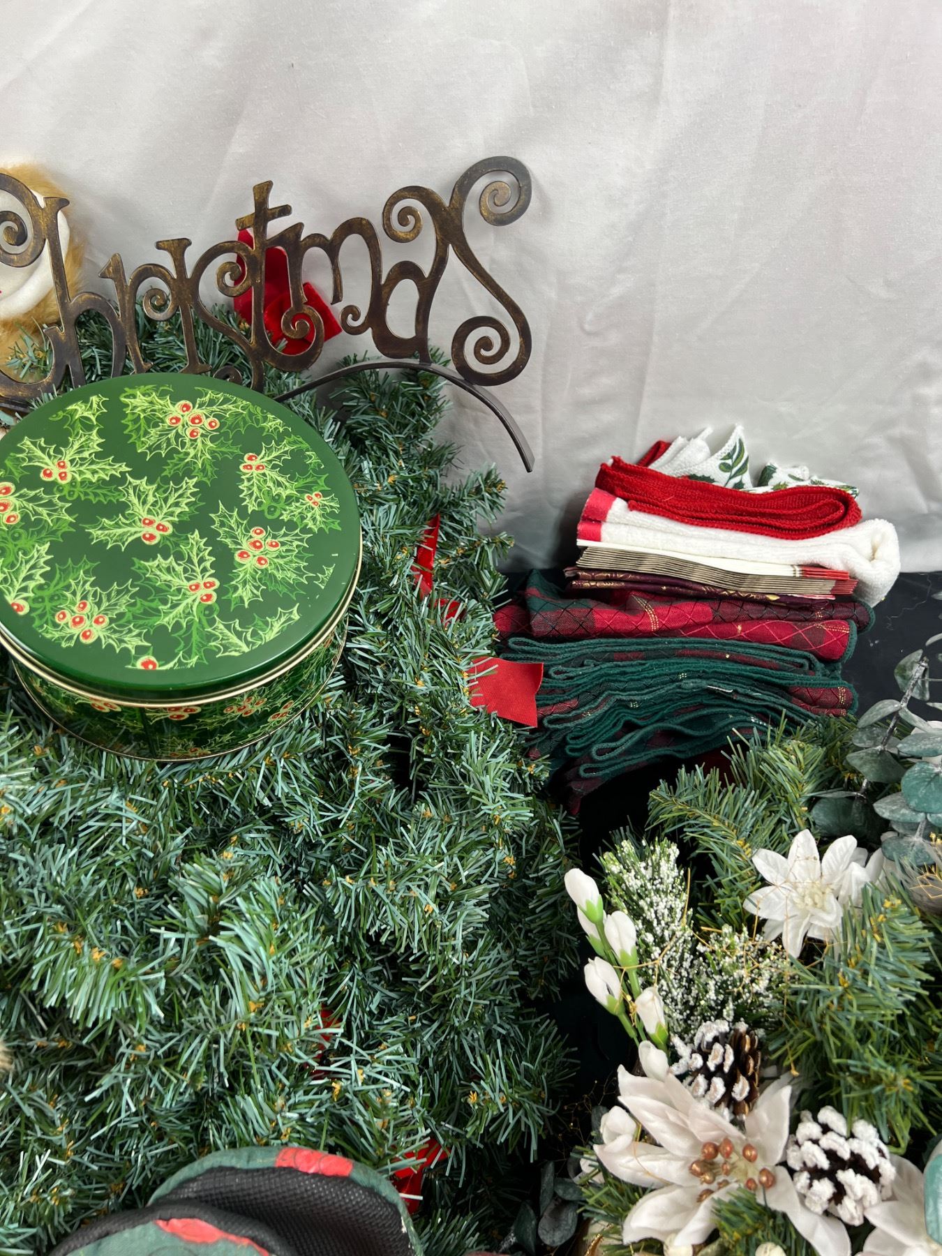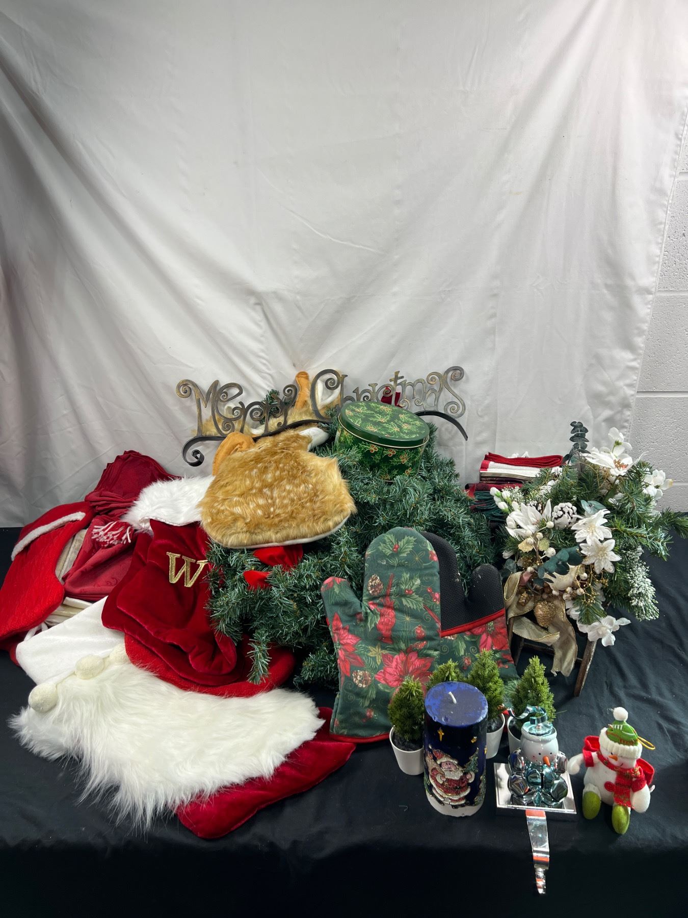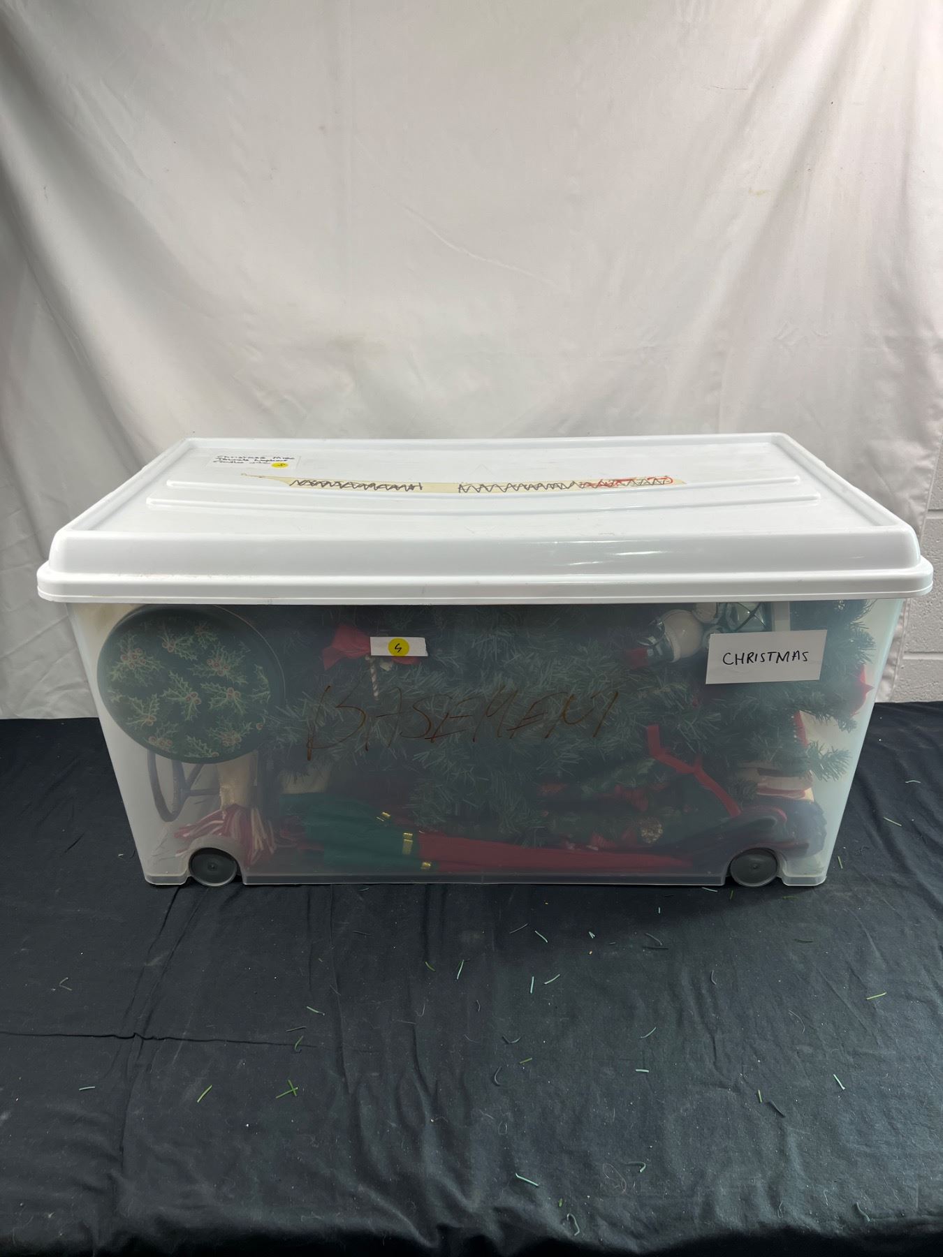 Includes various linens, stockings, garlands, ornaments, Storage bin on wheels, and more