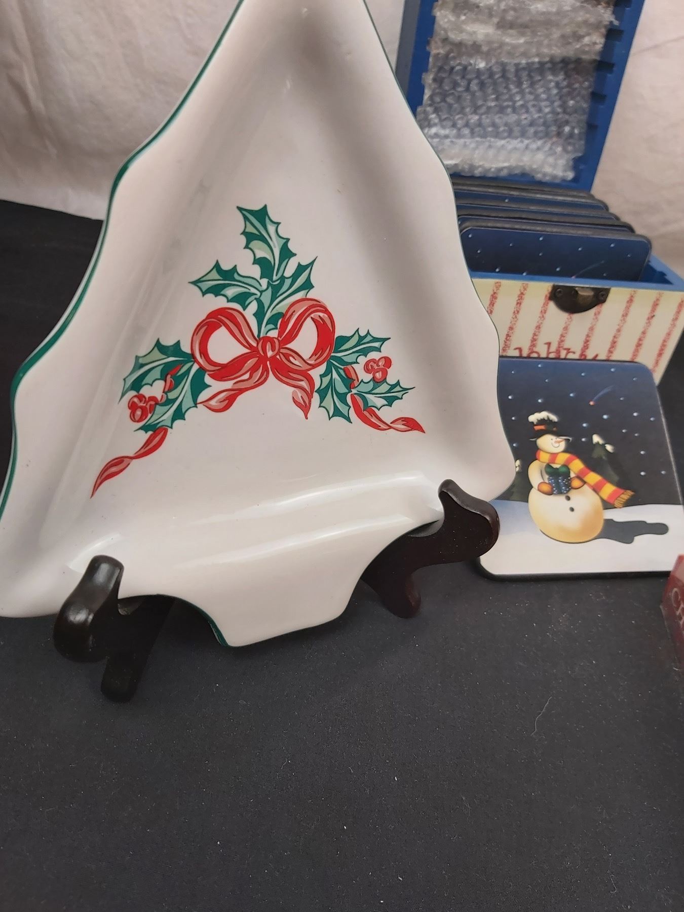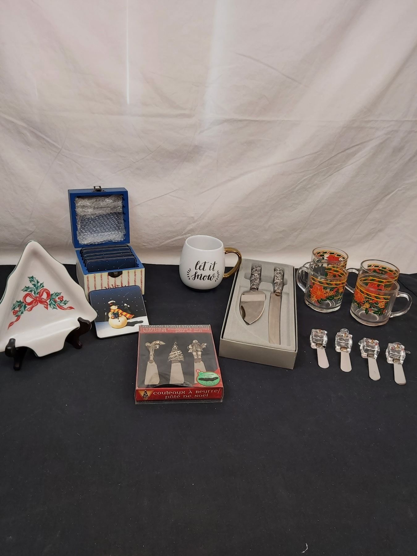 Includes, Coasters, Madison Avenue servers, Kig Indonesia poinsettia mugs, etc.