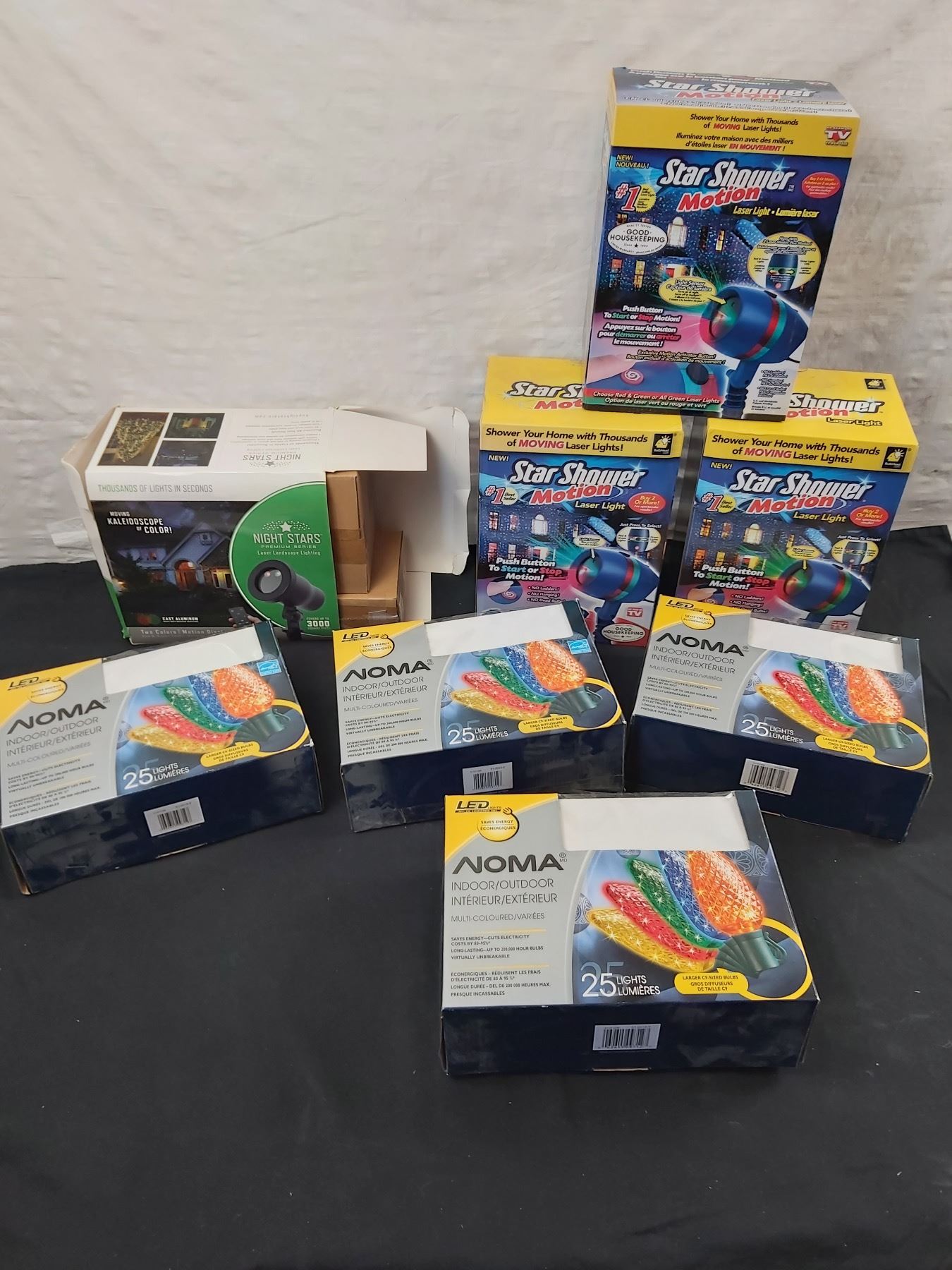 Includes, 4 Noma Indoor/Outdoor multicoloured string lights (works), 3 Motion Star Shower Laser Lights (not tested), Night Stars Laser Landscape Lighting (not tested)
