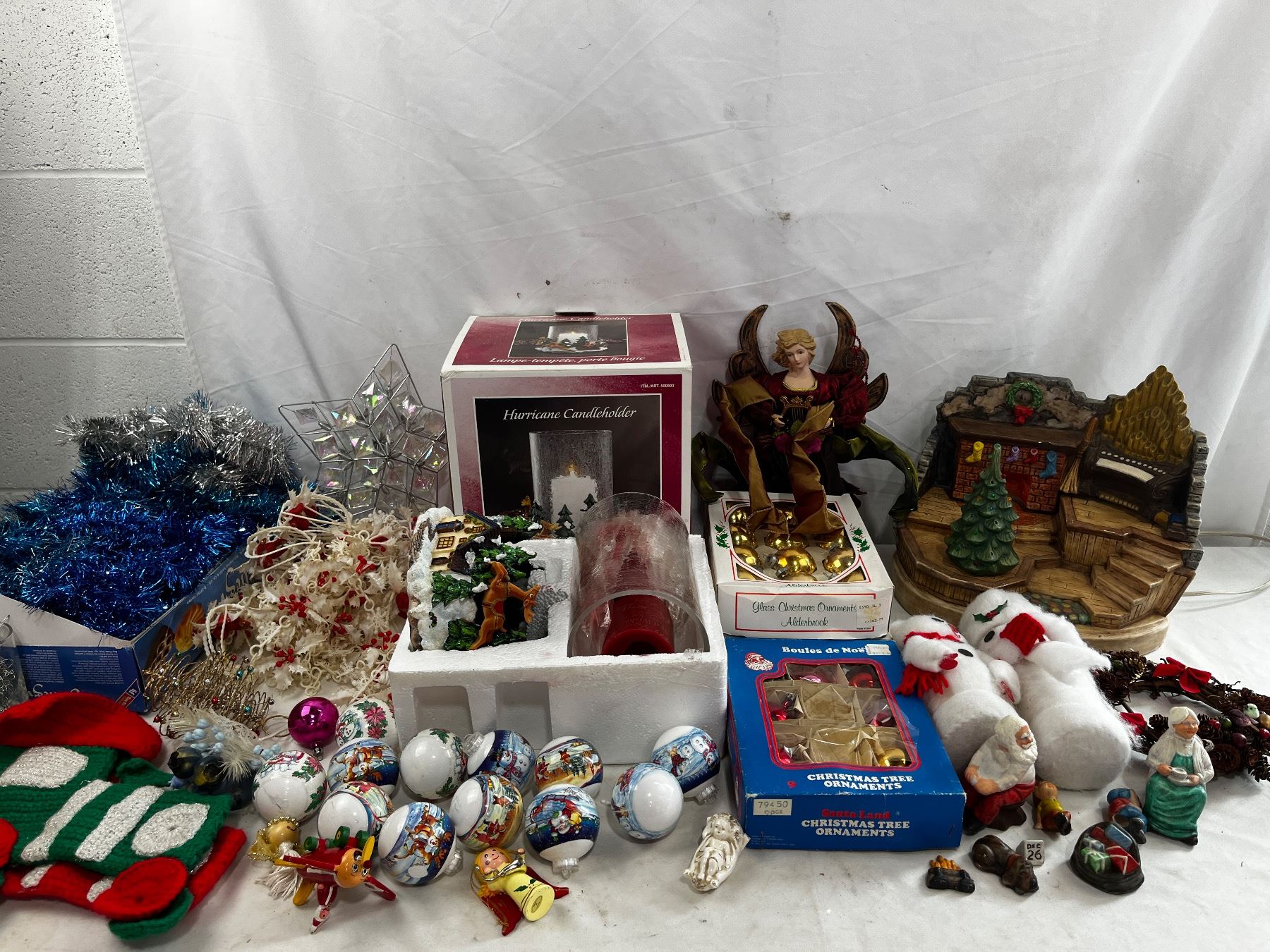 Includes various ornaments, tinsel, Hurricane Candleholder, etc.