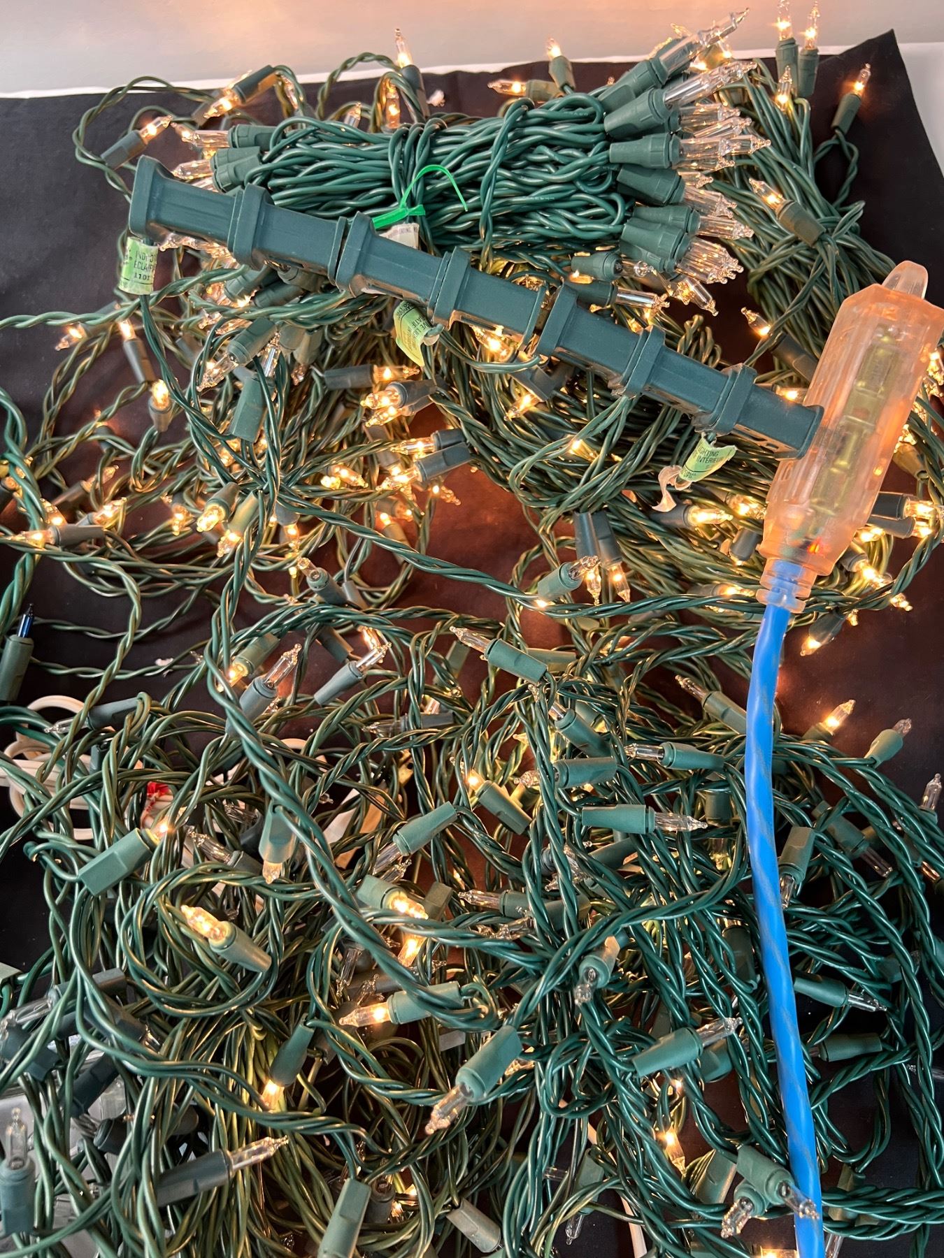 Includes various plastic and glass ornaments, Angel tree topper (24"H), string lights, and more