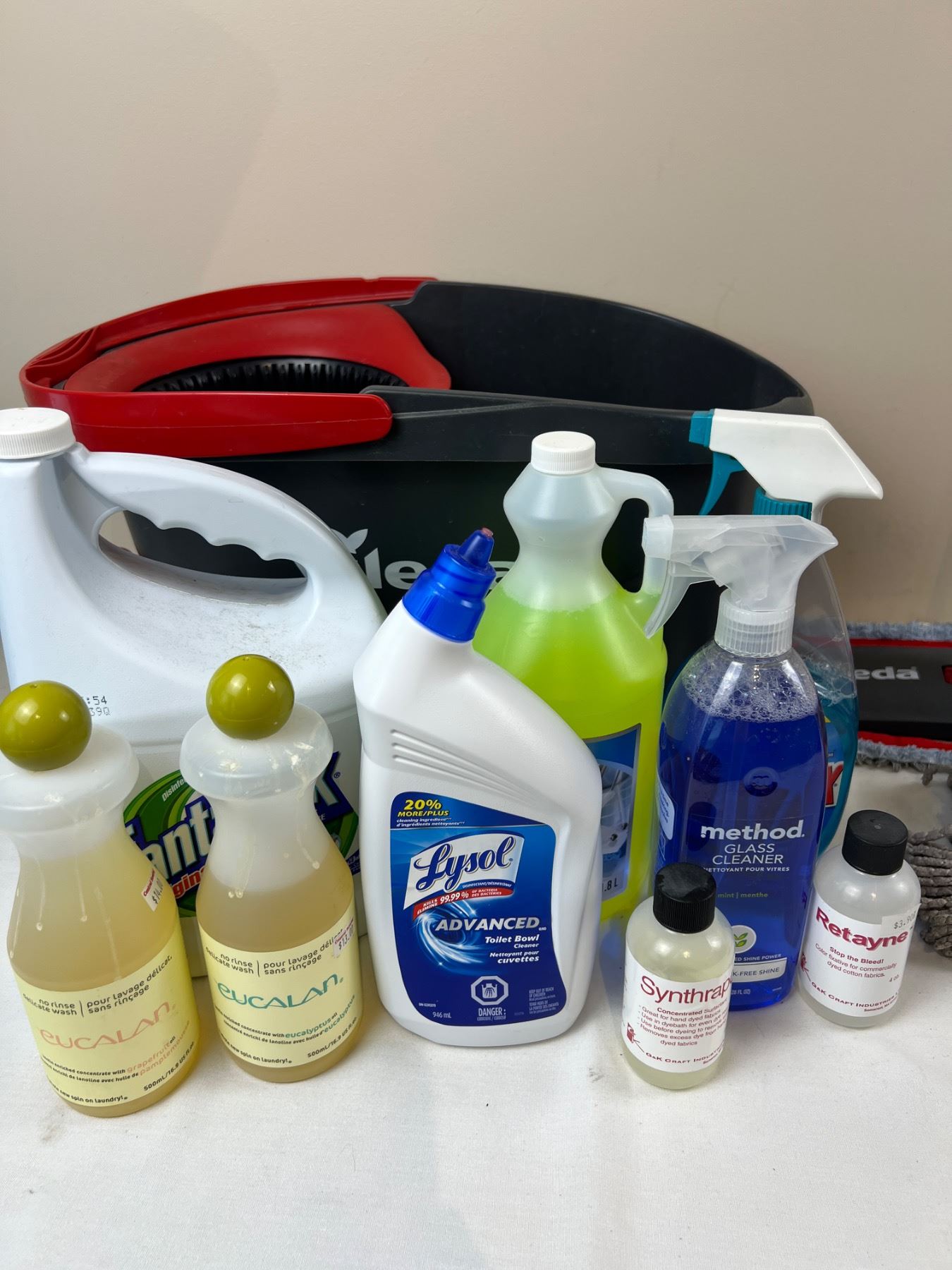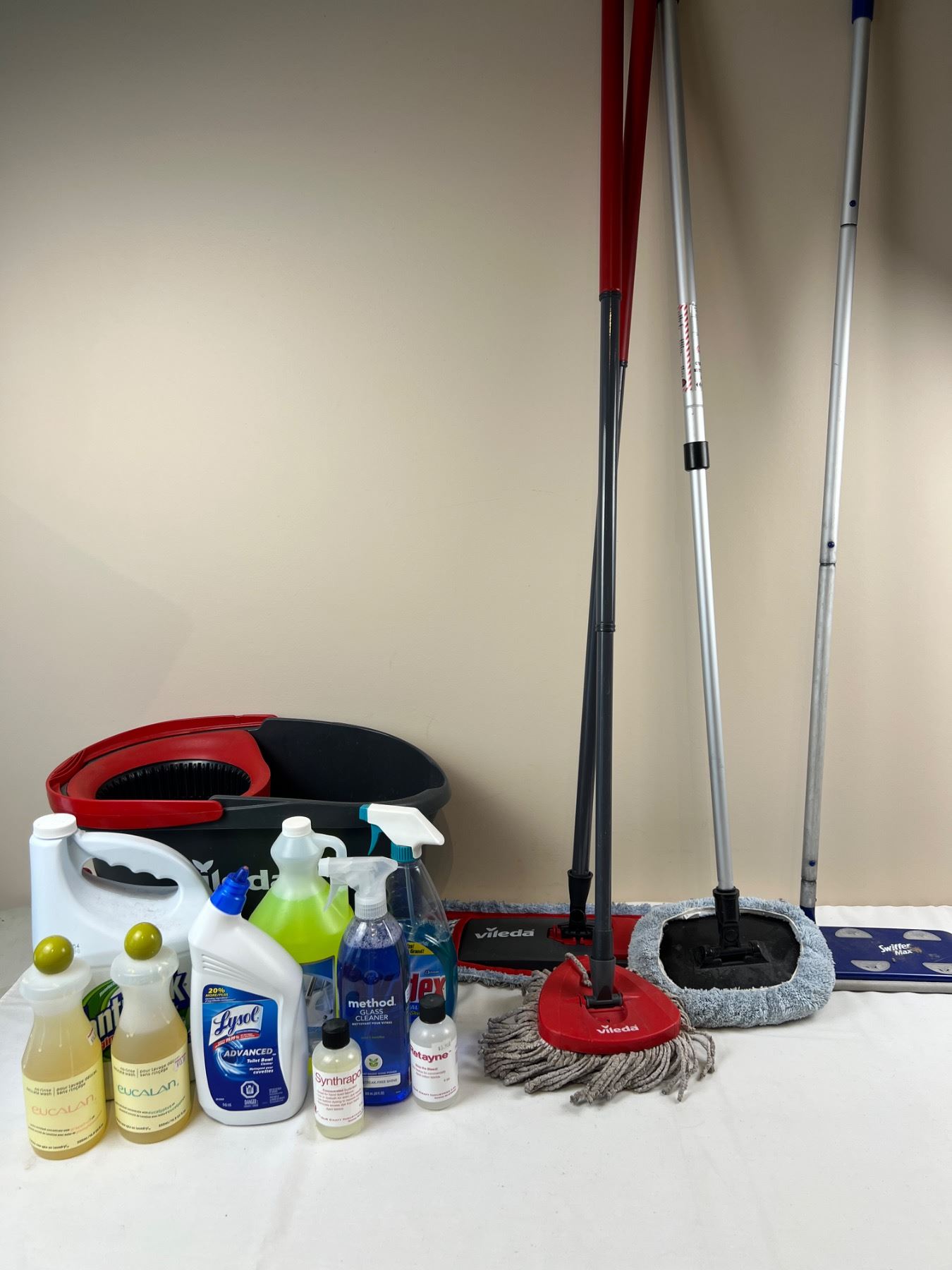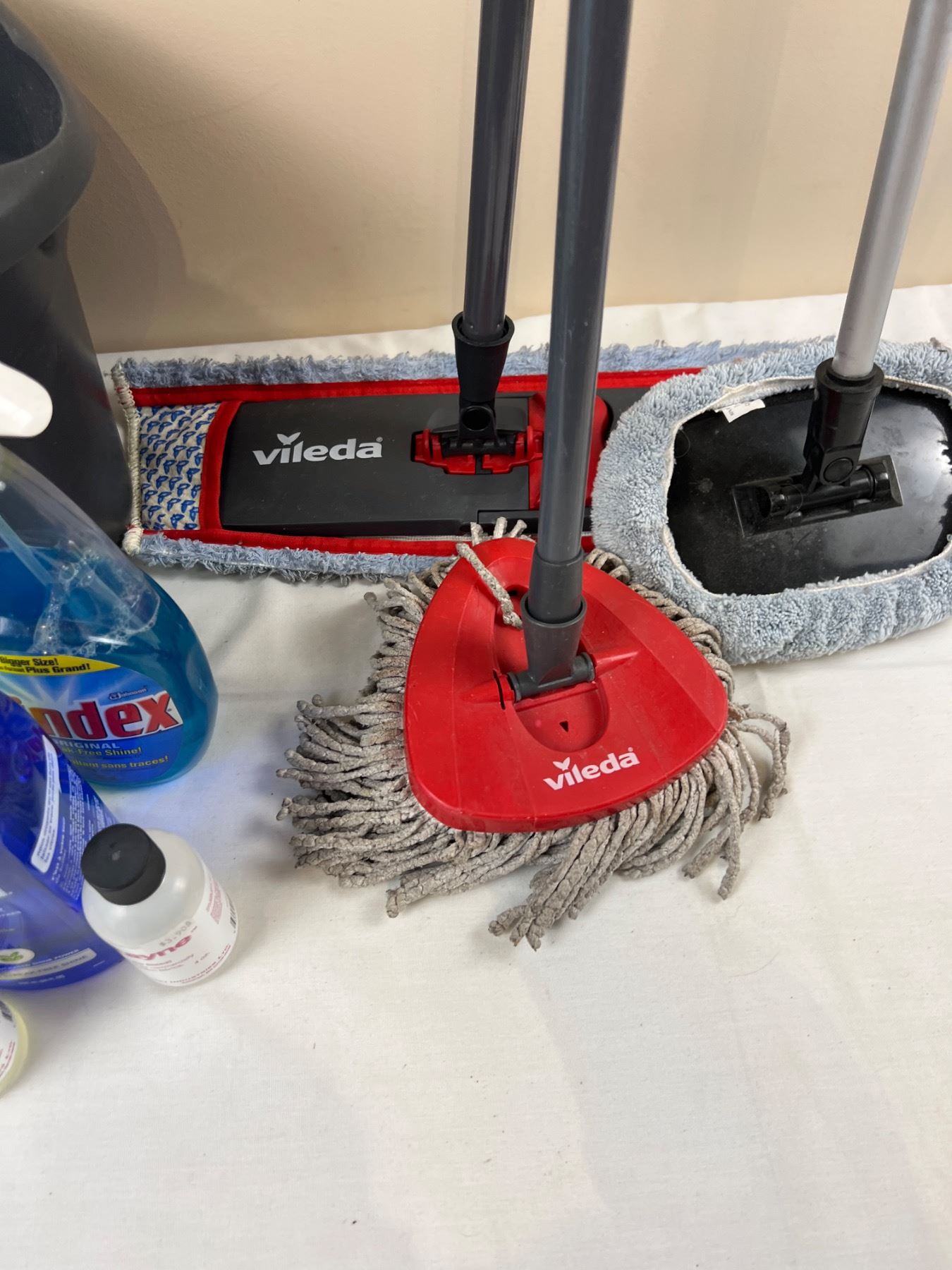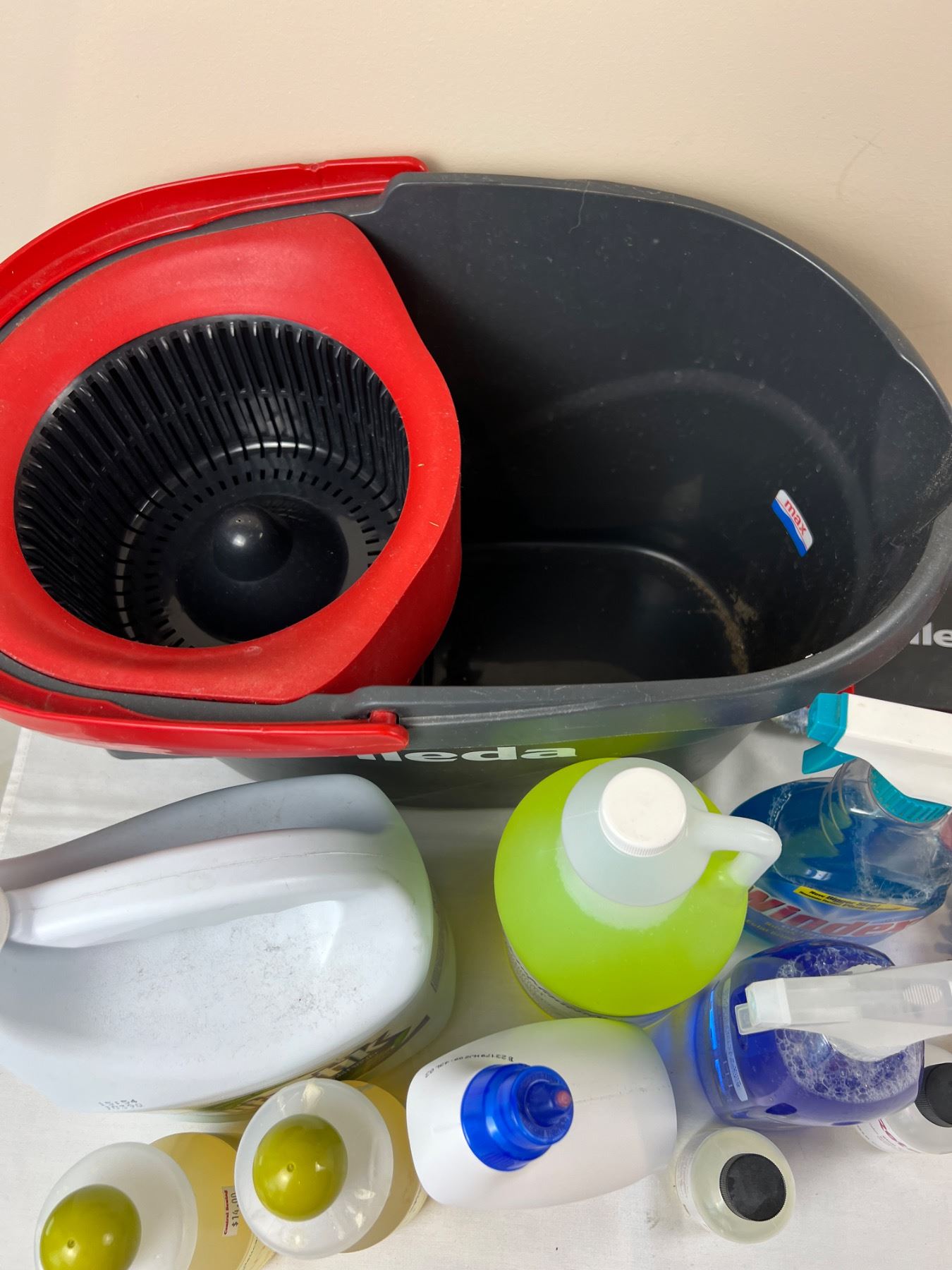 Includes an assortment of household chemicals (1/2-full), Vileda Mop and Bucket, and more