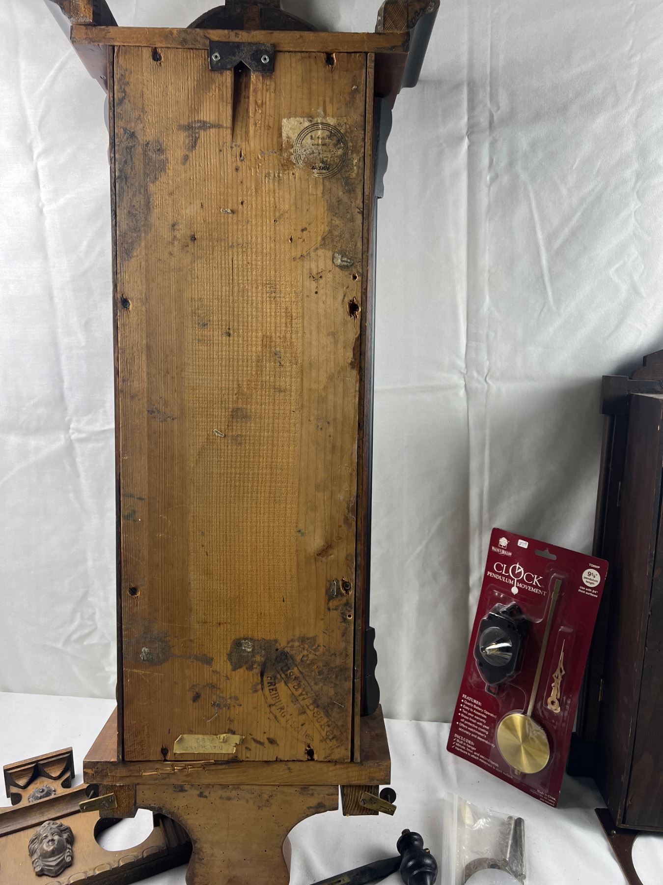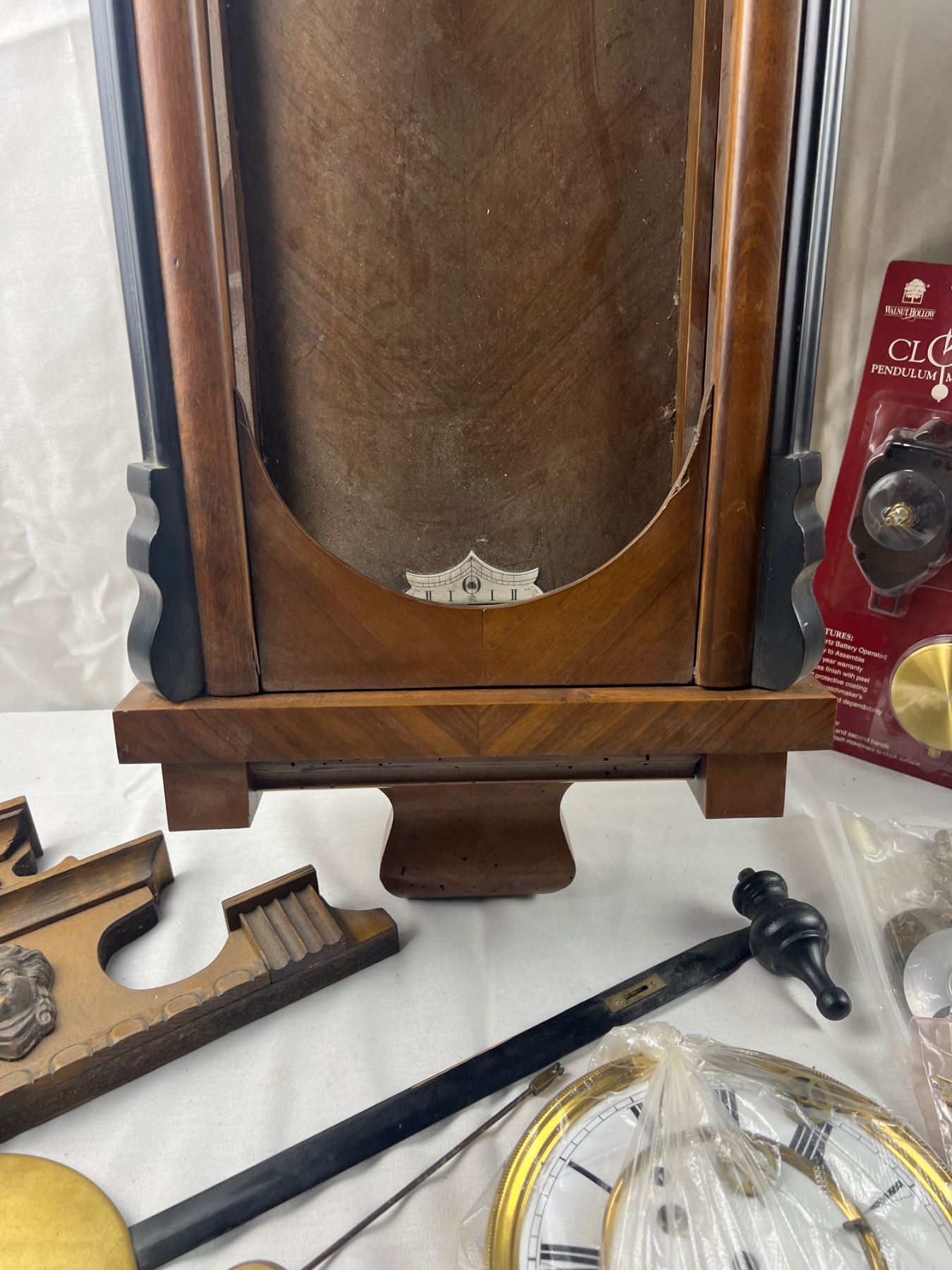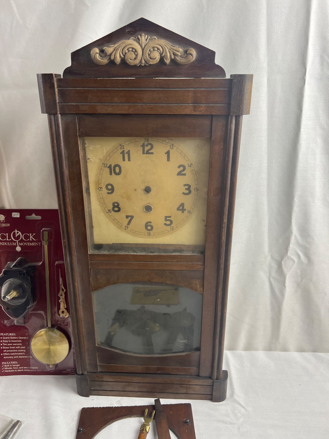 Includes two clock pieces (12x36" & 10x23"), The larger one is missing the glass and both are missing the mechanical components, comes with various parts such as two new Clock Pendulum Movement sets