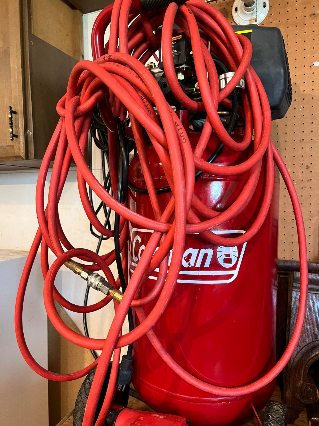 About 57 litres. Model # CM01213-15. Includes various air tools