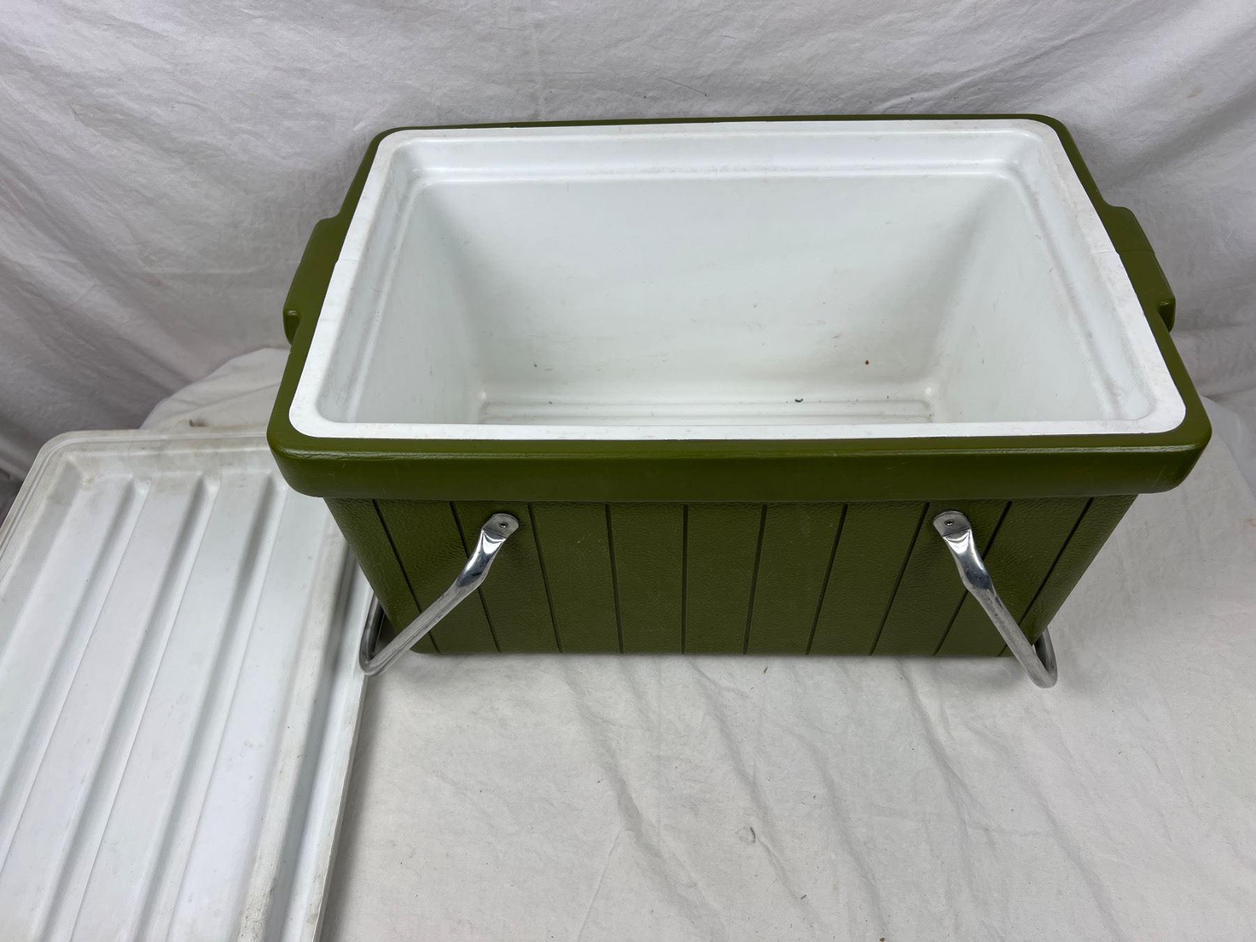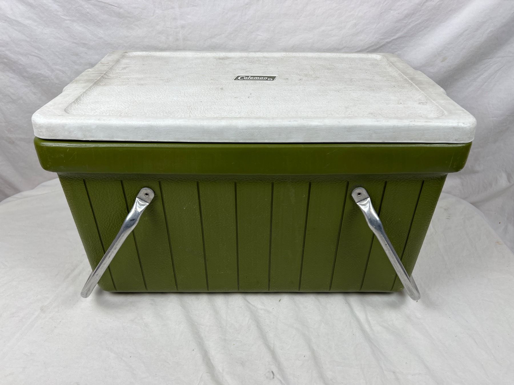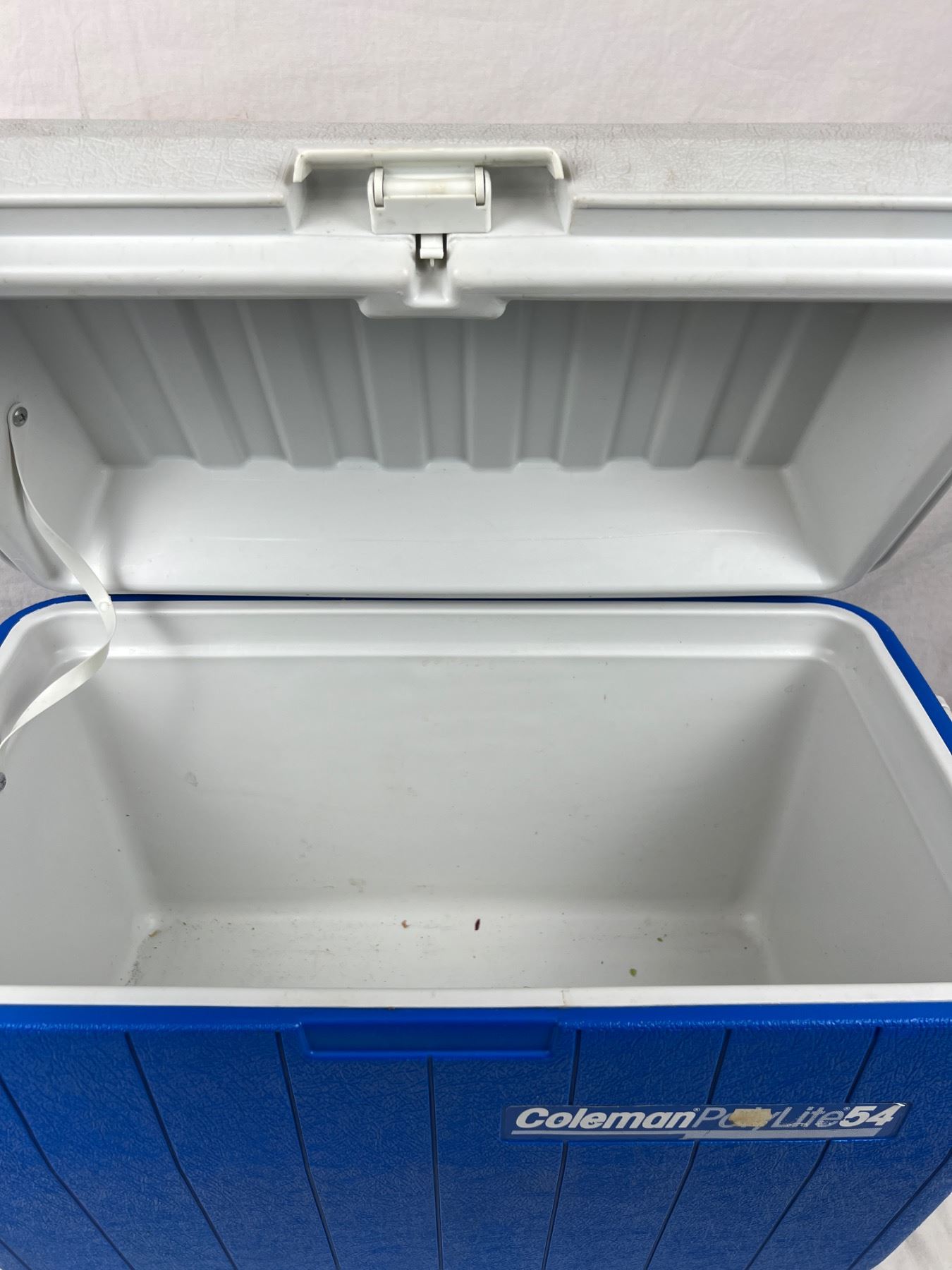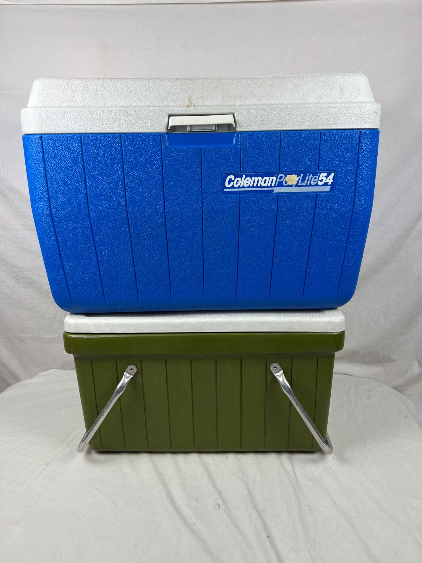 Includes a Coleman PolyLite 54 (24"L x 14"W x 17"H) and a smaller green Coleman cooler, some stains