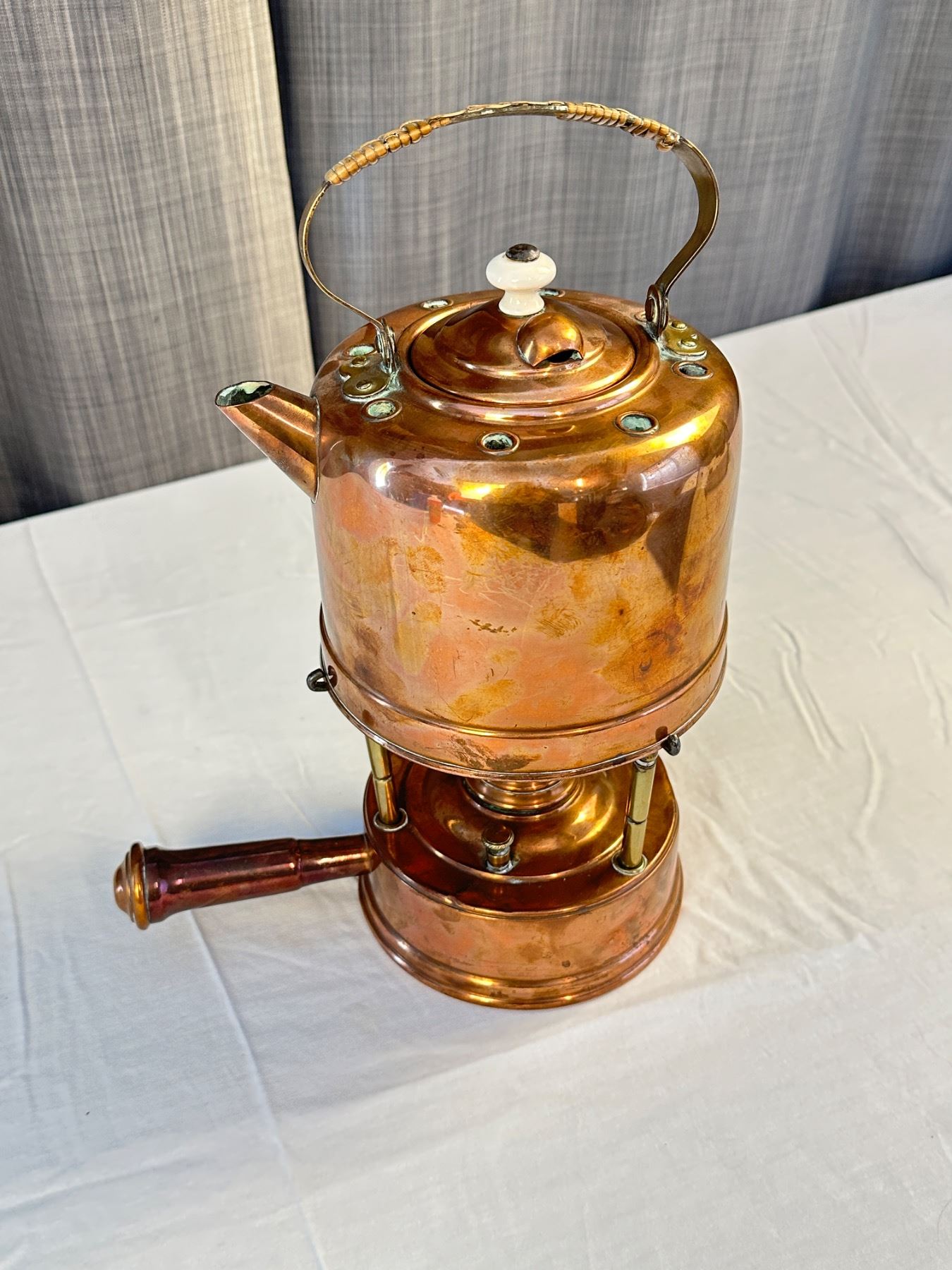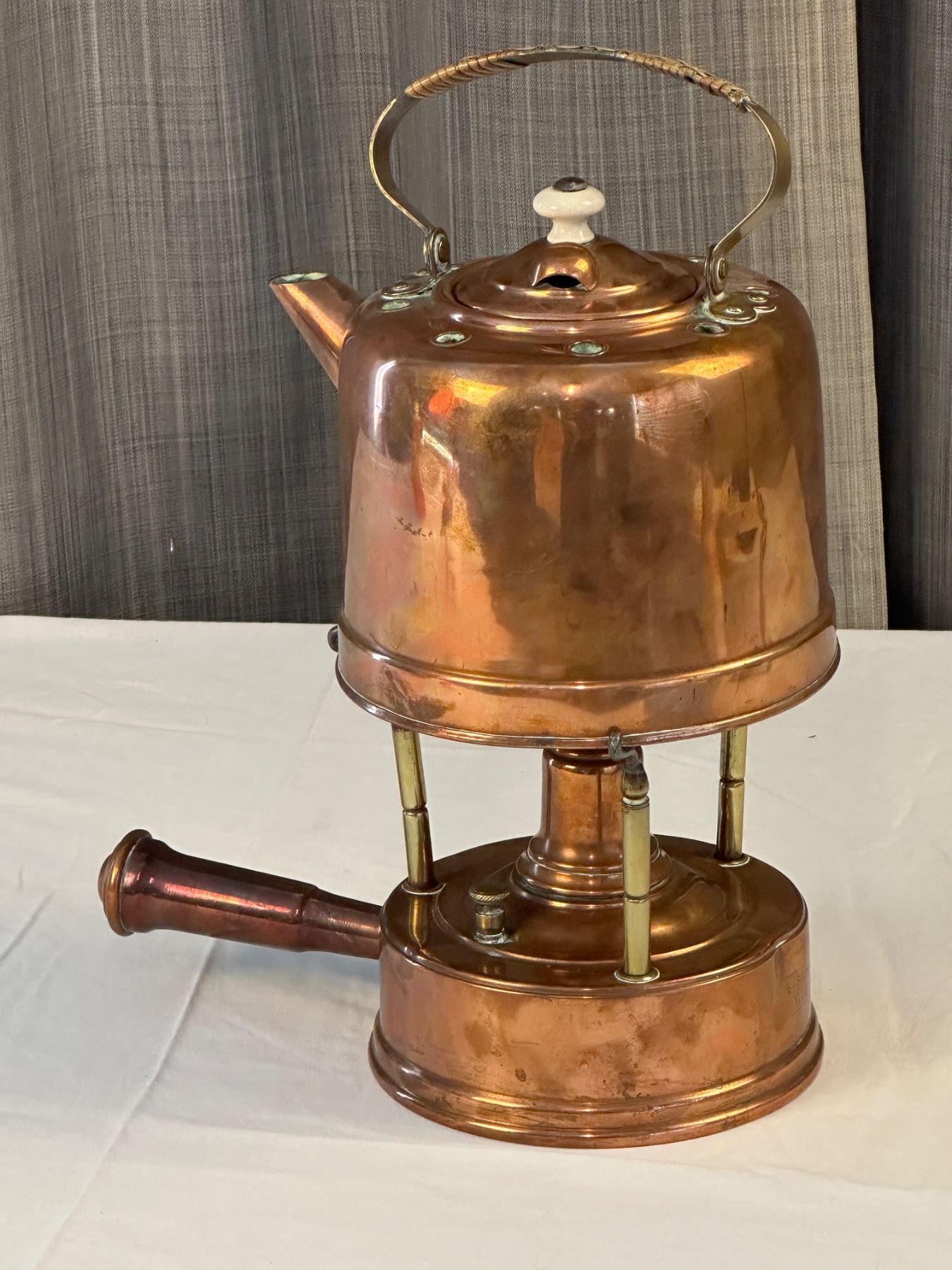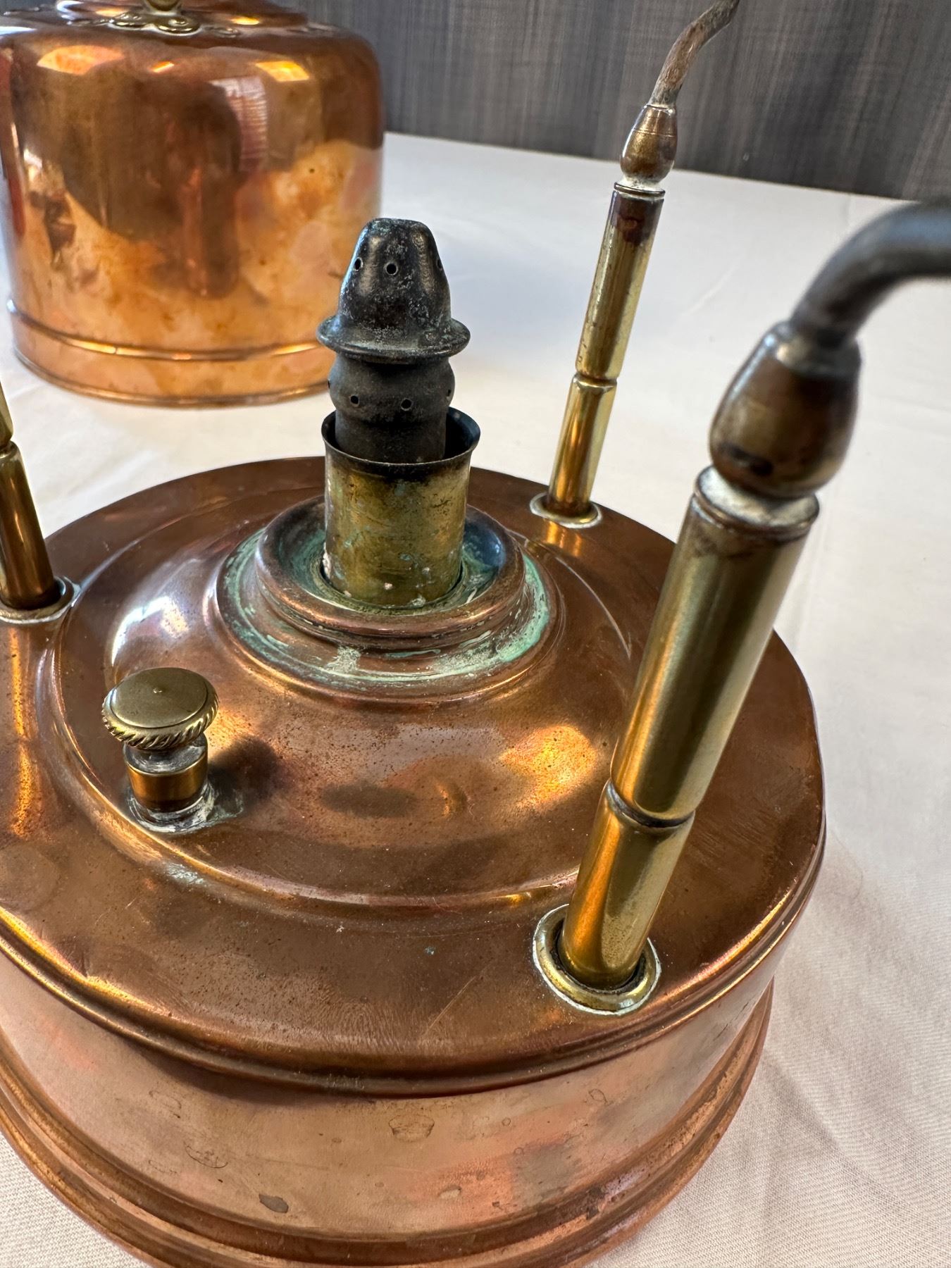 Vintage brass Primus-style kerosene pressure stove equipped with a matching copper teapot.