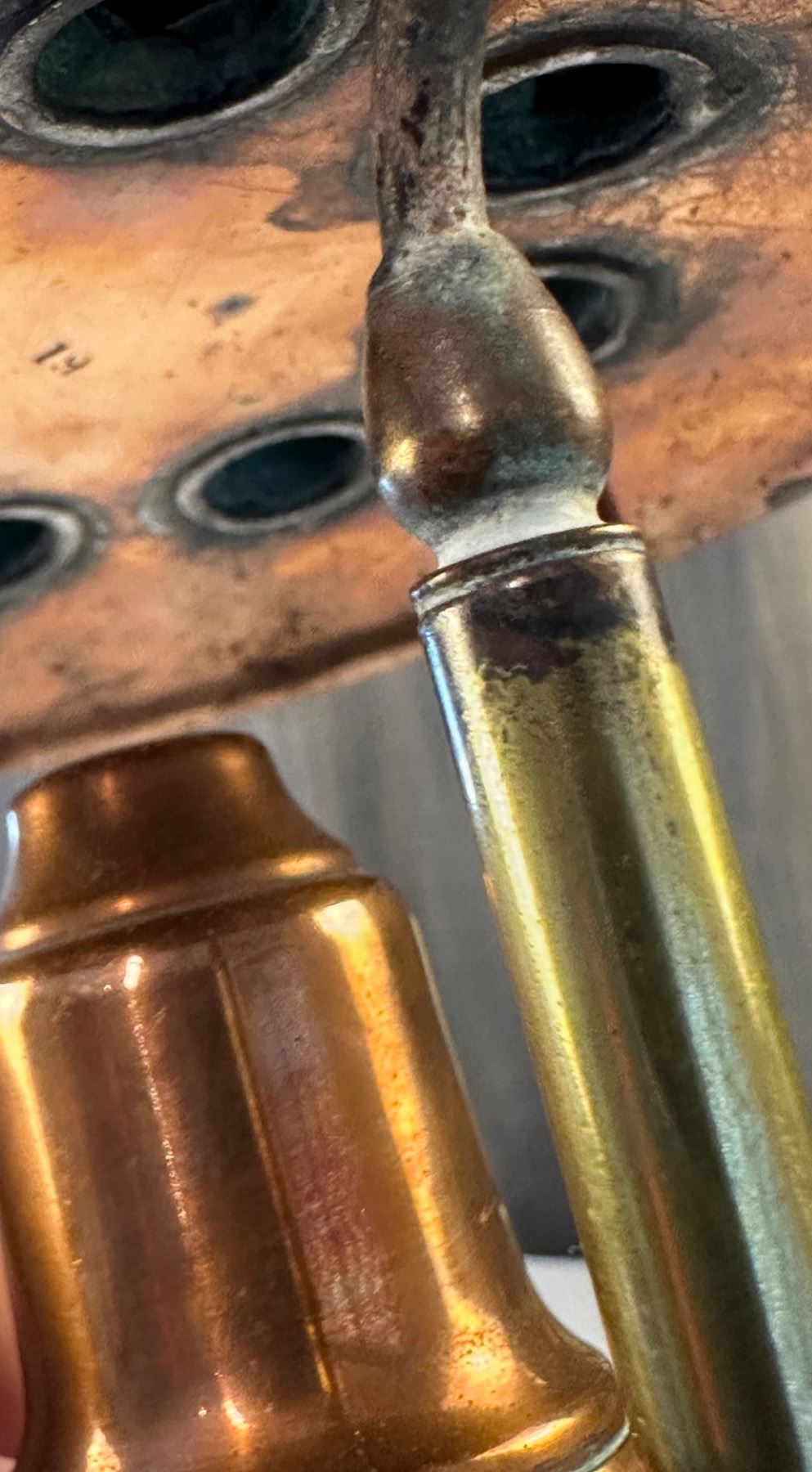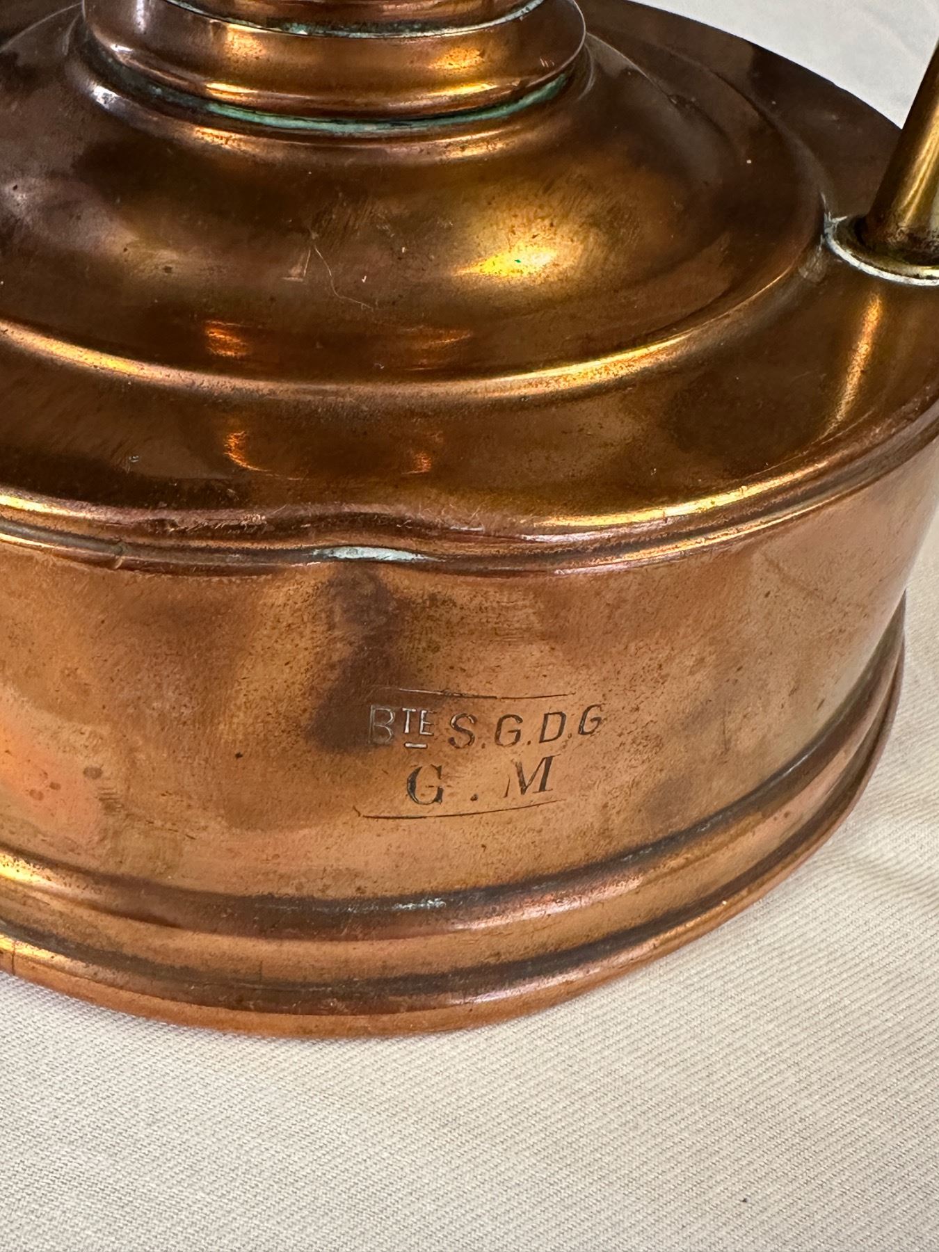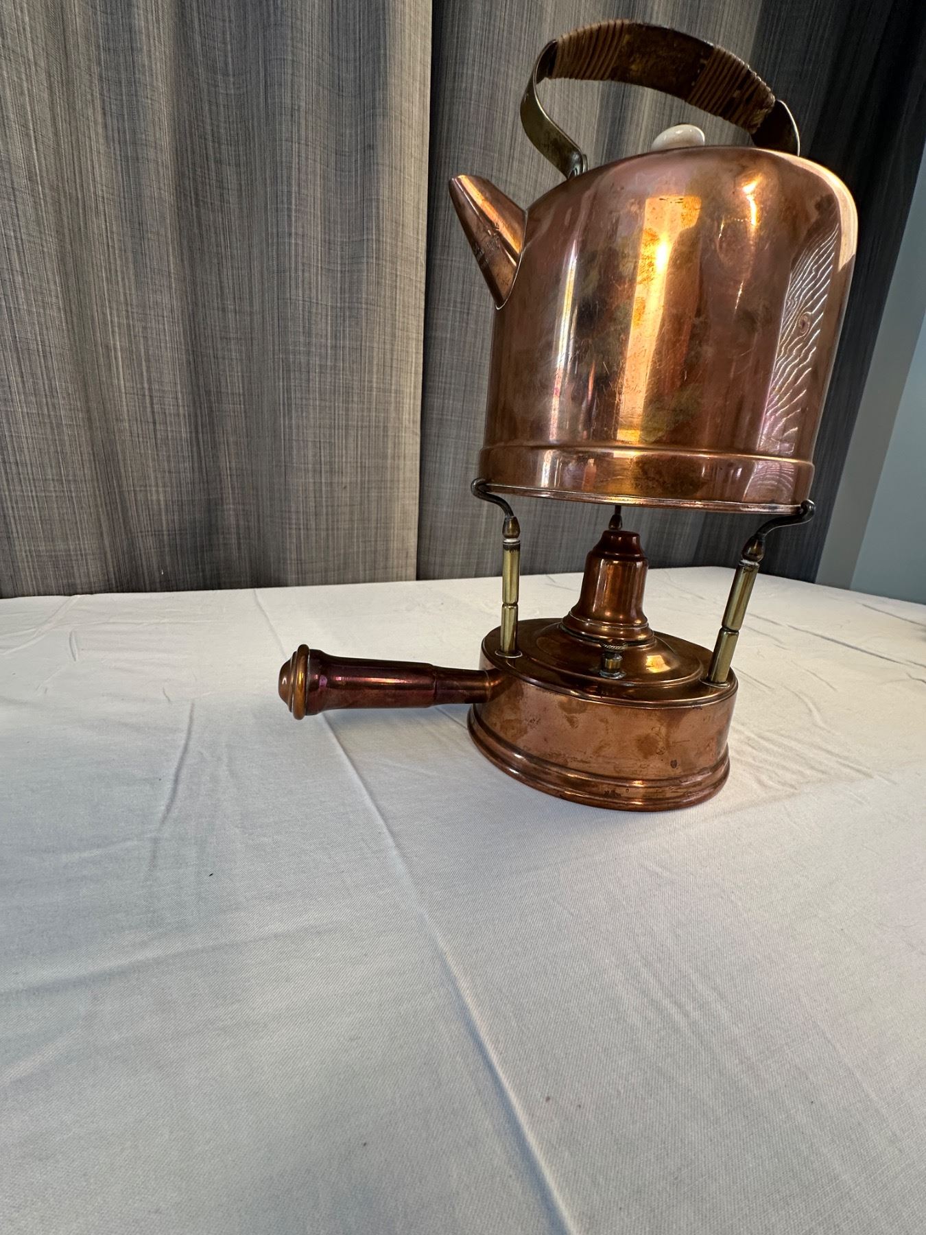 Vintage brass Primus-style kerosene pressure stove equipped with a matching copper teapot.