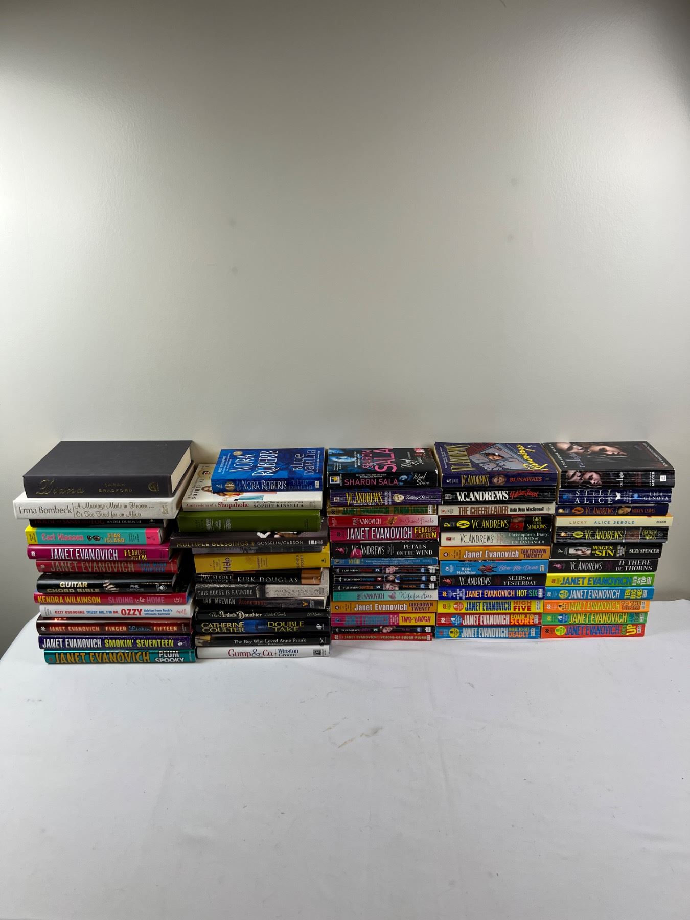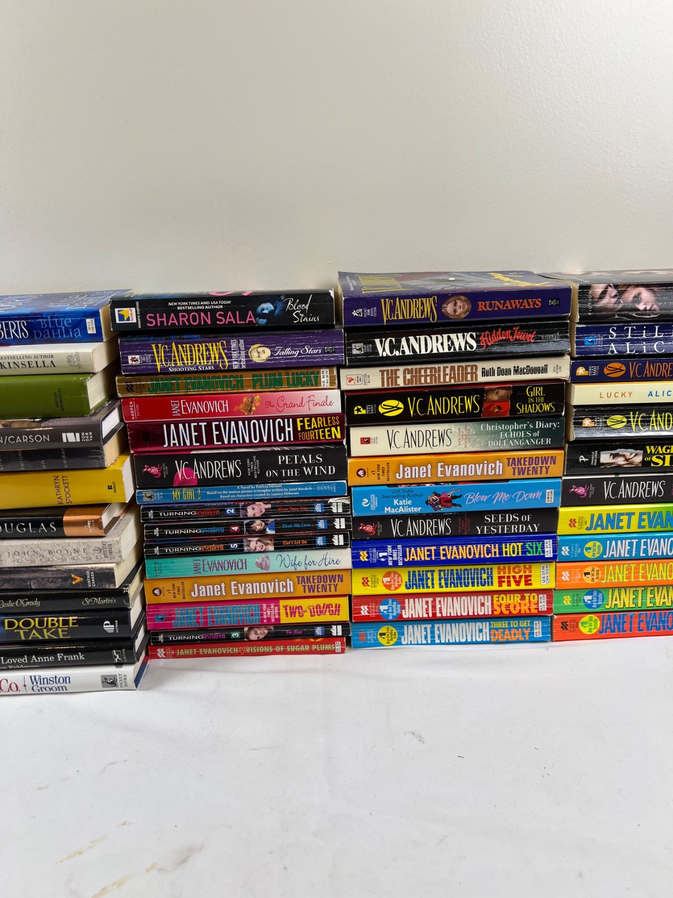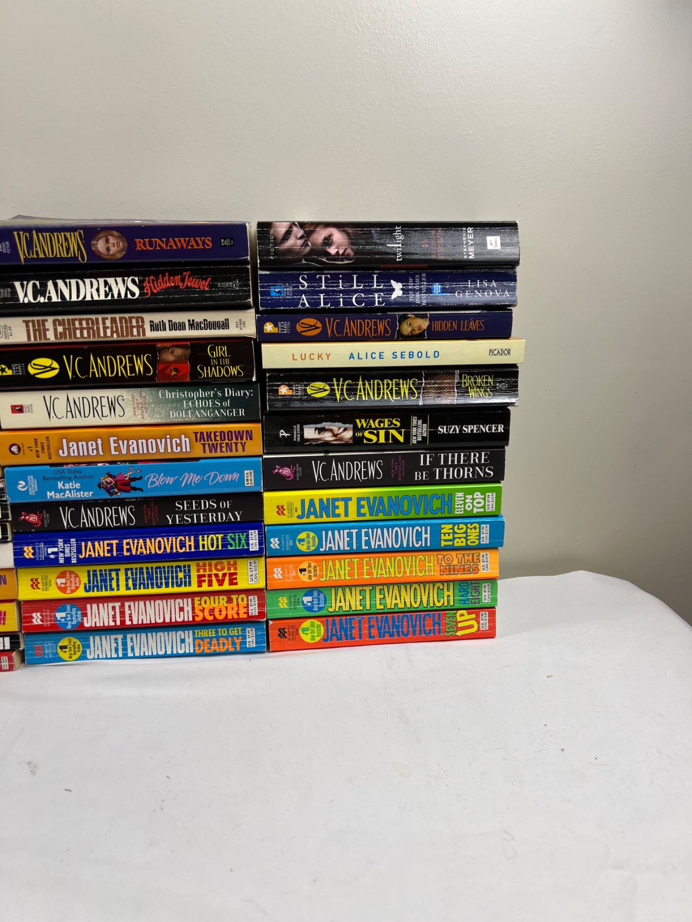Variety of authors, however Janet Evanovich and VC Andrews are most common. Includes a soft cover of Twilight.