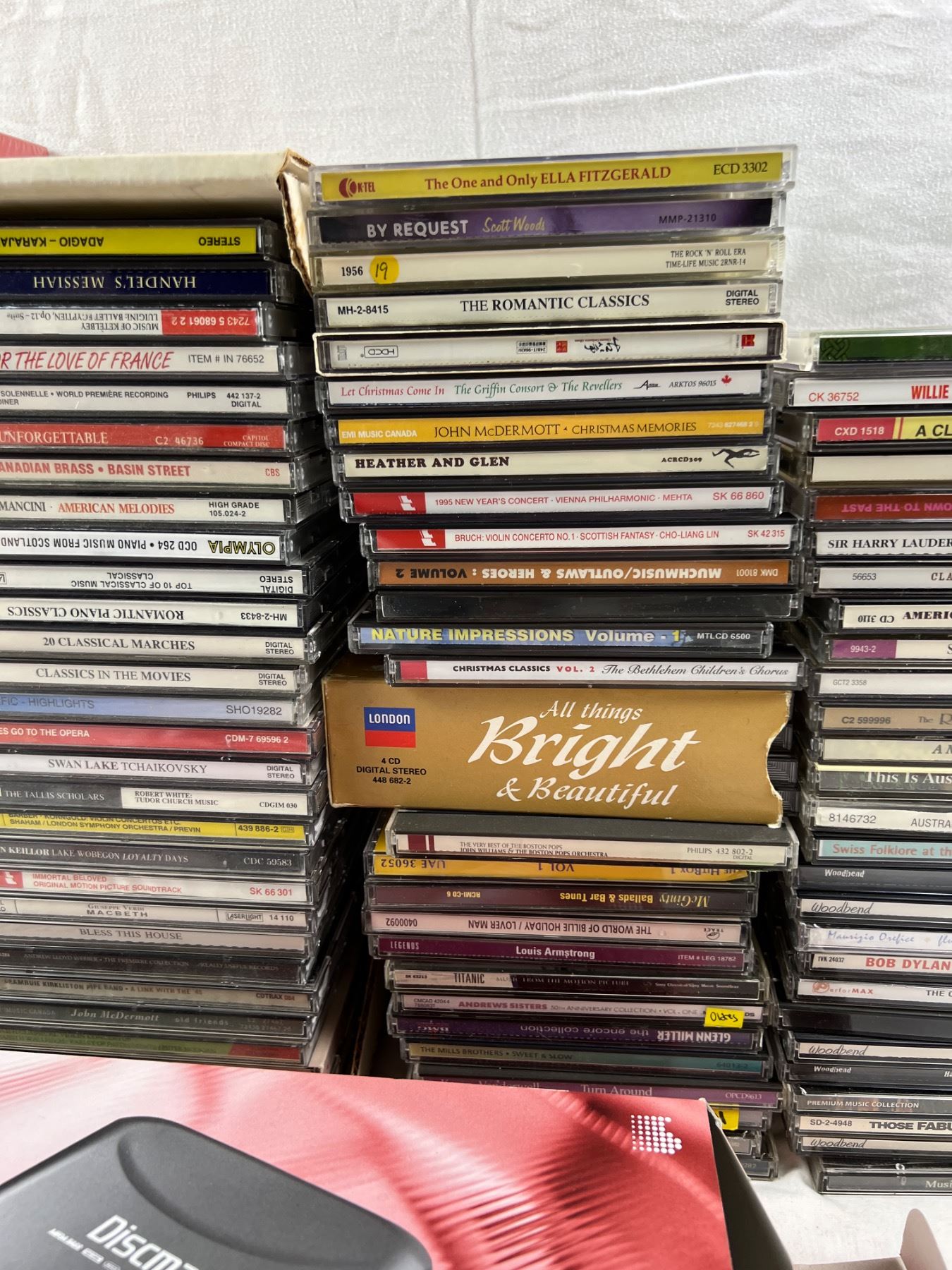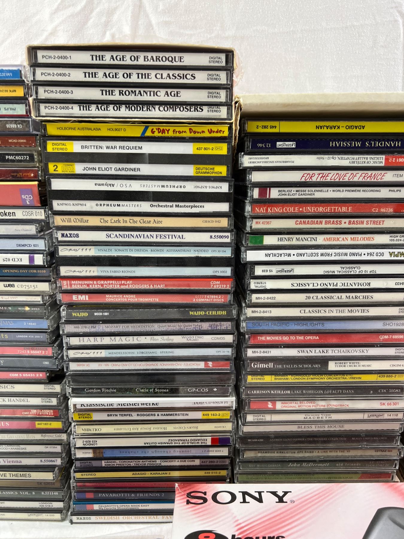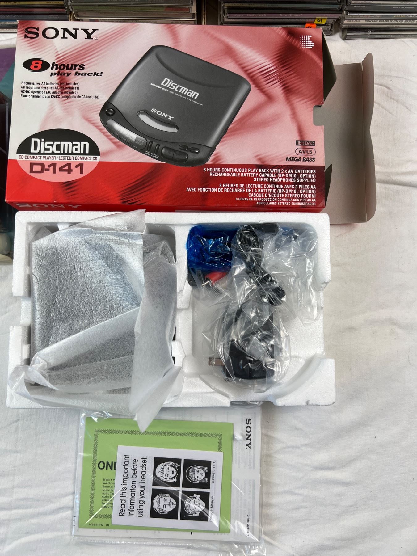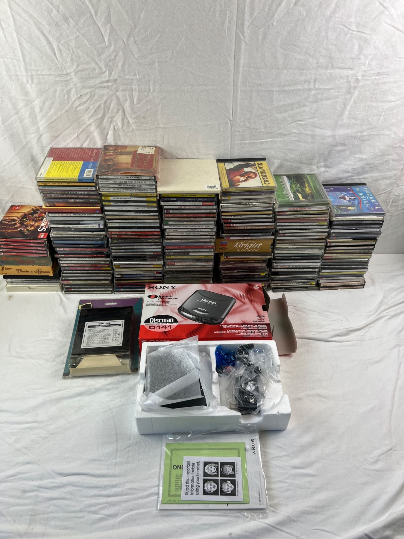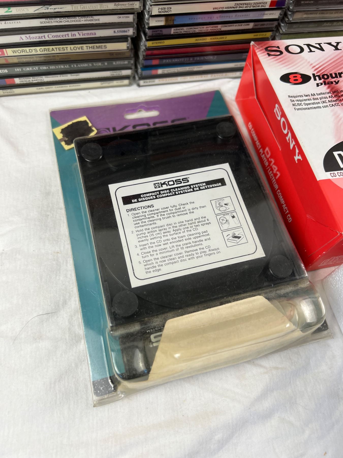 Includes an assortment of genres and artists, Sony Discman D-141 (new in open box), Koss Compact Disc Cleaning System, and more