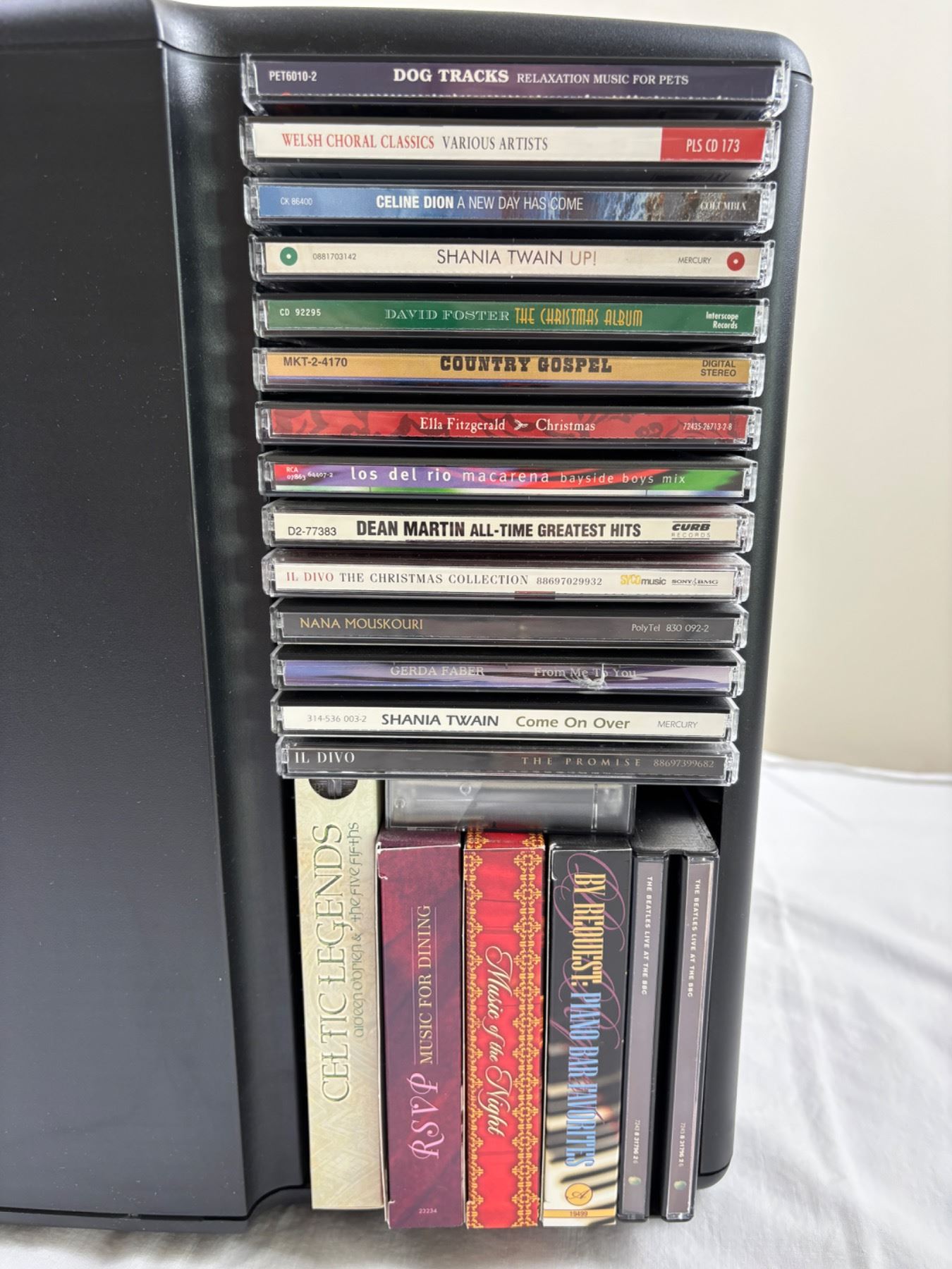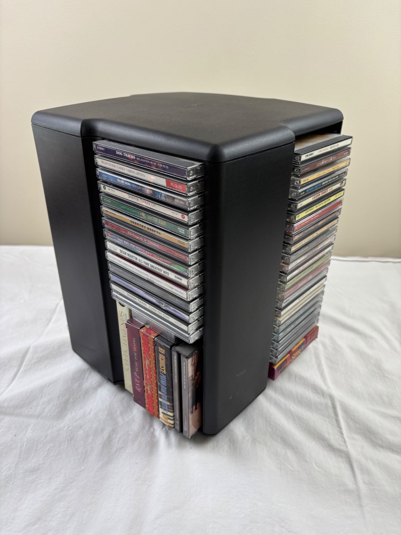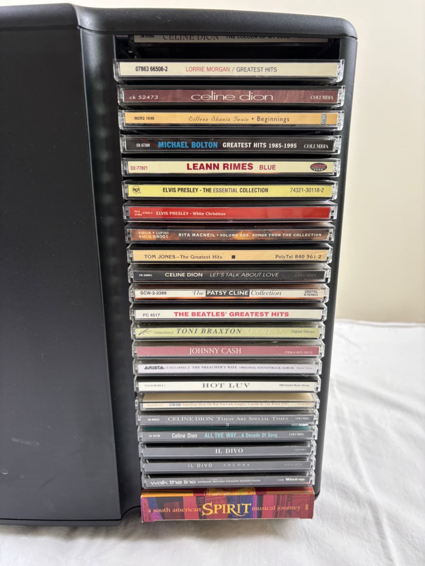 Includes a LaserLine CD Rack (11"L x 11"W x 14"H), Various artists like Celine Dion, Dolly Parton, Garth Brooks, and more