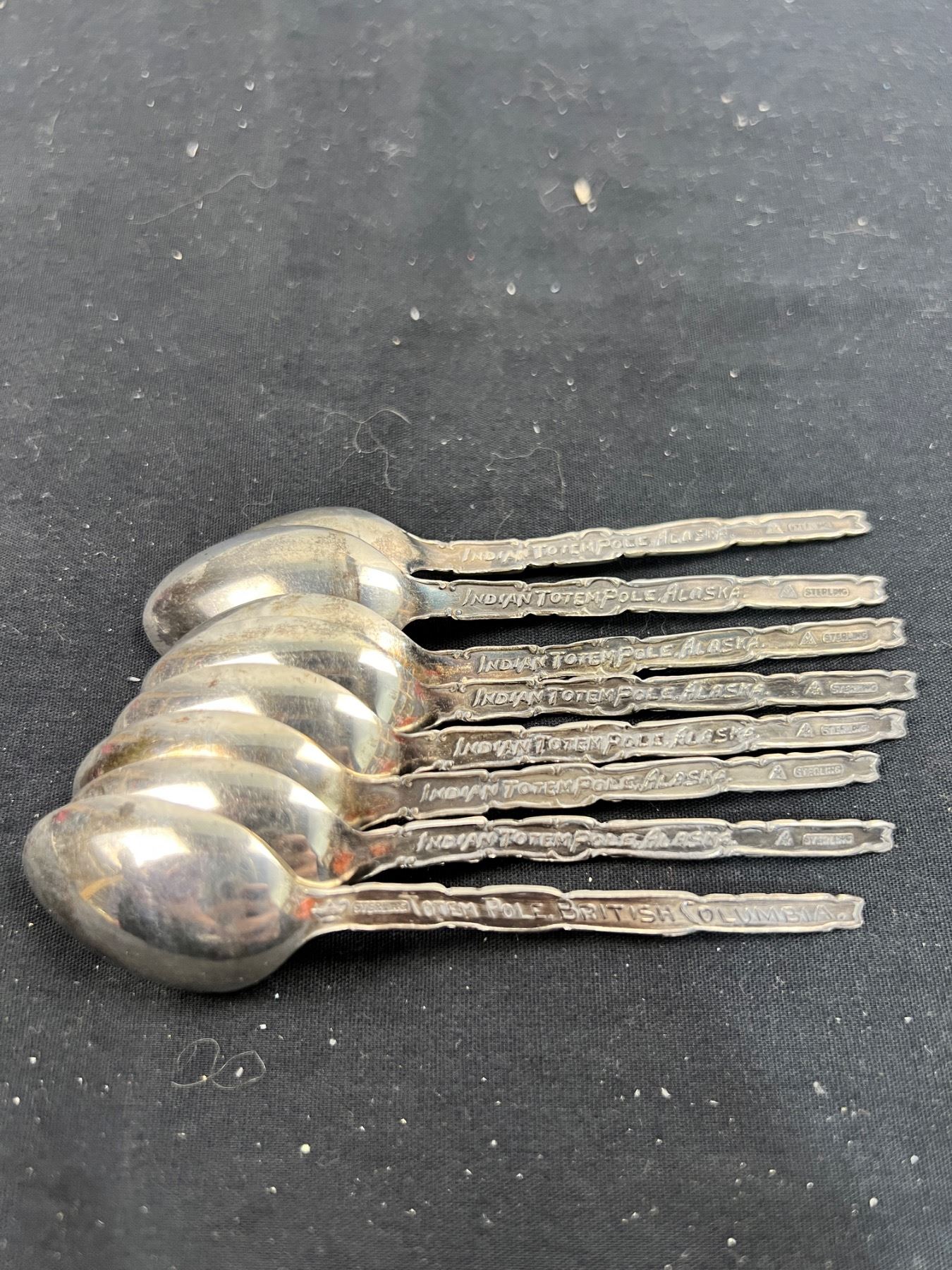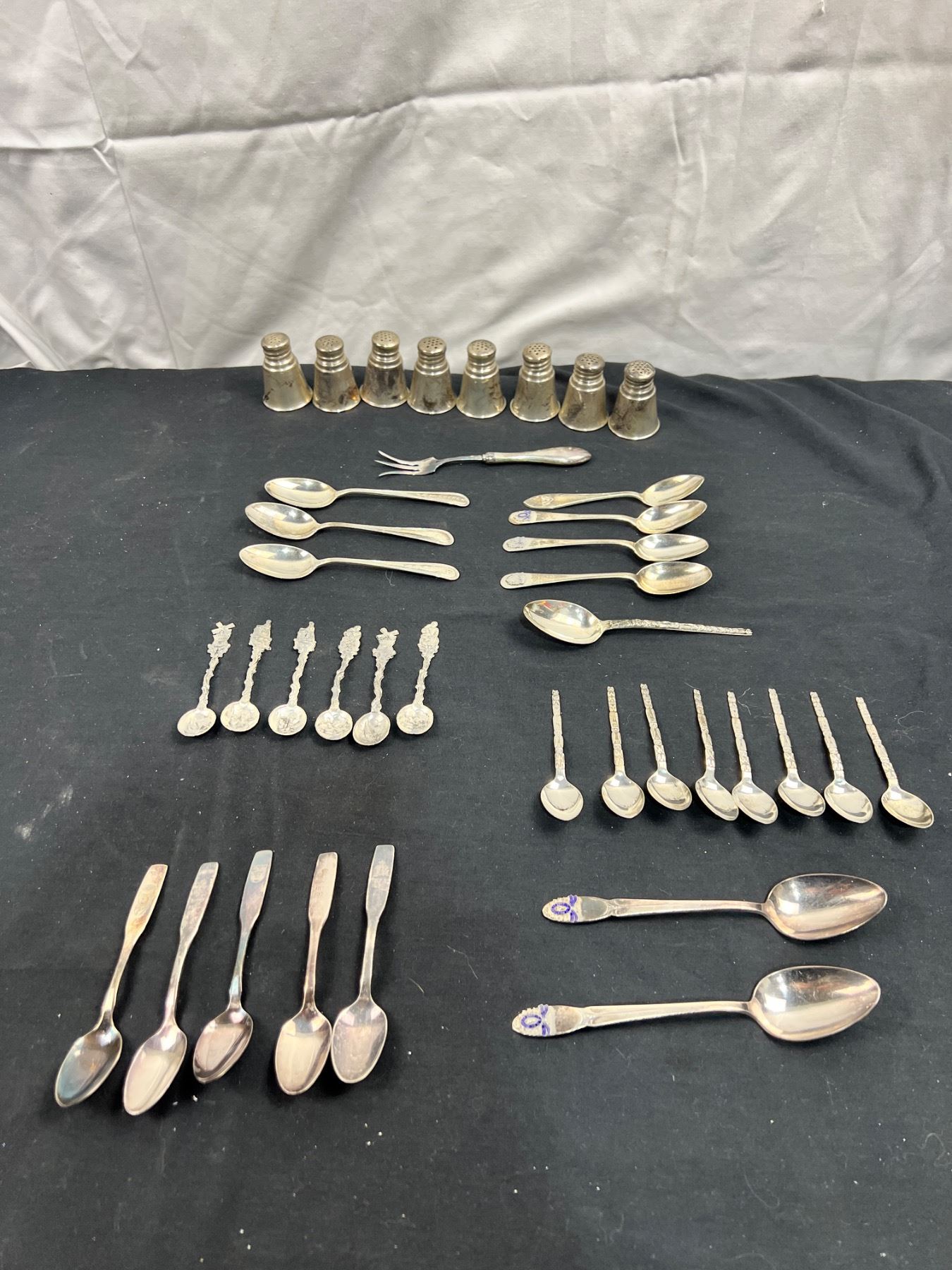 Includes, Seven plated spoons (4.5oz), Assortment of sterling stamped spoons and eight International Sterling salt & pepper shakers with a total weight of 0.9lbs / 14.5oz