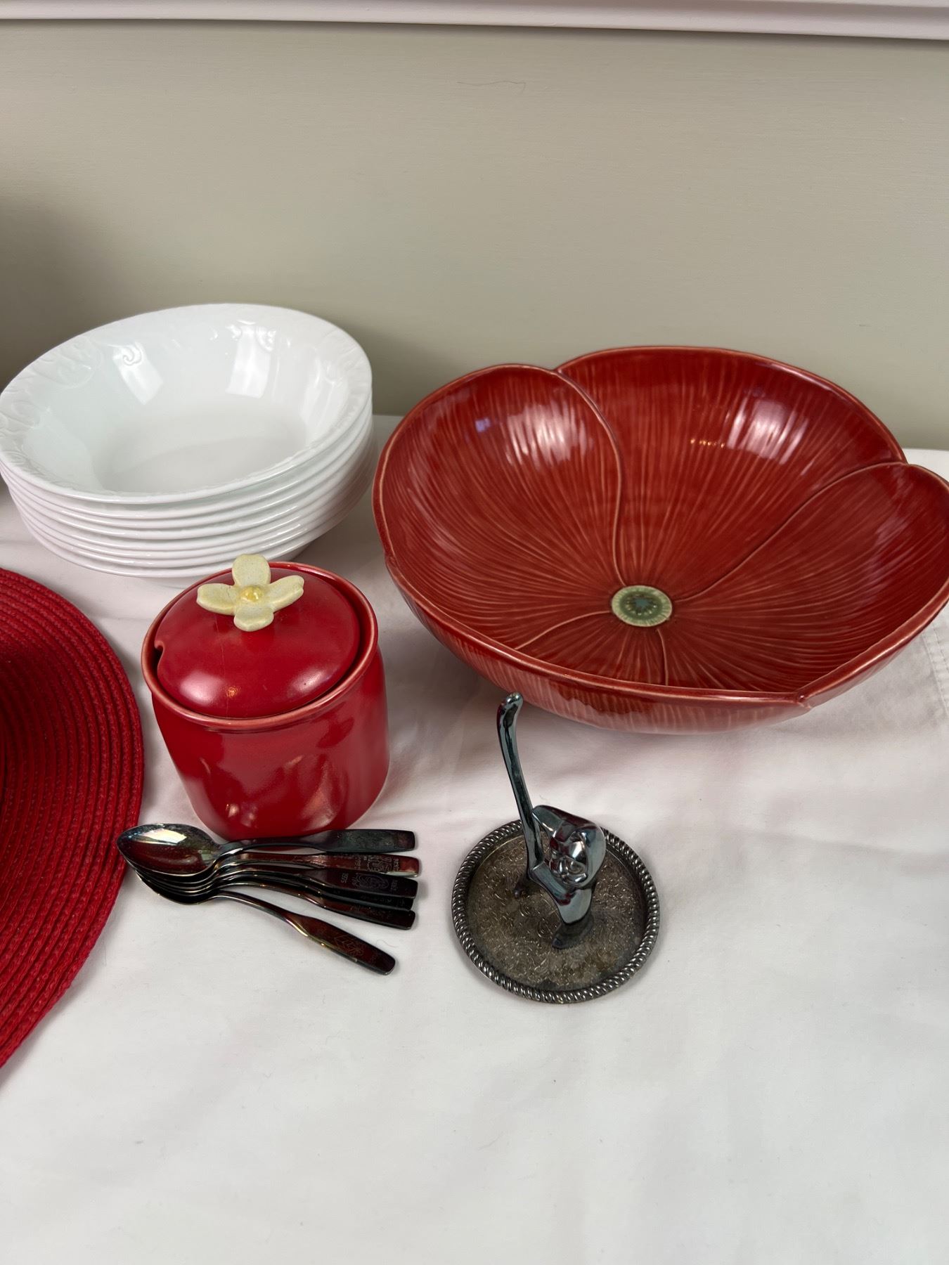 Includes, Plated tea spoons (two Birks E.P Brass), Pottery pieces by Whitney Smith (the lid has a small crack), Indigo Pitcher (7.5"H), Corelle Bowls, and more