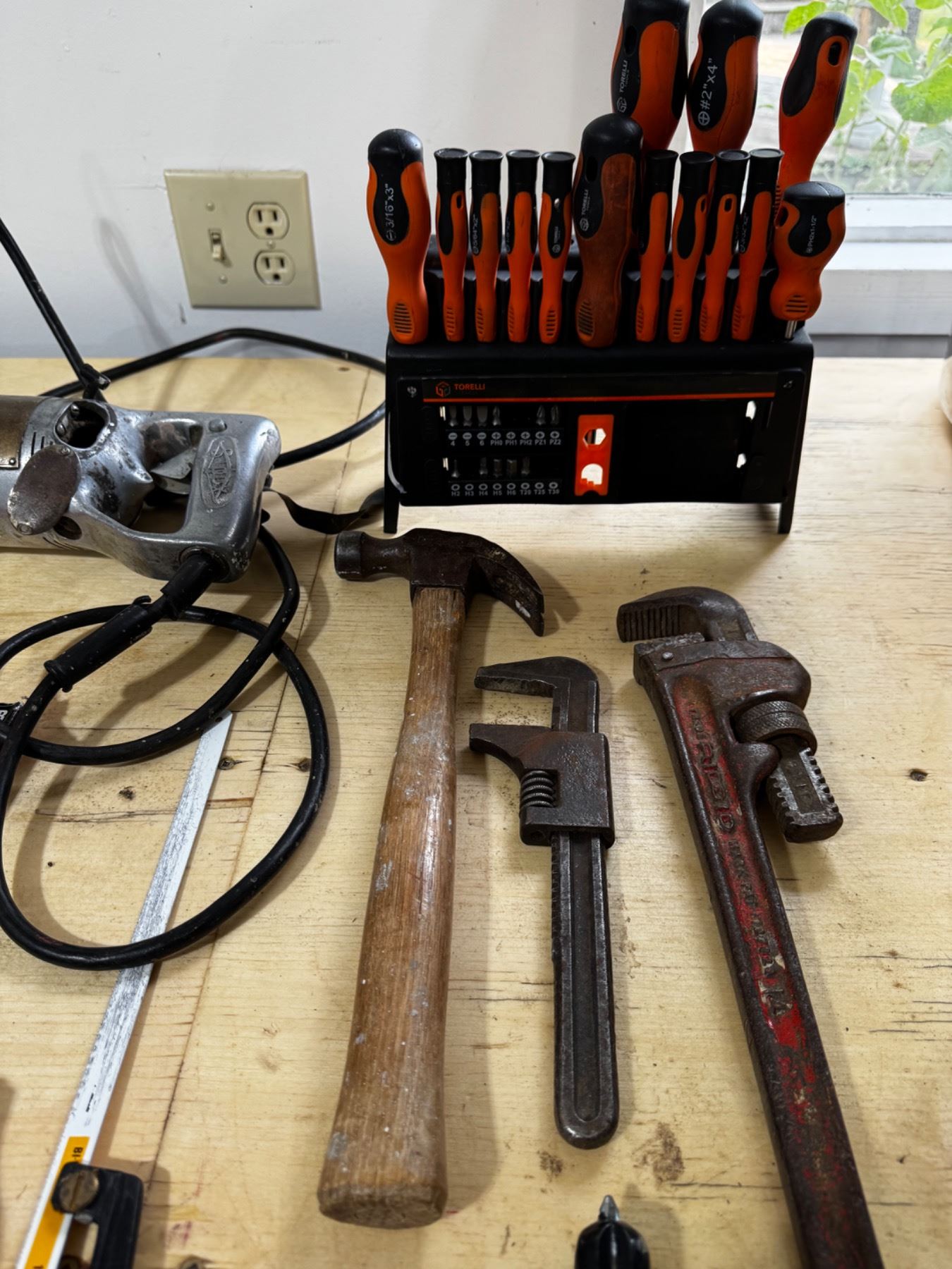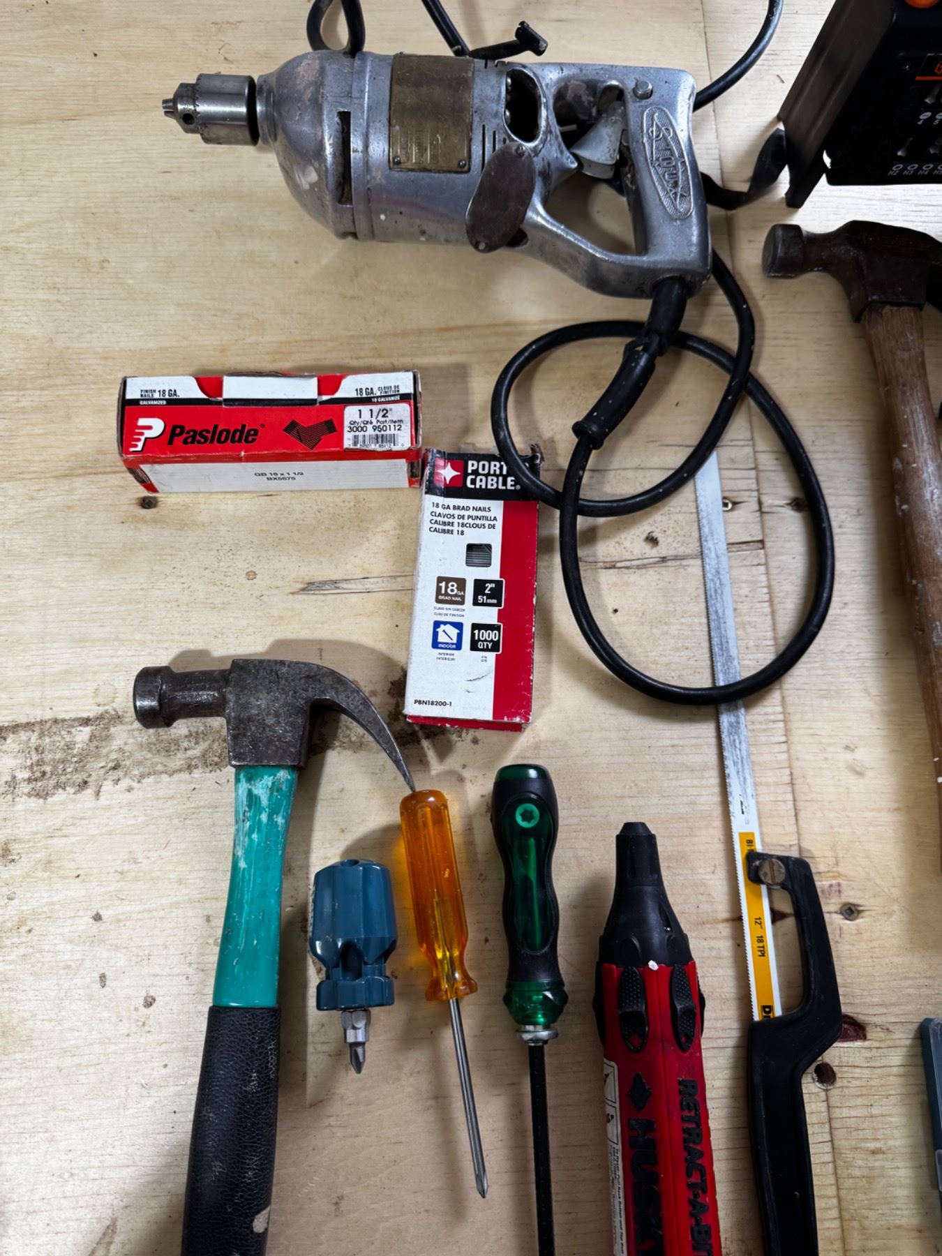 Vintage drill, Husky Retract-a-bit, Toelli tool set, etc