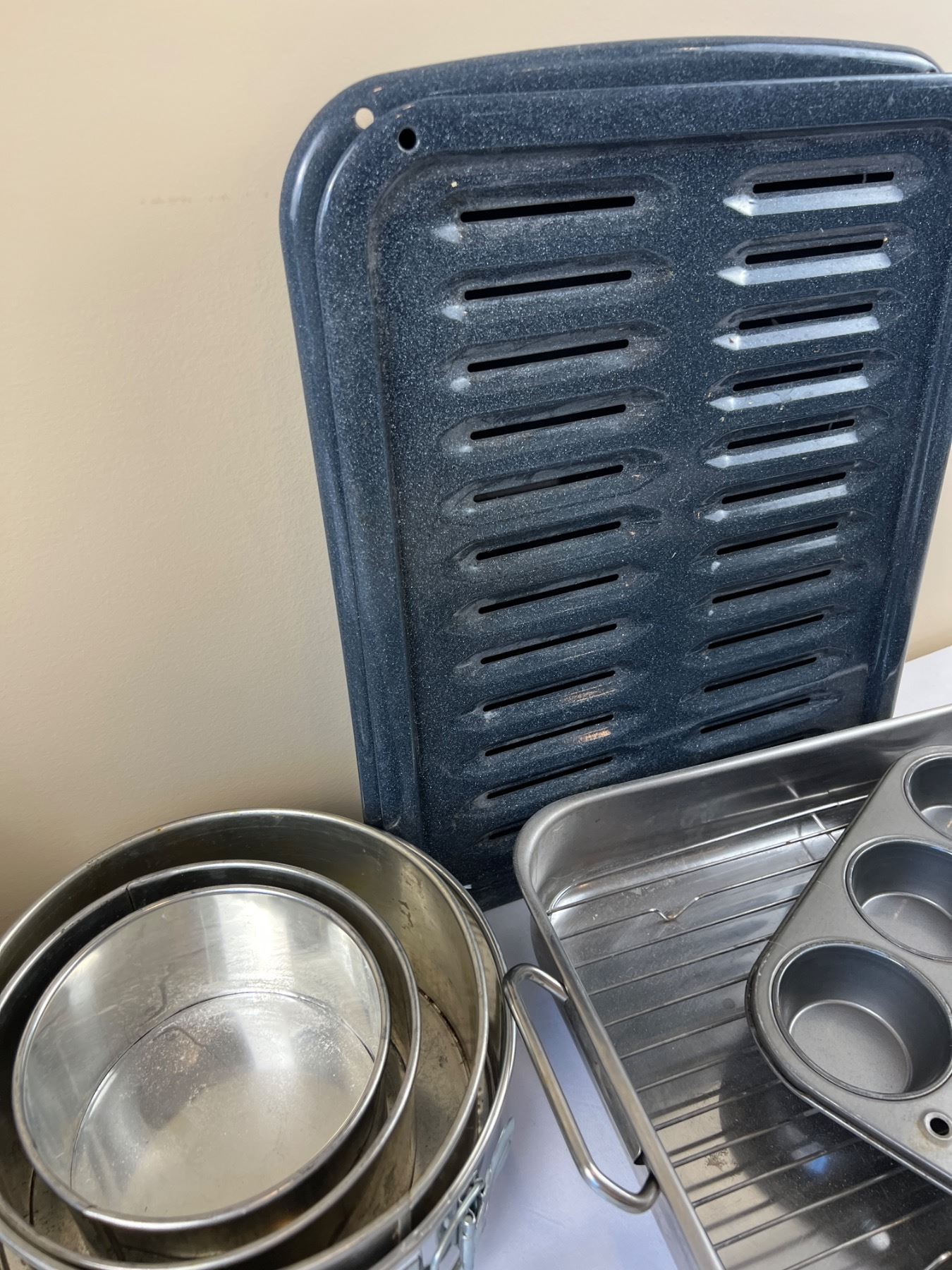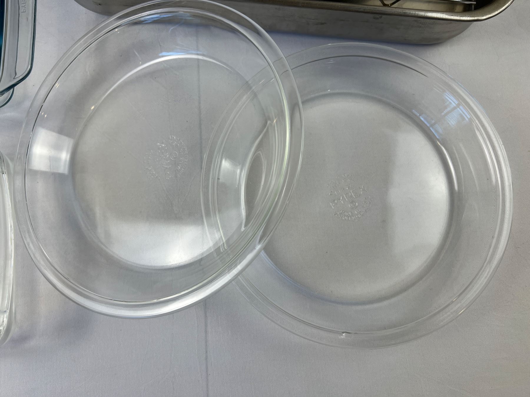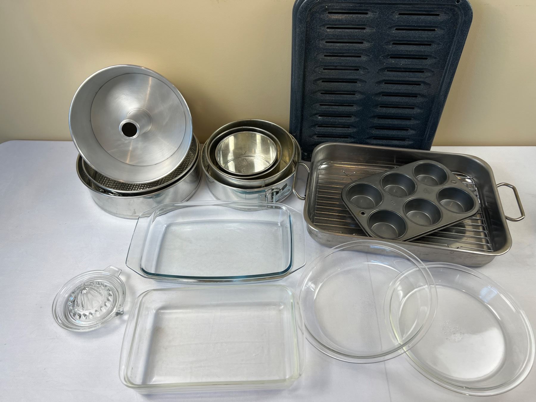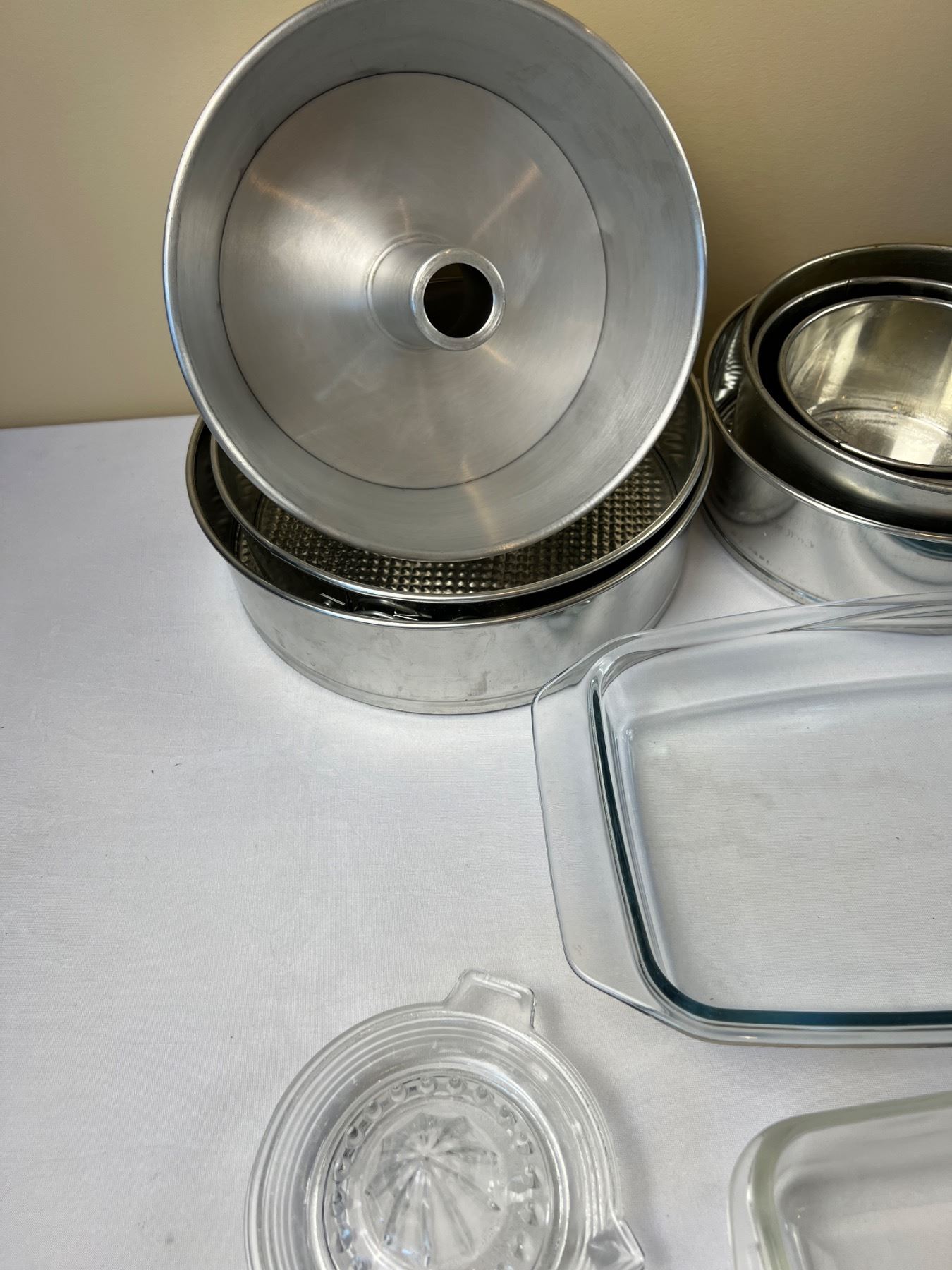 Includes Pyrex (one pie plate is chipped), springform pans, glass lemon juicer and more