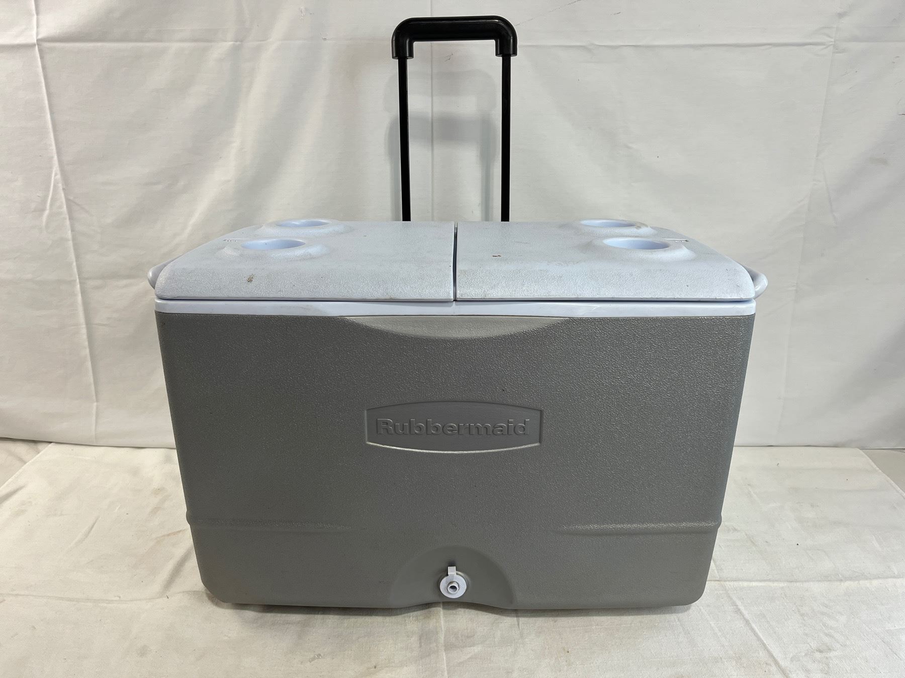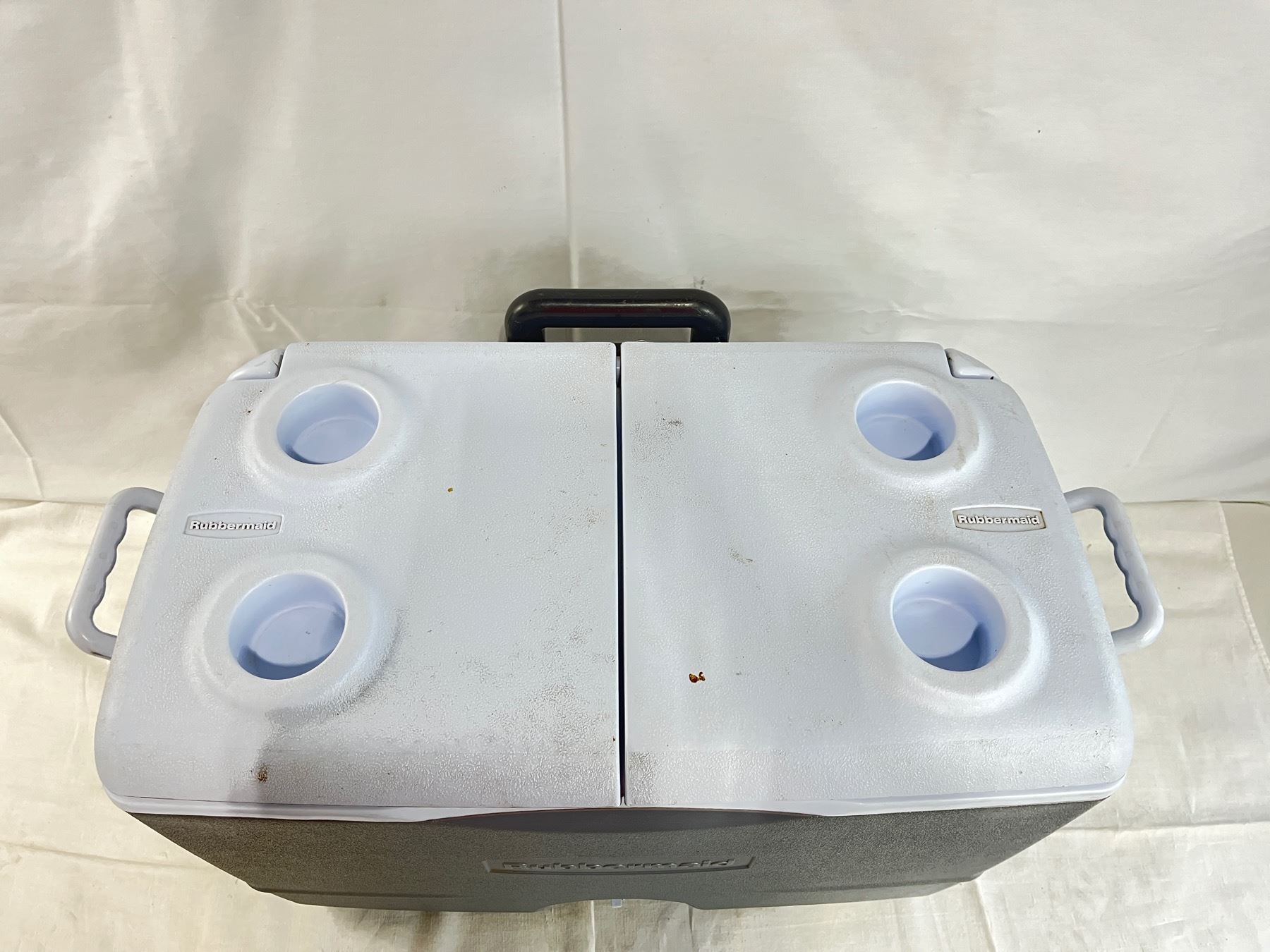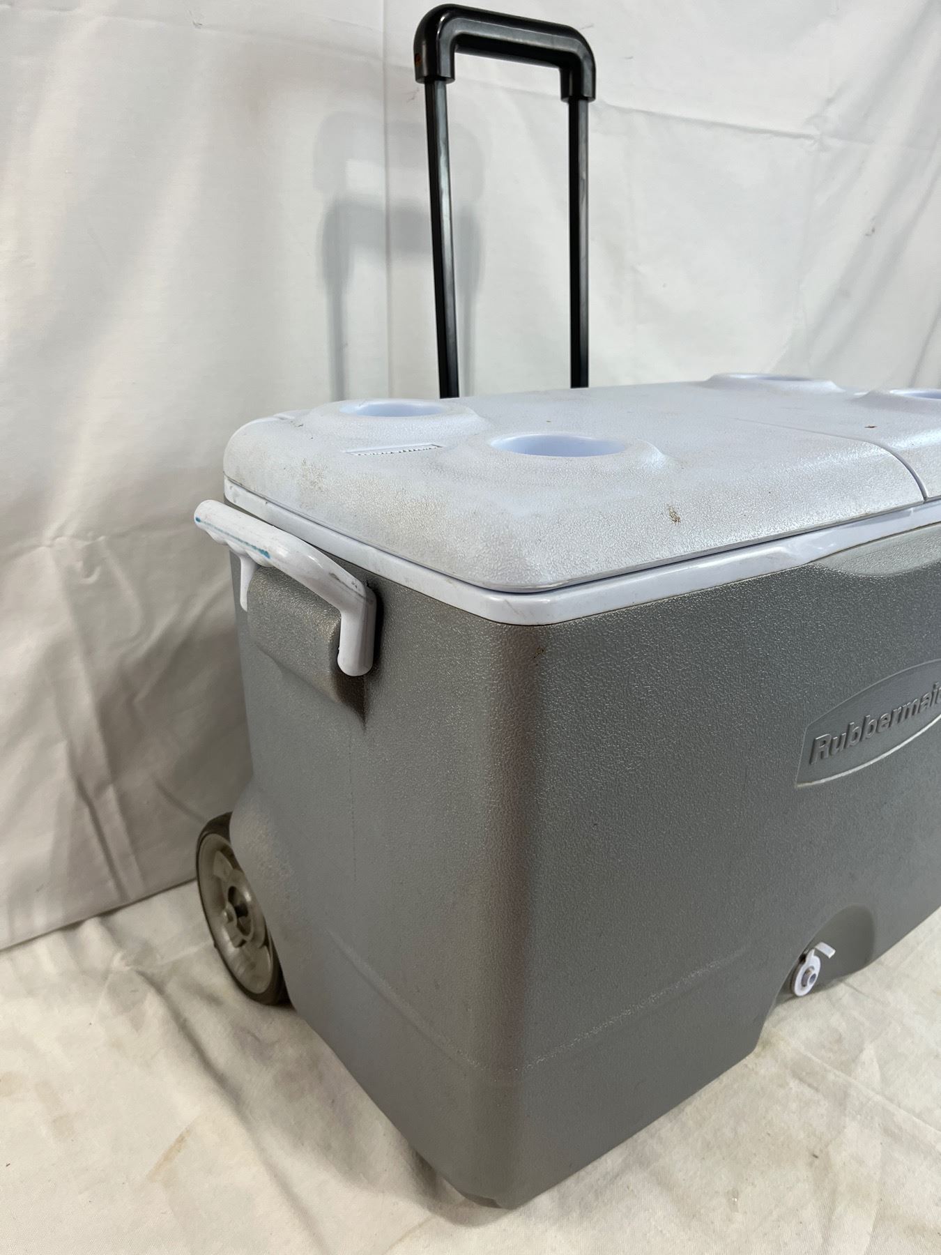 Rubbermaid Cooler 18.5" T x 28" L x 15.5" W on wheels has some wear, stains and a dent in bottom corner.