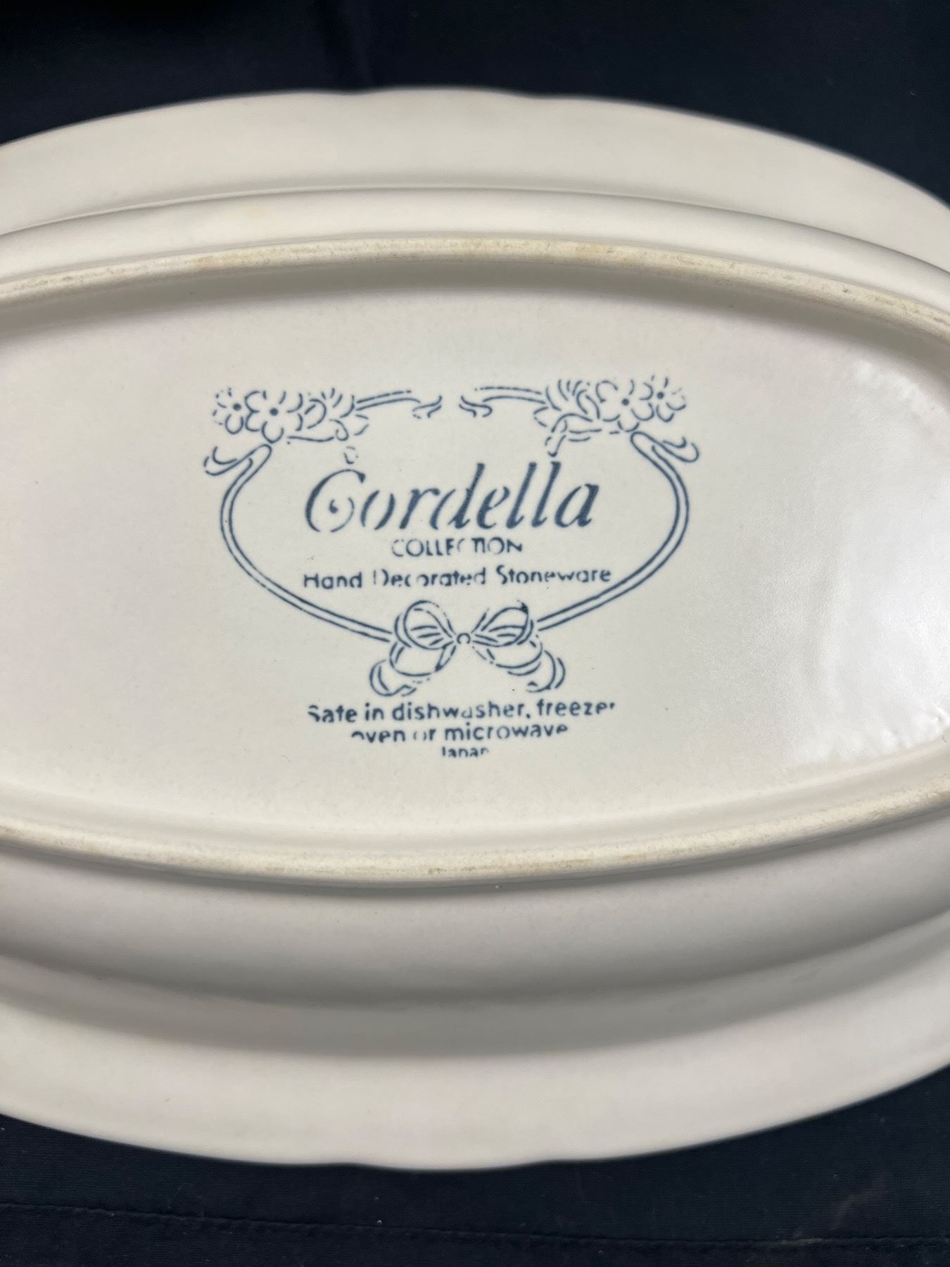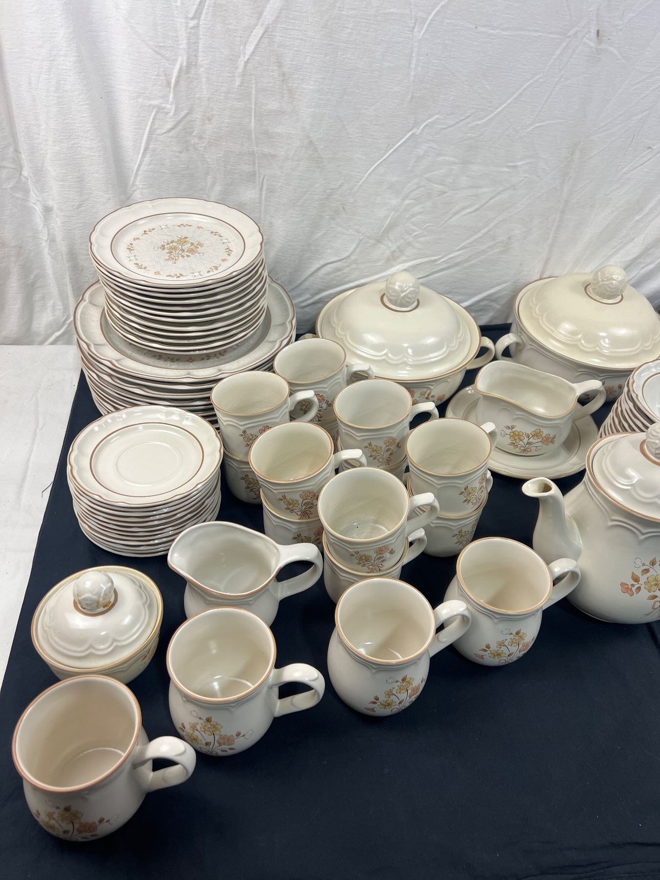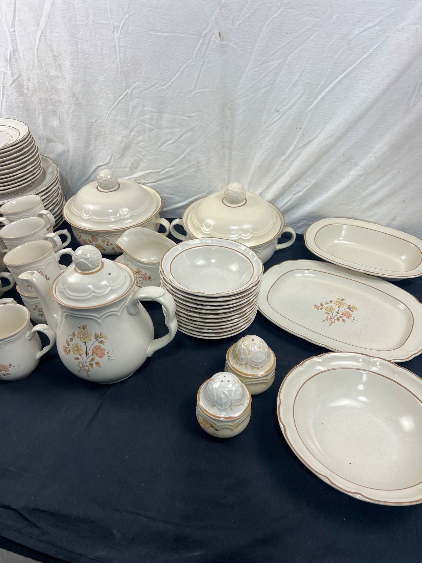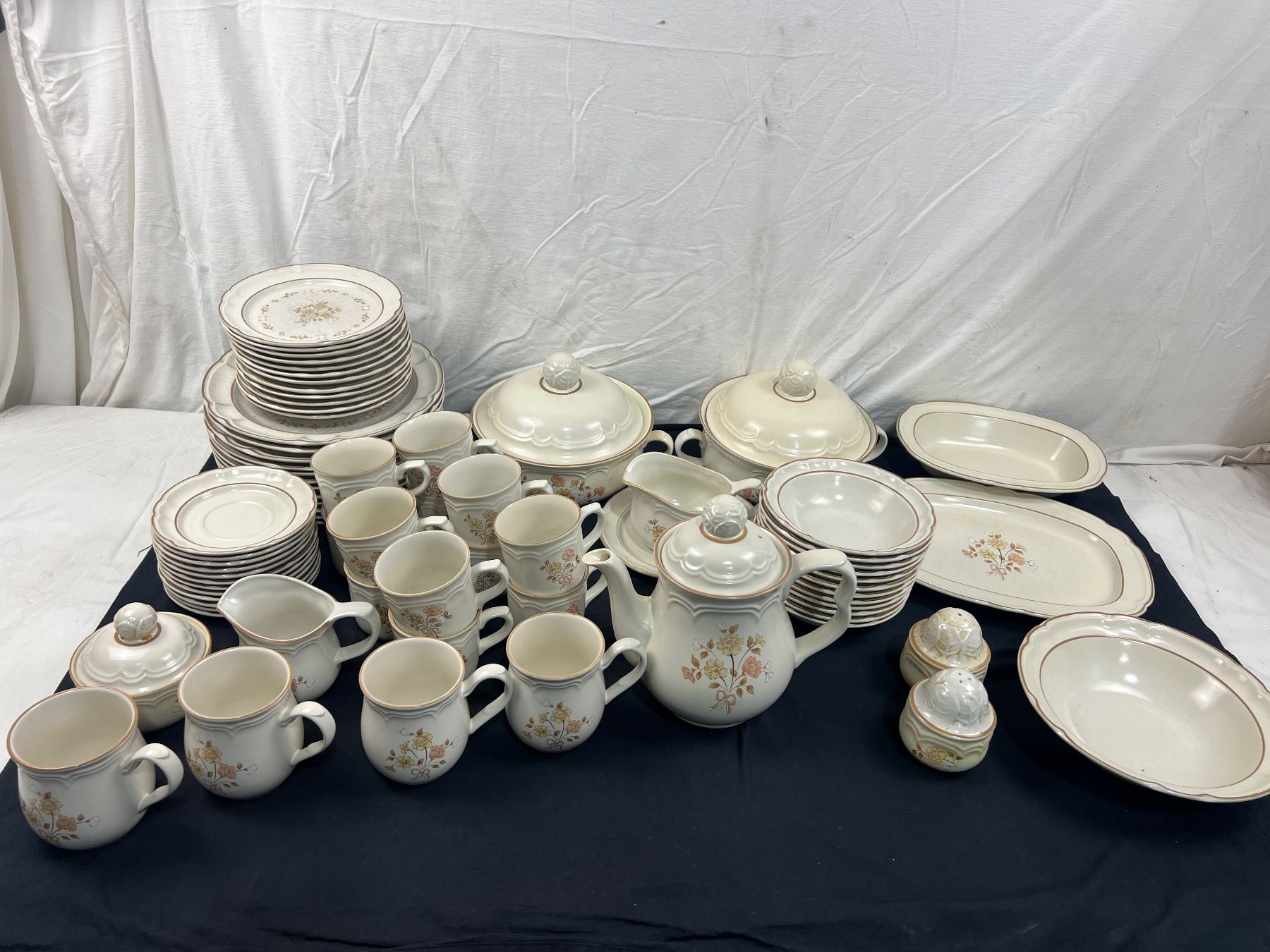 Includes 12 Dinner Plates, 1 Serving Platter, 1 Serving Bowl, Salt & Pepper Shakers, Tea Pot, 12 Side Plates, 12 Bowls, 12 saucers, 1 Oval Serving Dish, Gravy Boat & Drip Plate, Cream & Sugar, 4 Coffee Mugs, 12 Tea Cups & 2 Serving Dishes With Lids