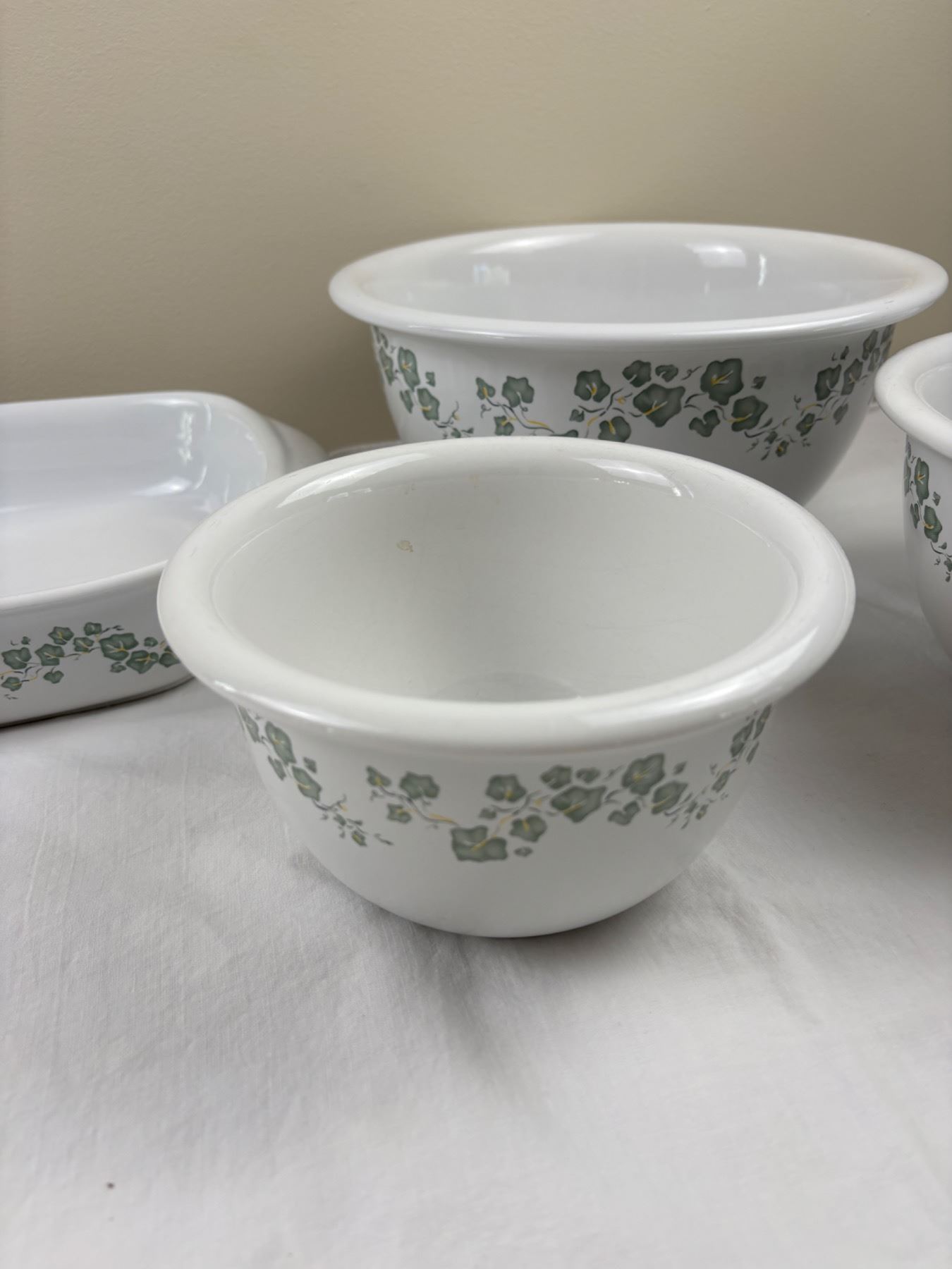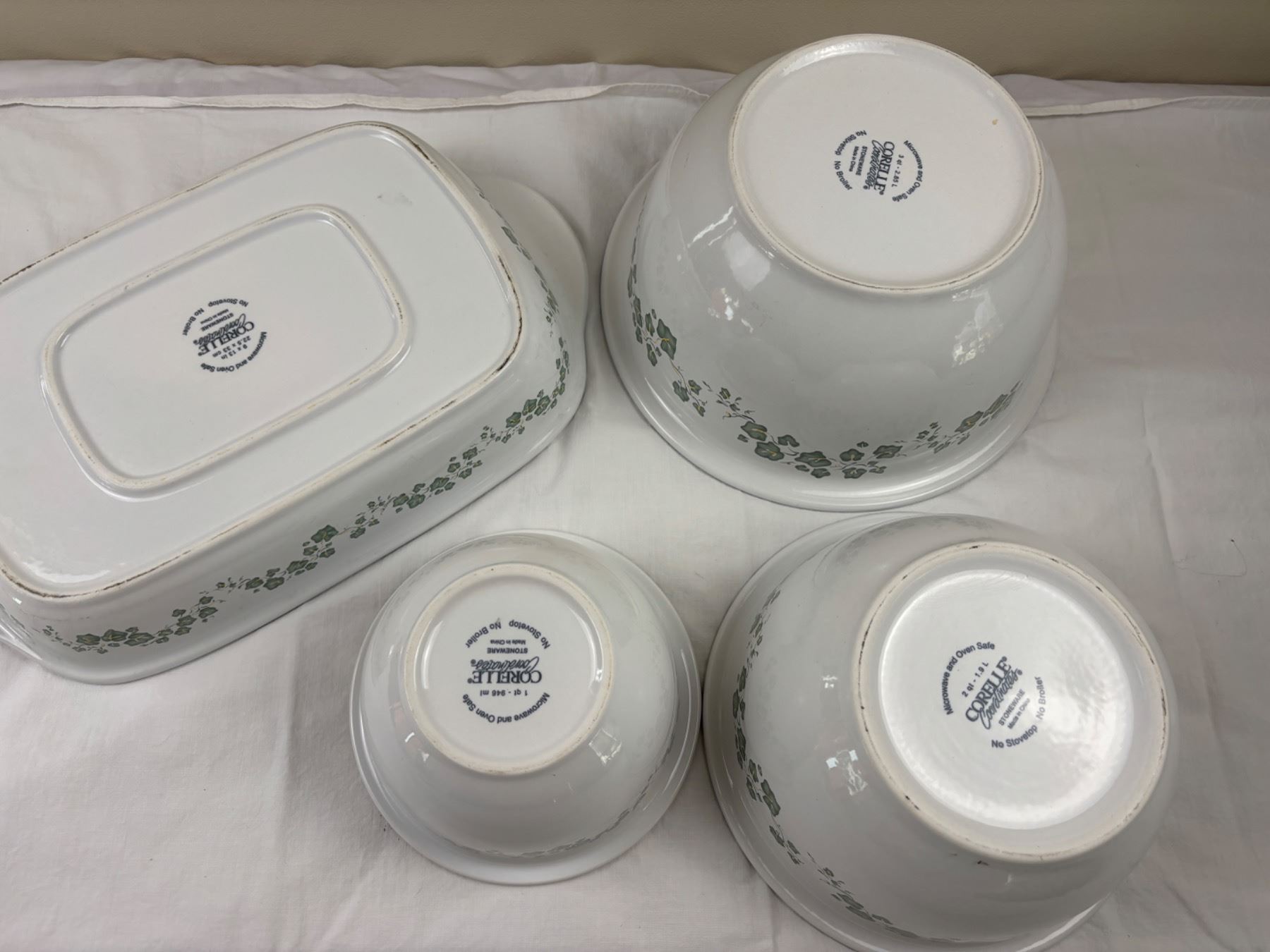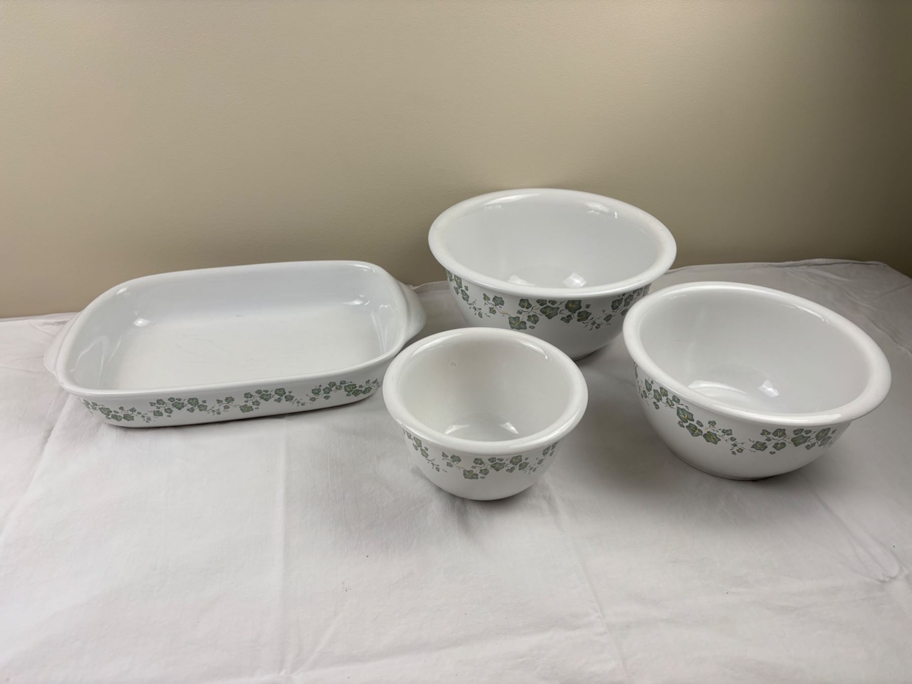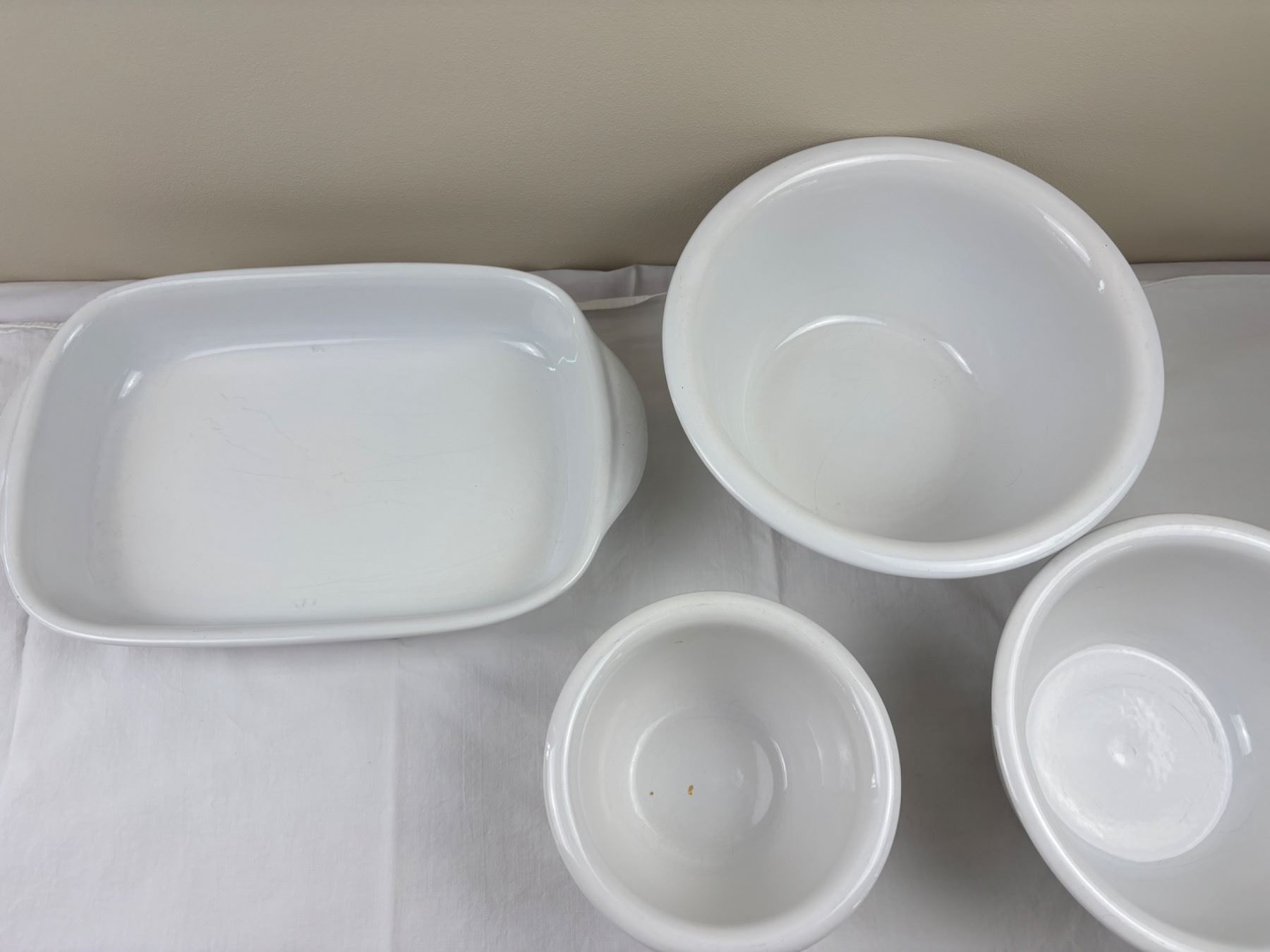Includes a set of three bowls (1qt-2qt-3qt), and a 9x13" rectangular dish, some scuffs and wear