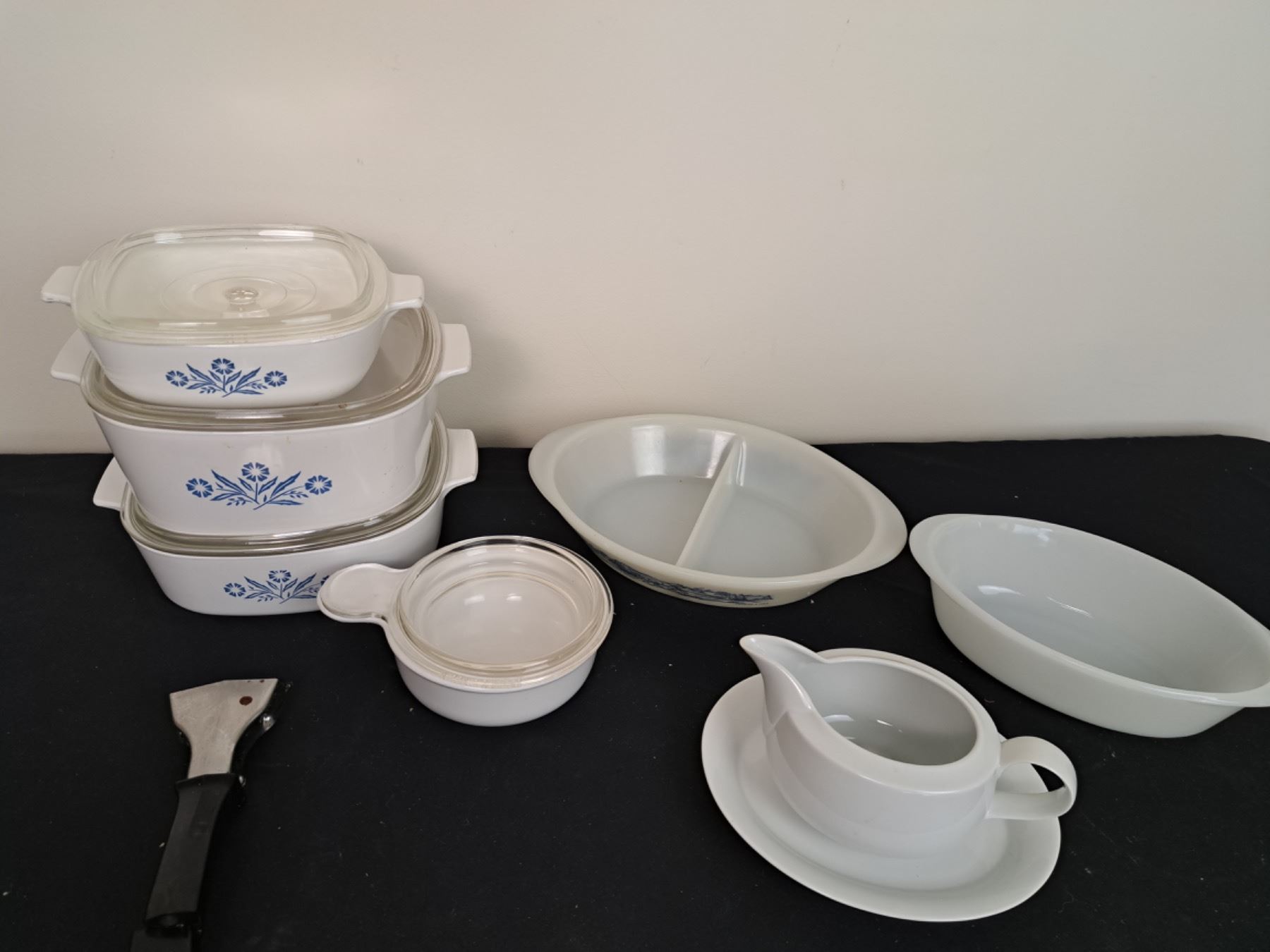 Includes Stokes Gravy Boat, Cornflower Pattern Corningware, & Glassbake