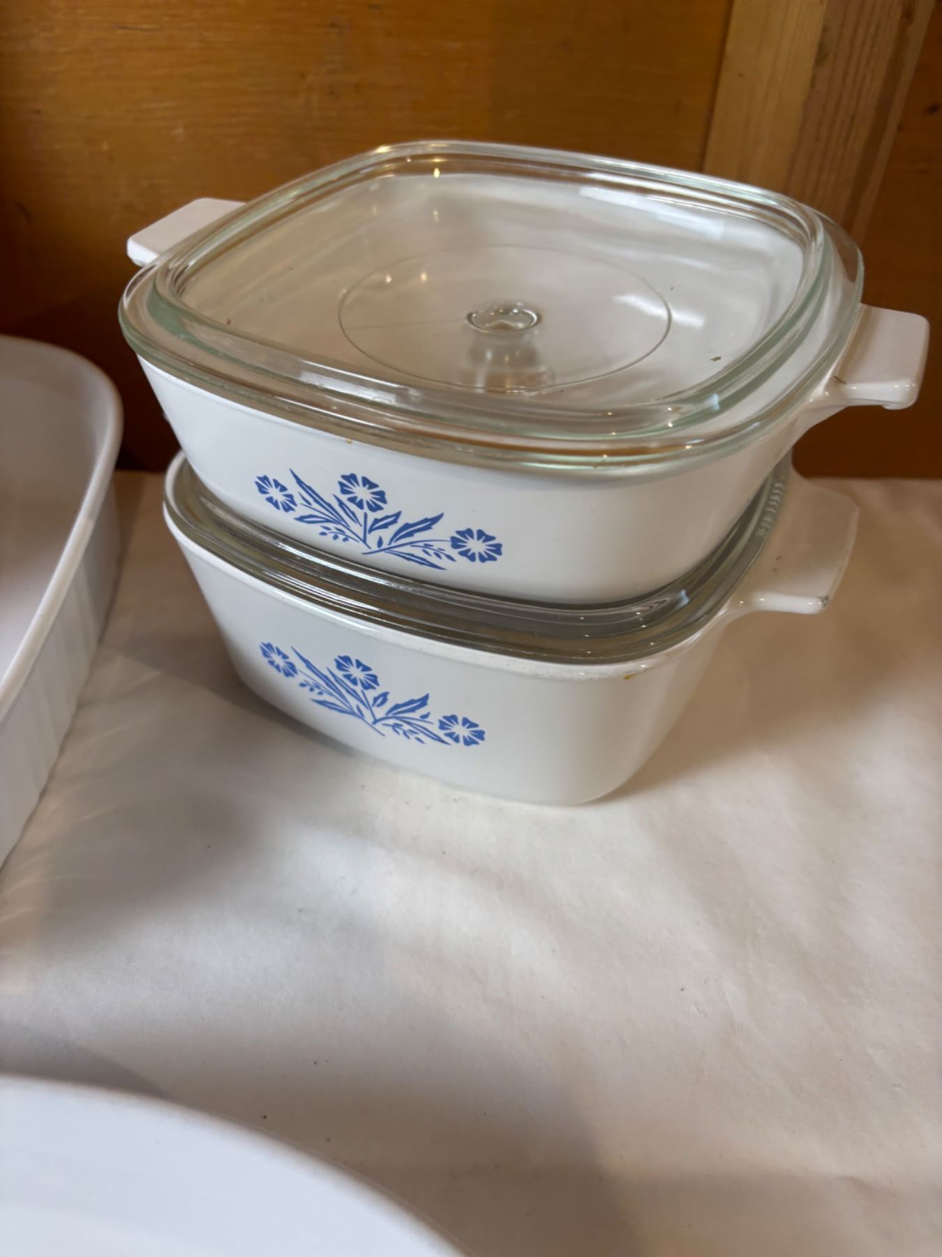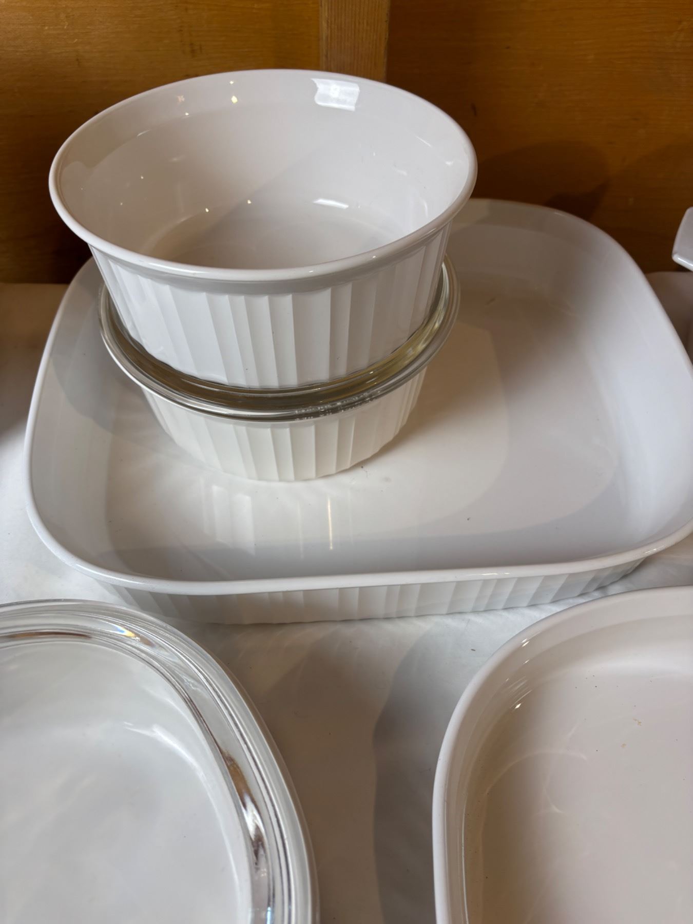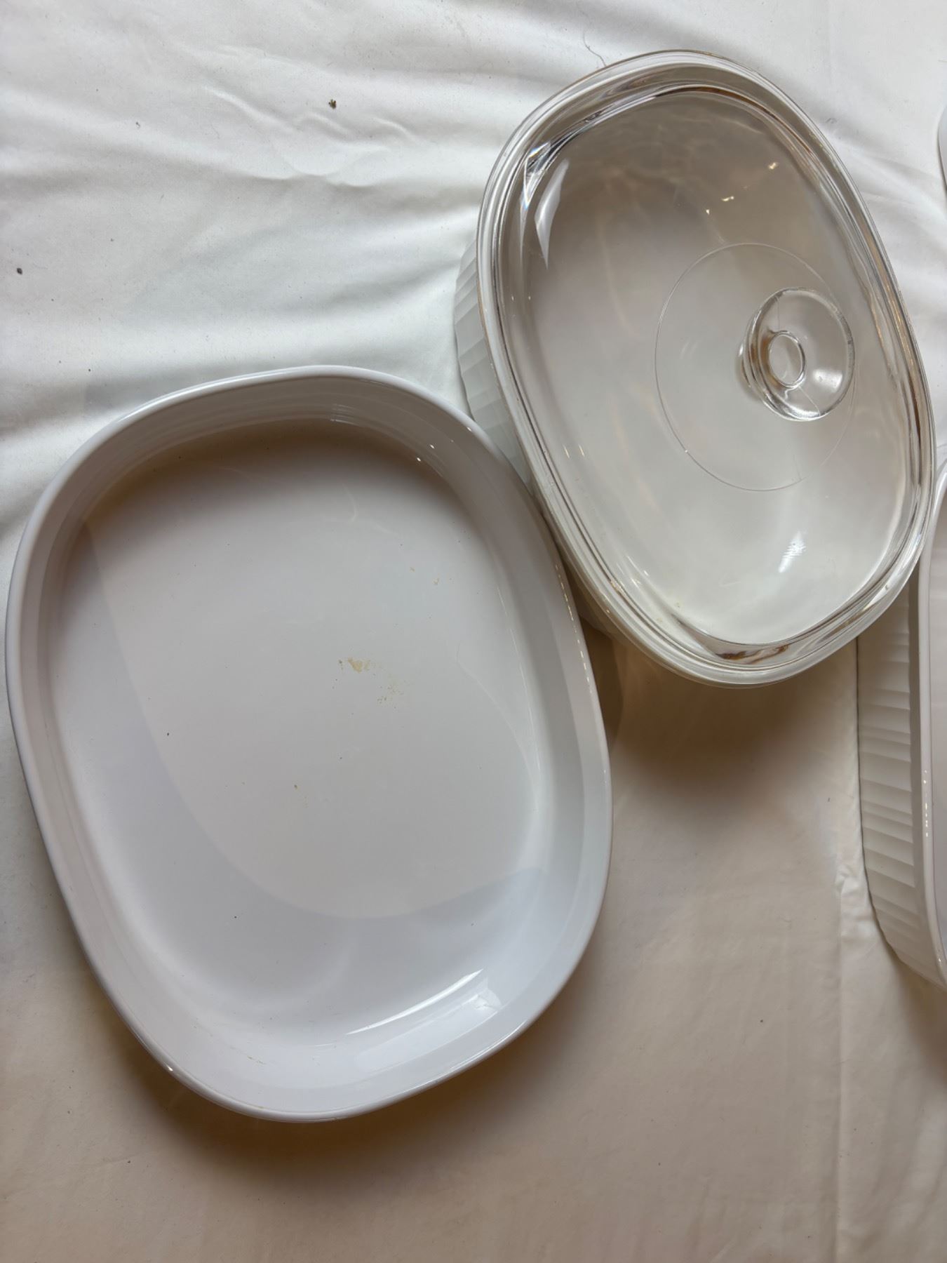 Seven of the dishes come with a lid, some wear, largest dish is 11x14"