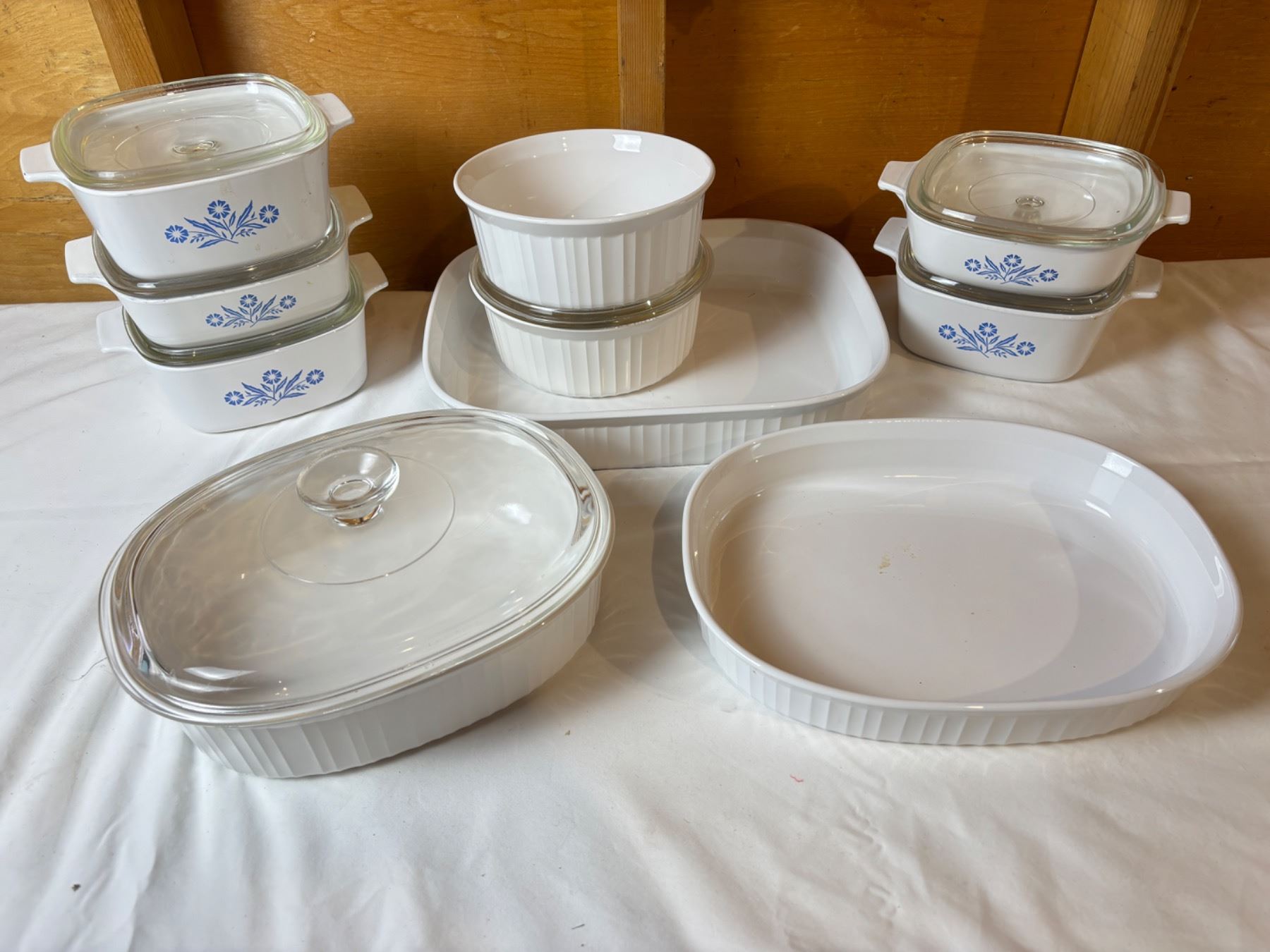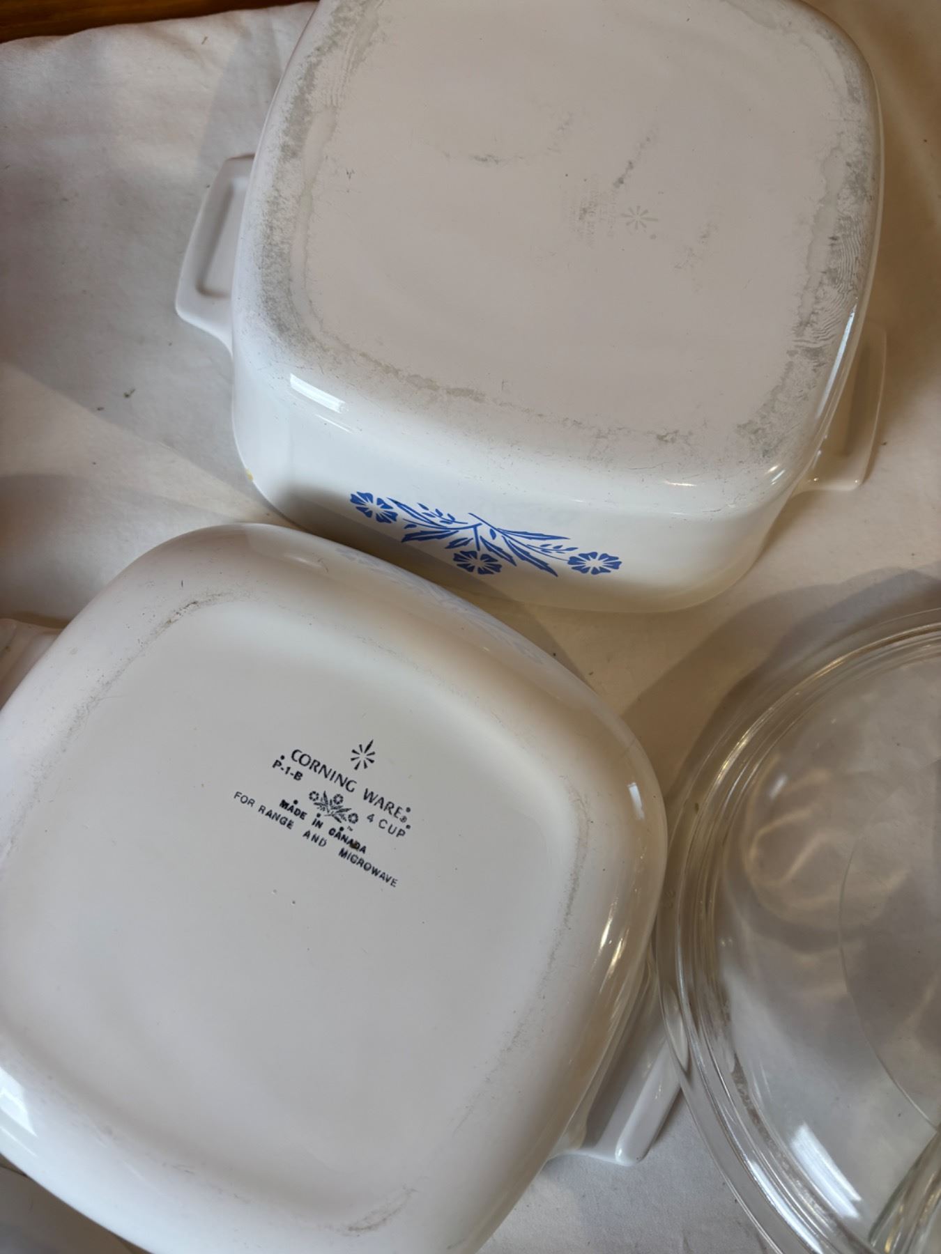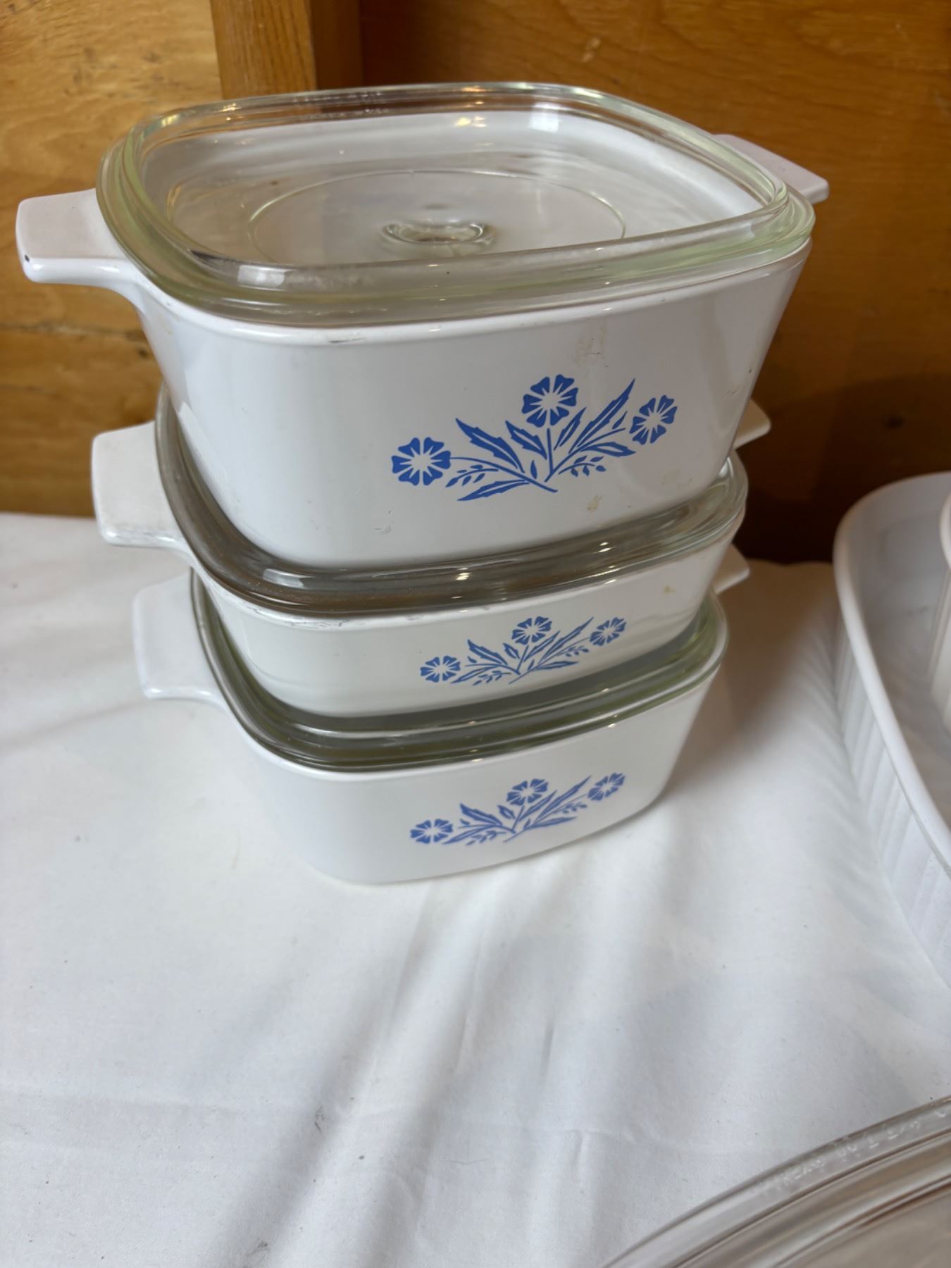 Seven of the dishes come with a lid, some wear, largest dish is 11x14"