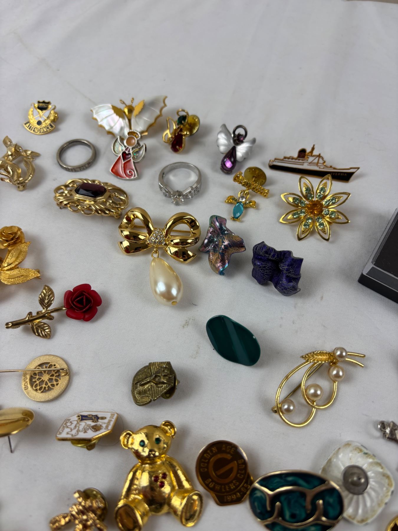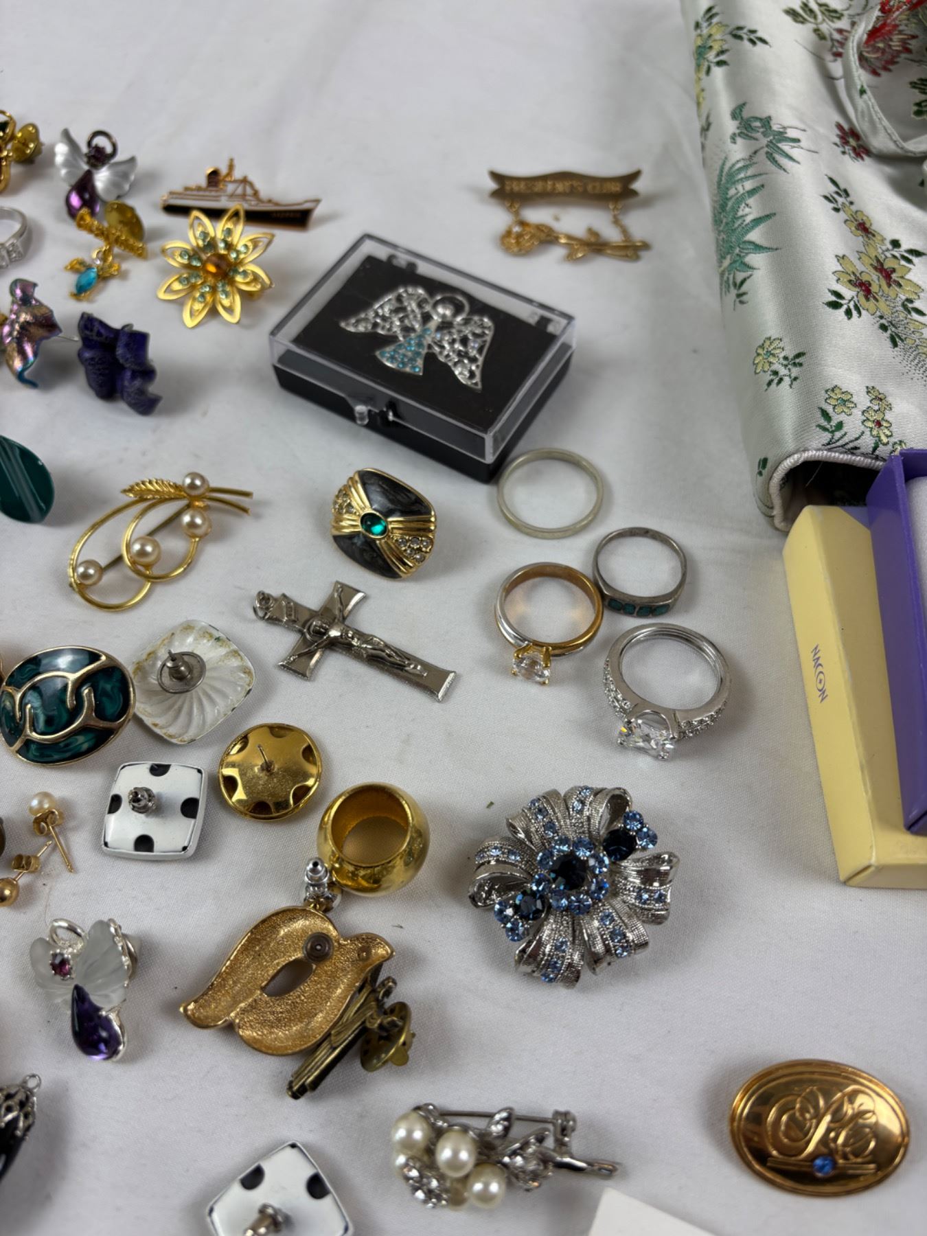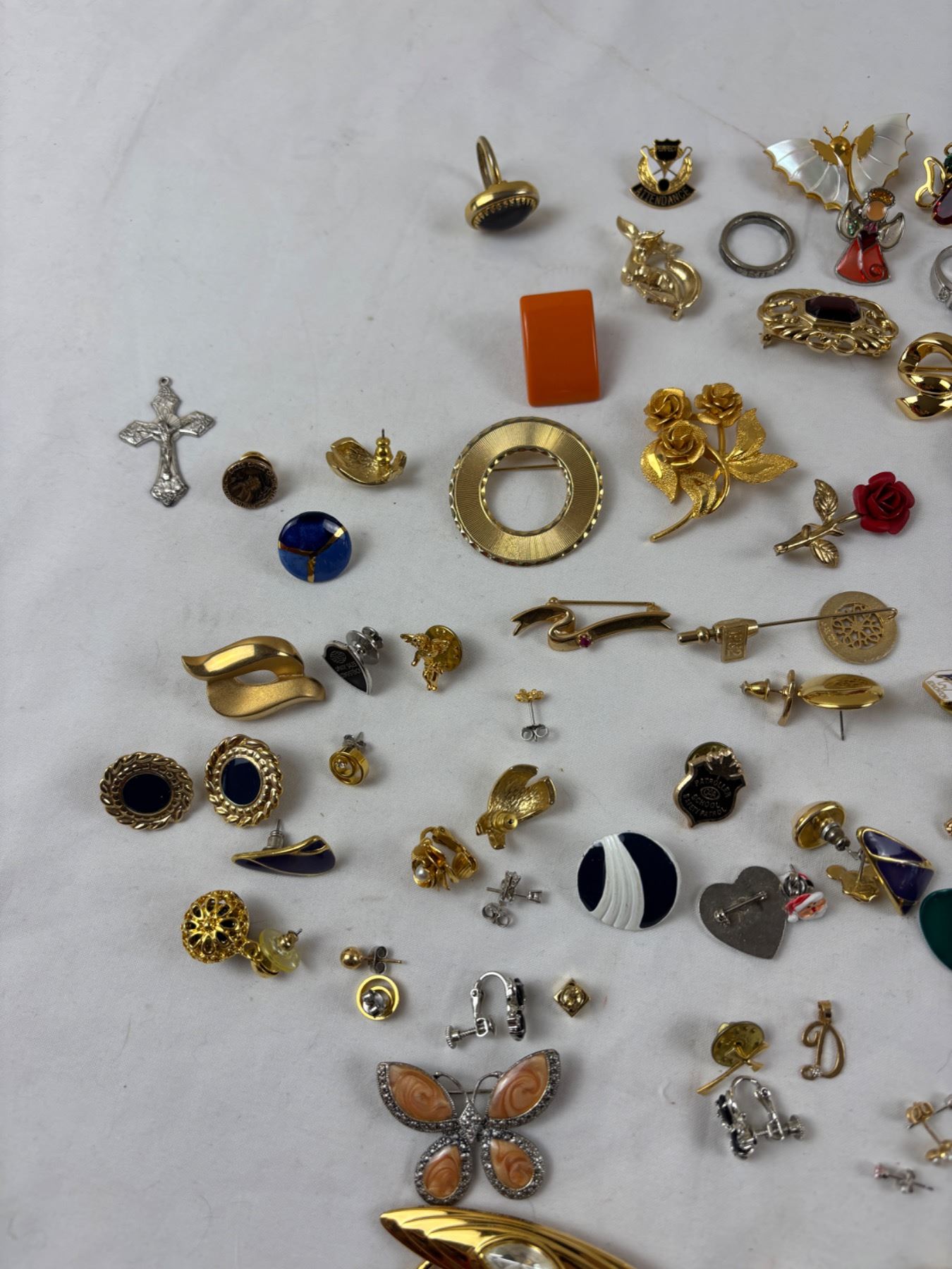 Includes an assortment of clip on and pierced earrings, brooches and pins, rings, and more