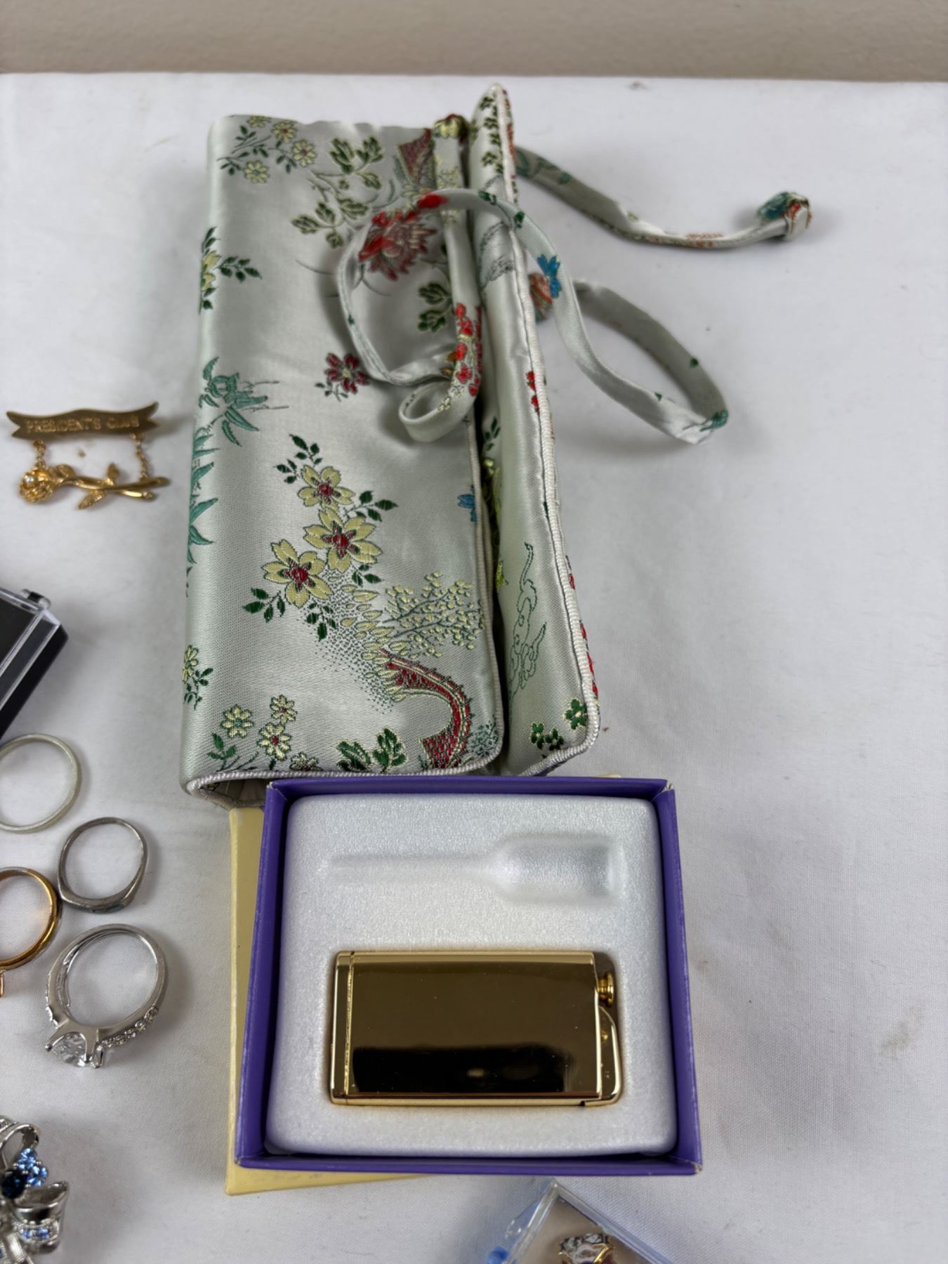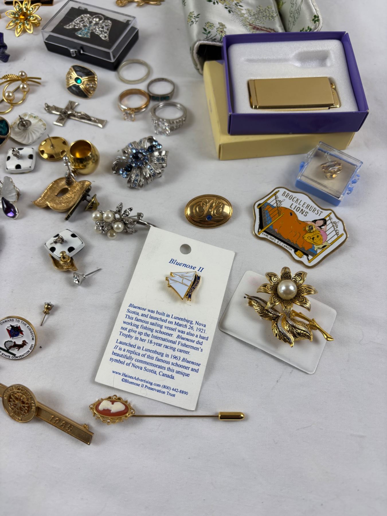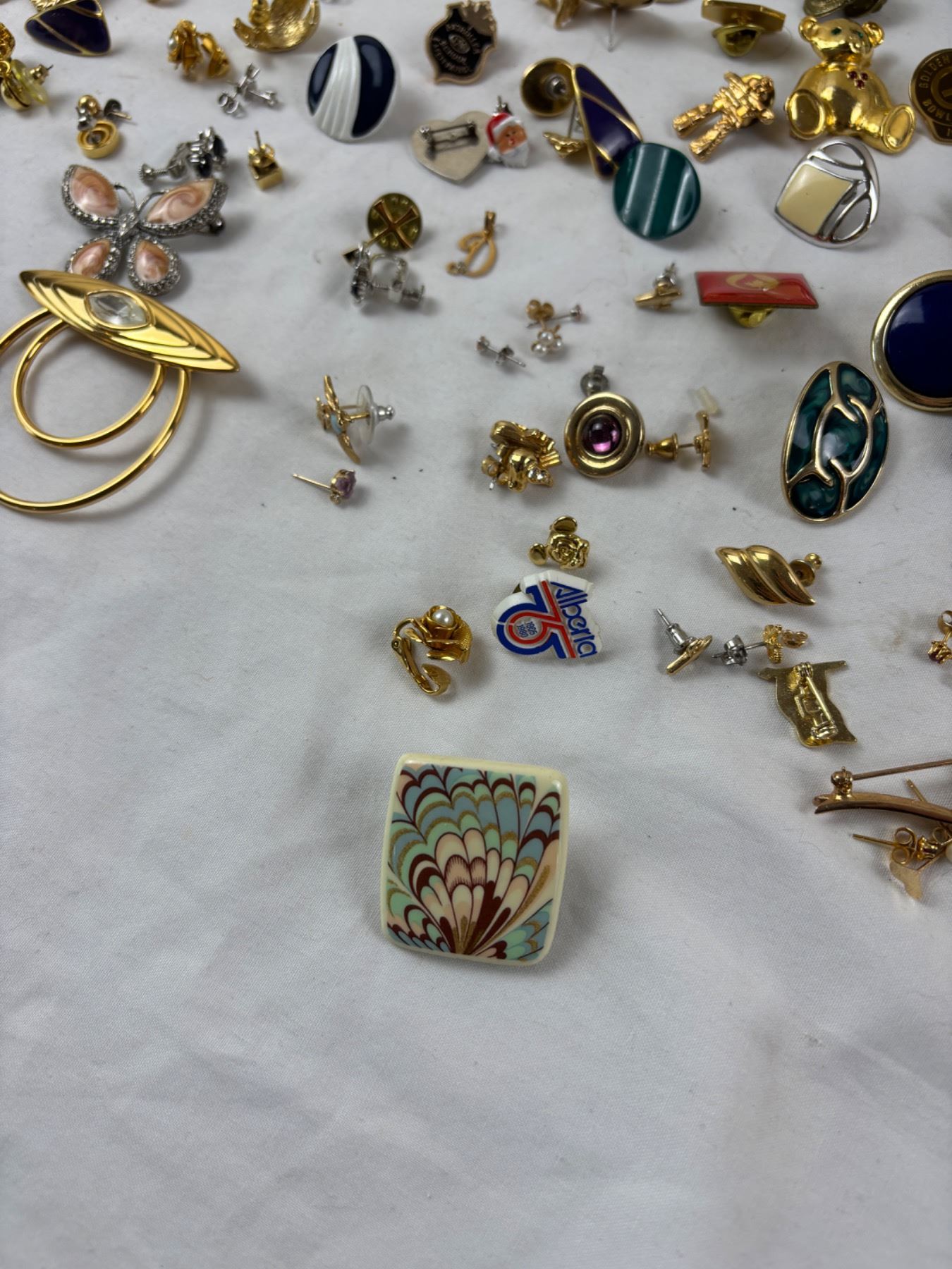 Includes an assortment of clip on and pierced earrings, brooches and pins, rings, and more