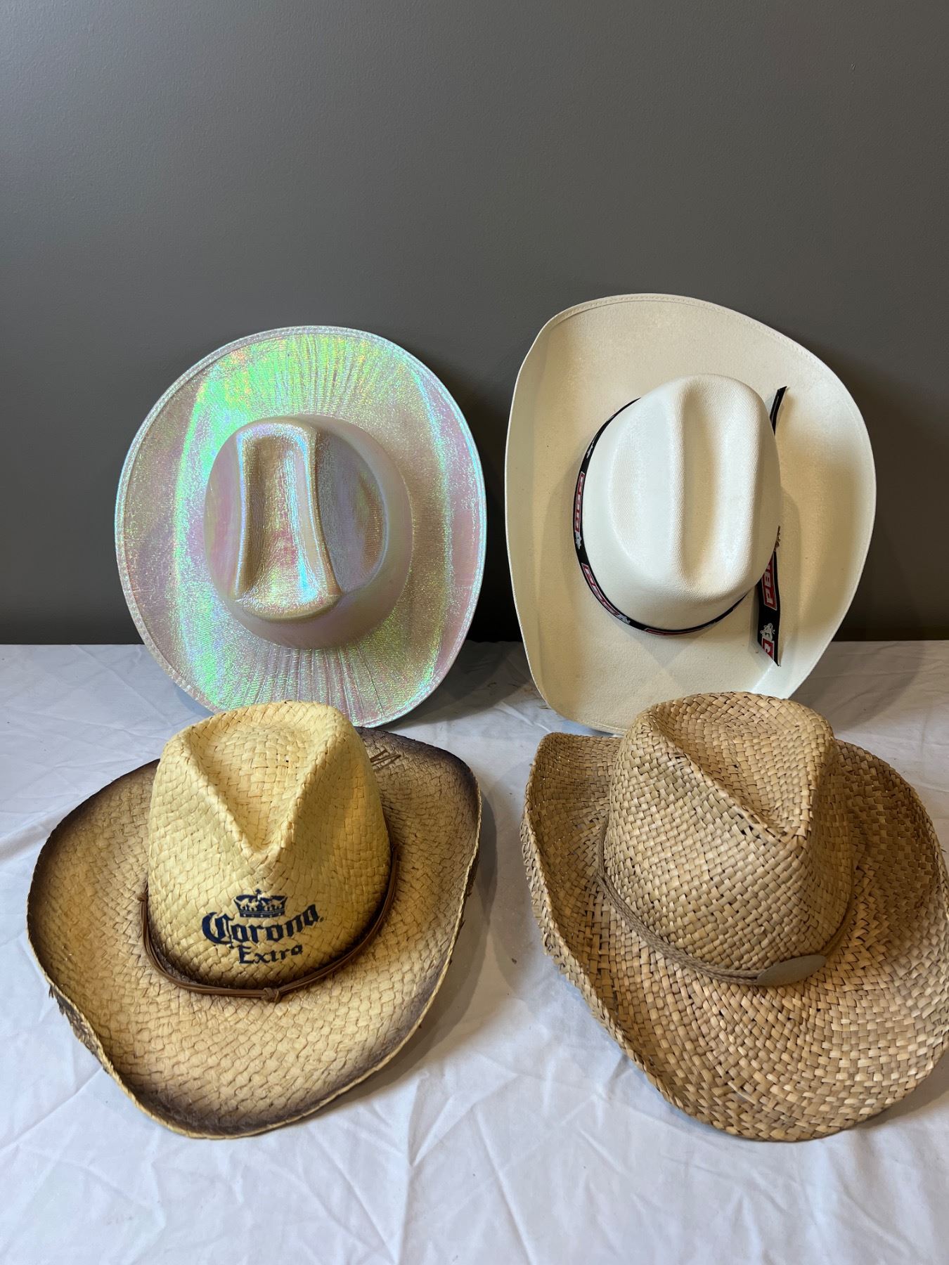 Corona hat has a good amount of wear, material is very soft. White and iridescent hat are both made of a harder material.