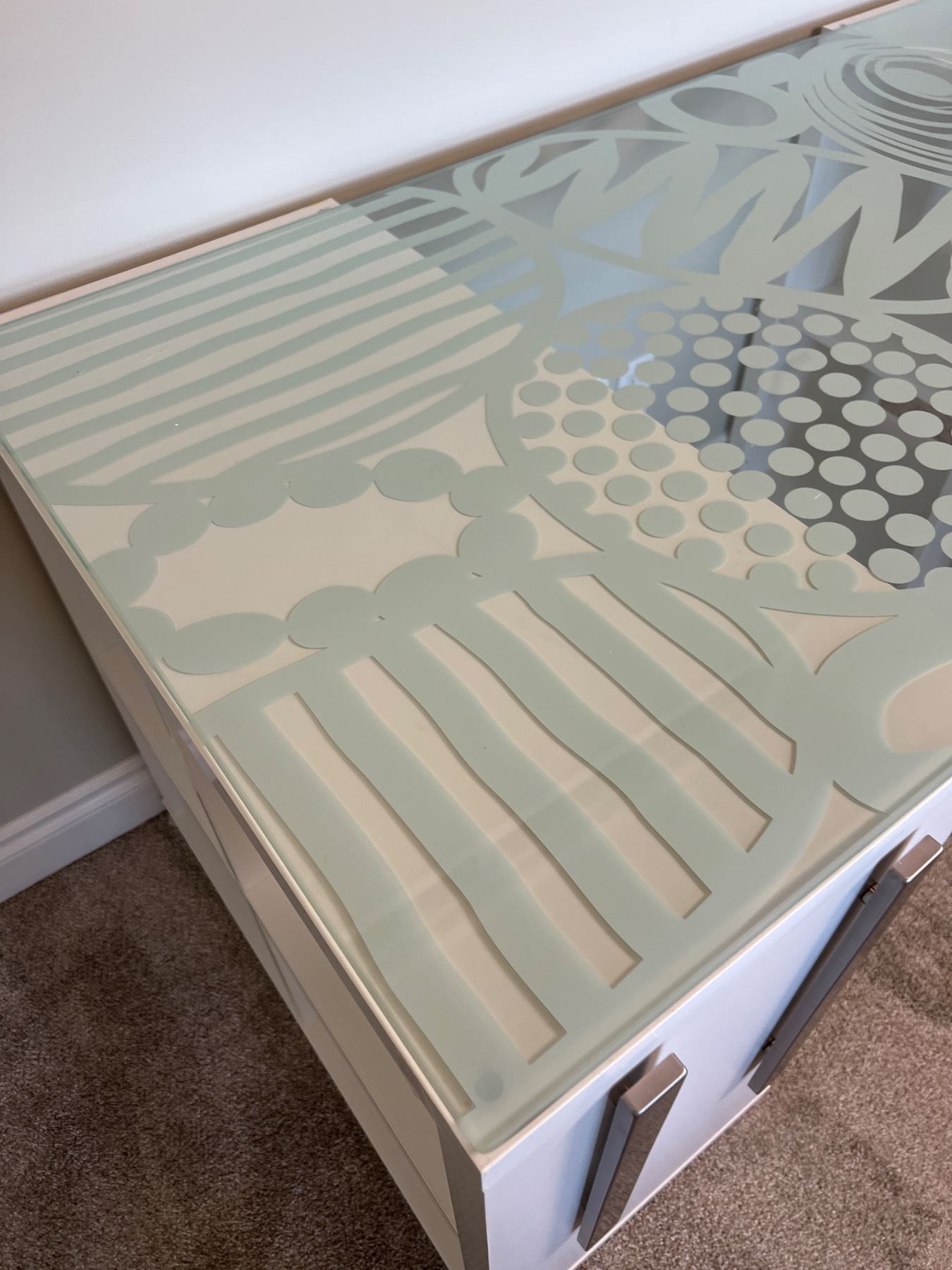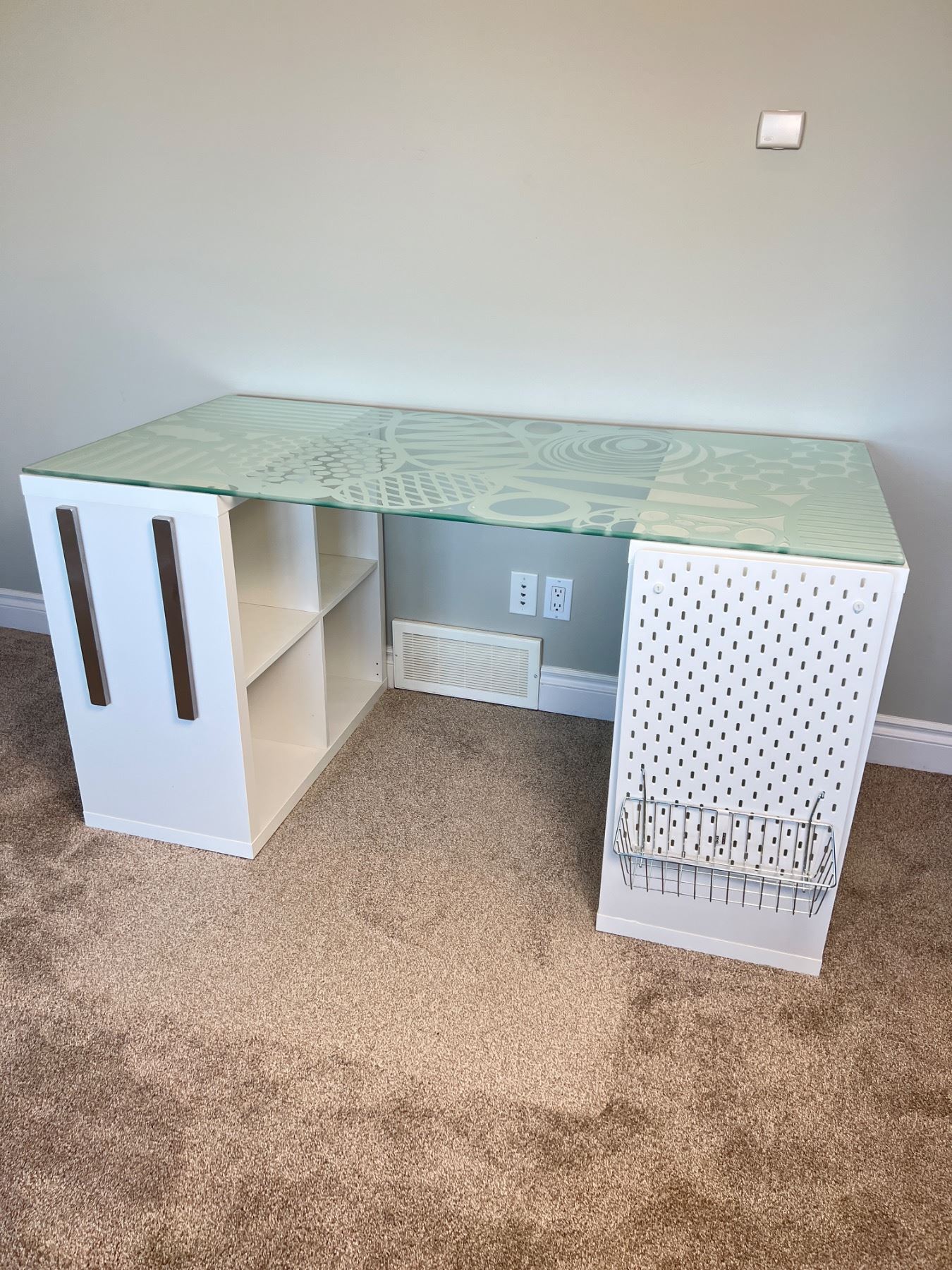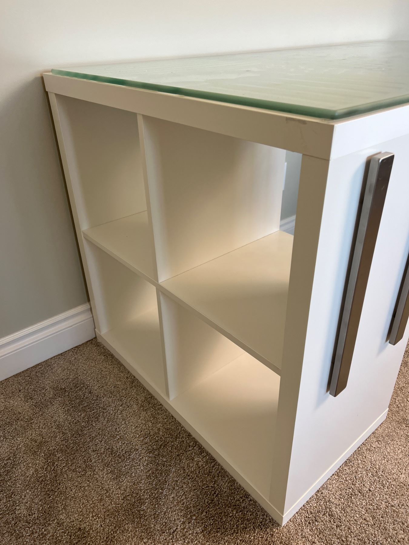 Can be taken apart into three pieces, the glass top is removable, measures 58.5"L x 31"W x 31"H