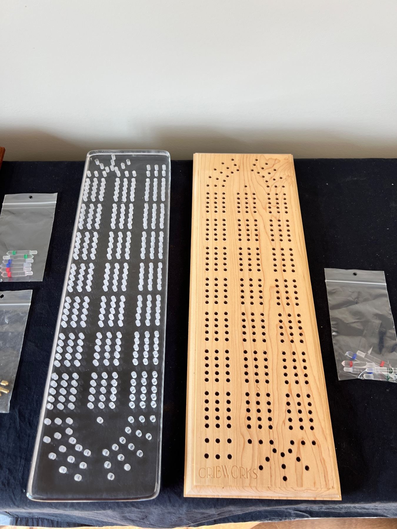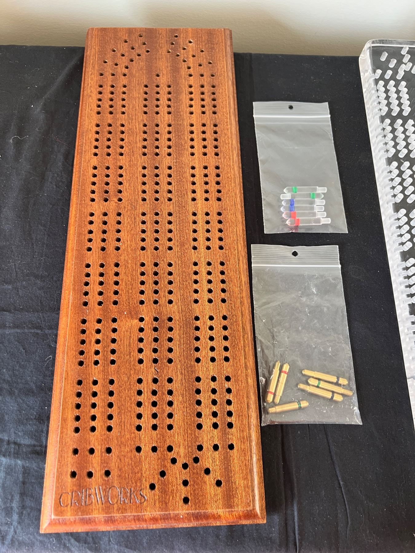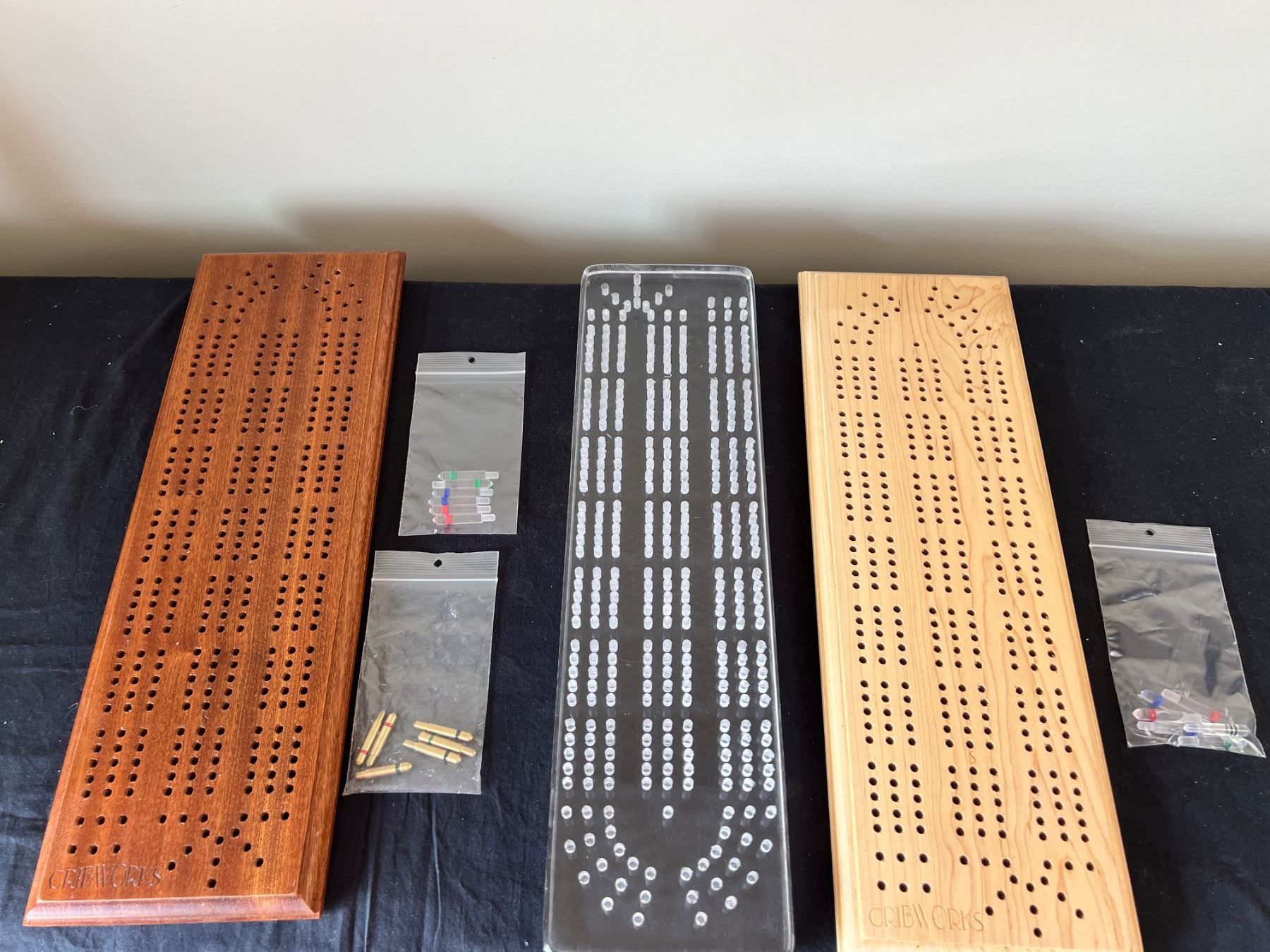3 full sets of 2 pegs for each board. Some nicks and scratches to wooden boards.