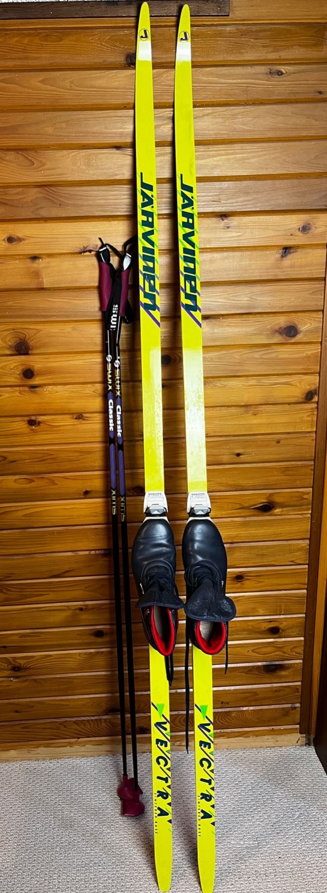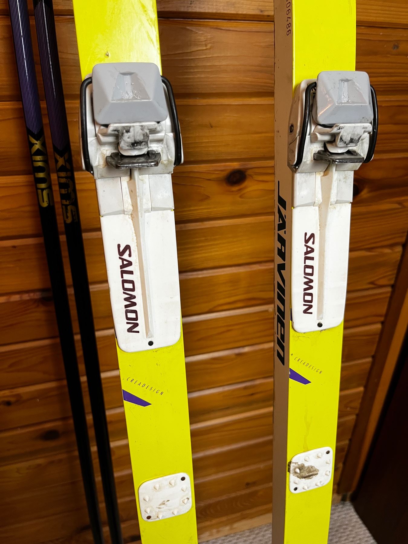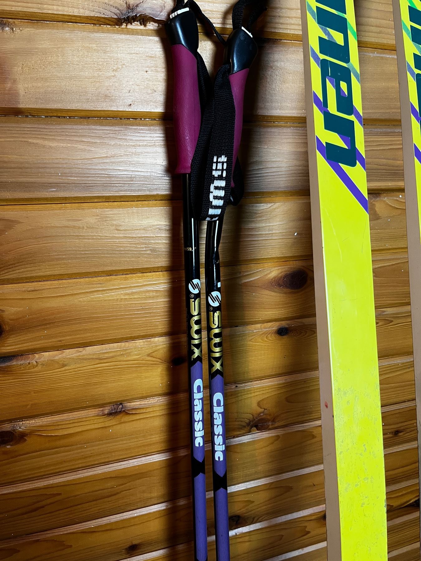 Skis with Saloman bindings 80cm long - Saloman boots size 43 - Swix Classic Poles 58" long